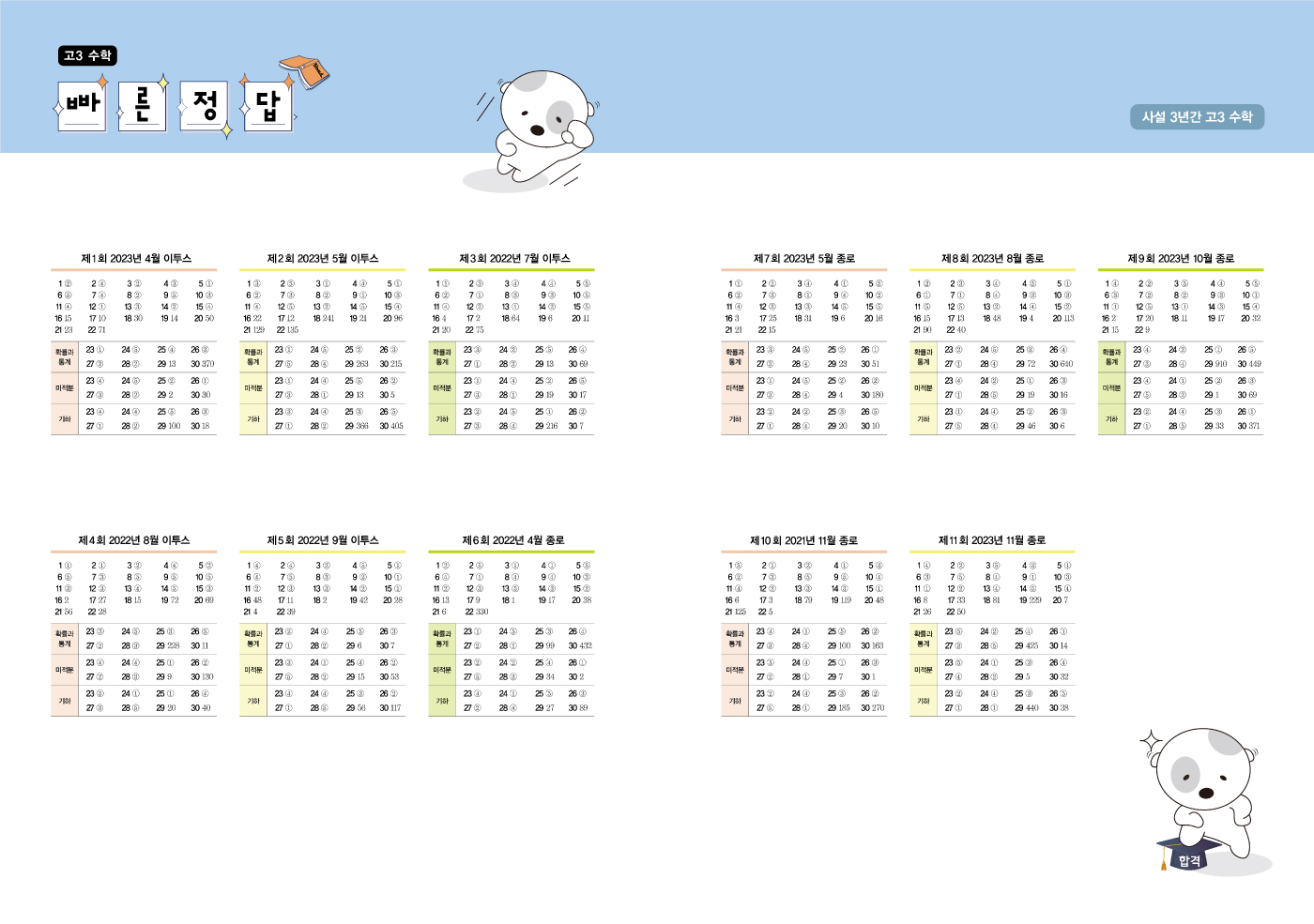 전체 모의고사의 정답만을 모아 두어 자신이 푼 회차의 빠른 채점이 가능하며, 각 시험의 등급컷을 제시하여 본인의 현재 위치를 알 수 있도록 했습니다.