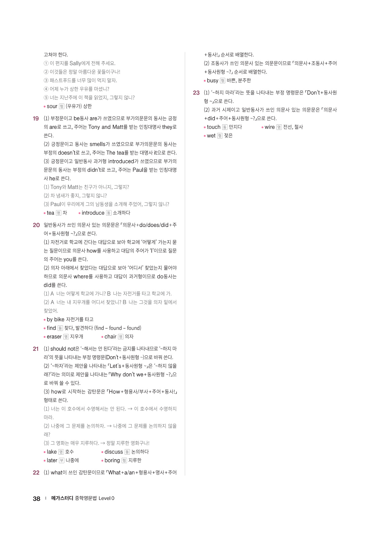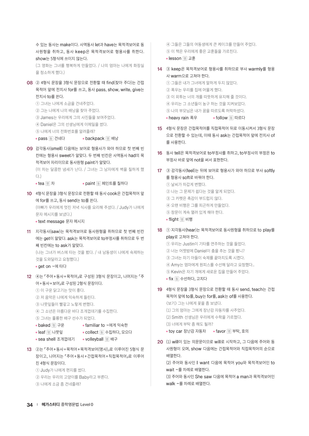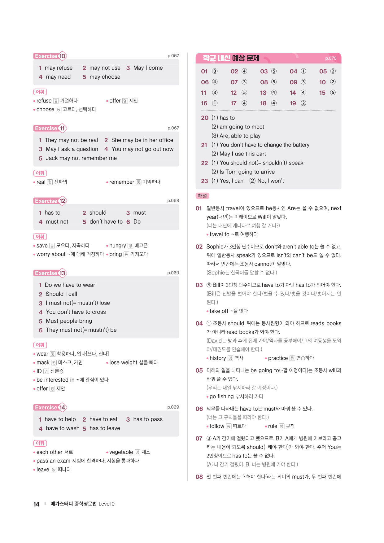 중학 필수 문법 개념을 쉬운 예문들로 학습할 수 있도록 하였고, 추가설명이 필요한 내용은 TIP으로 제시하였습니다. 충분히 제공되는 Exercise 문제들로 핵심적인 문법 사항들을 확실하게 다질 수 있습니다.