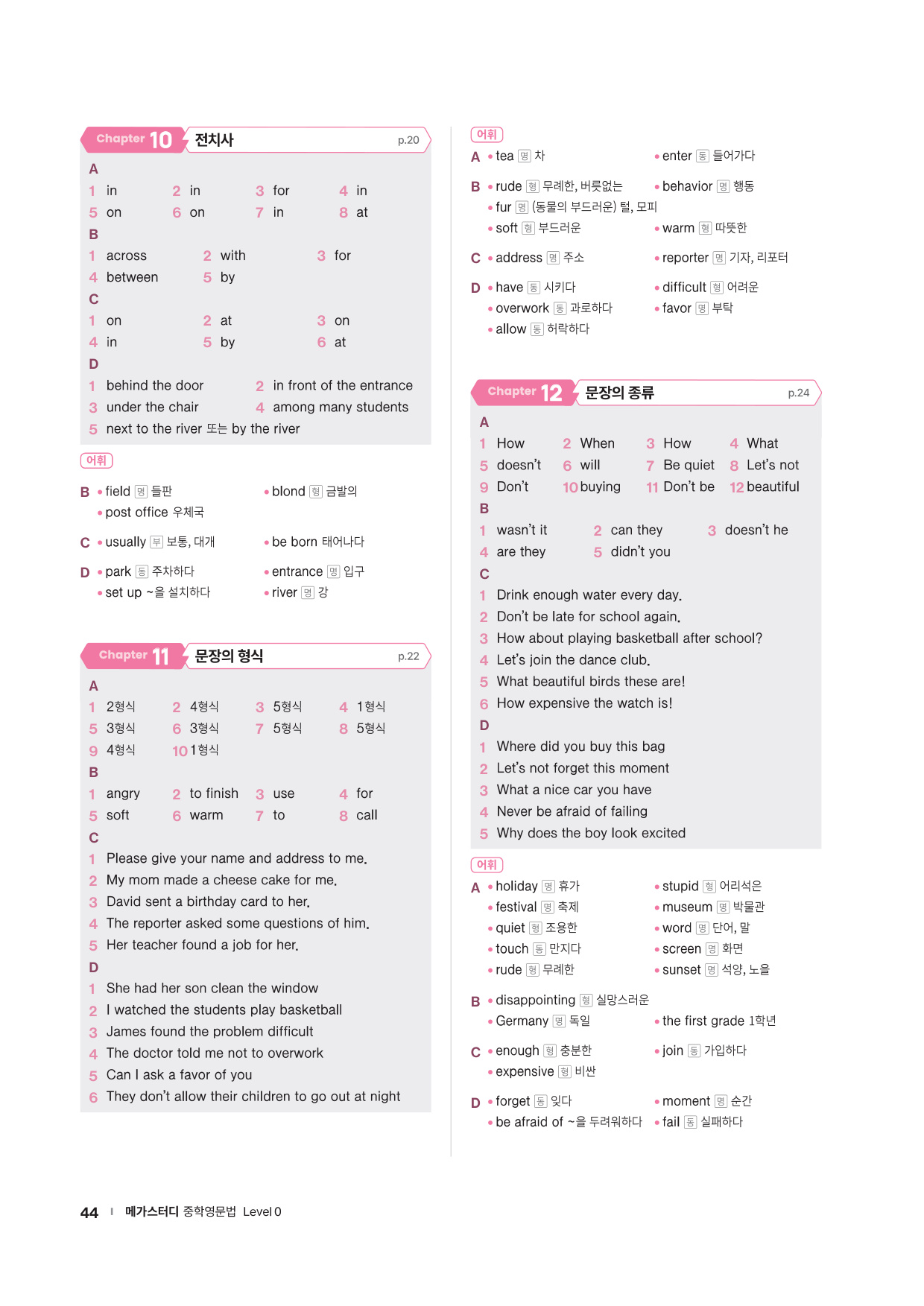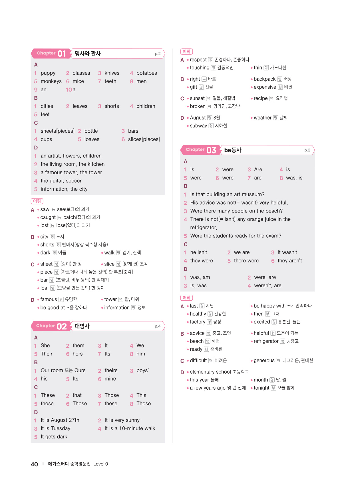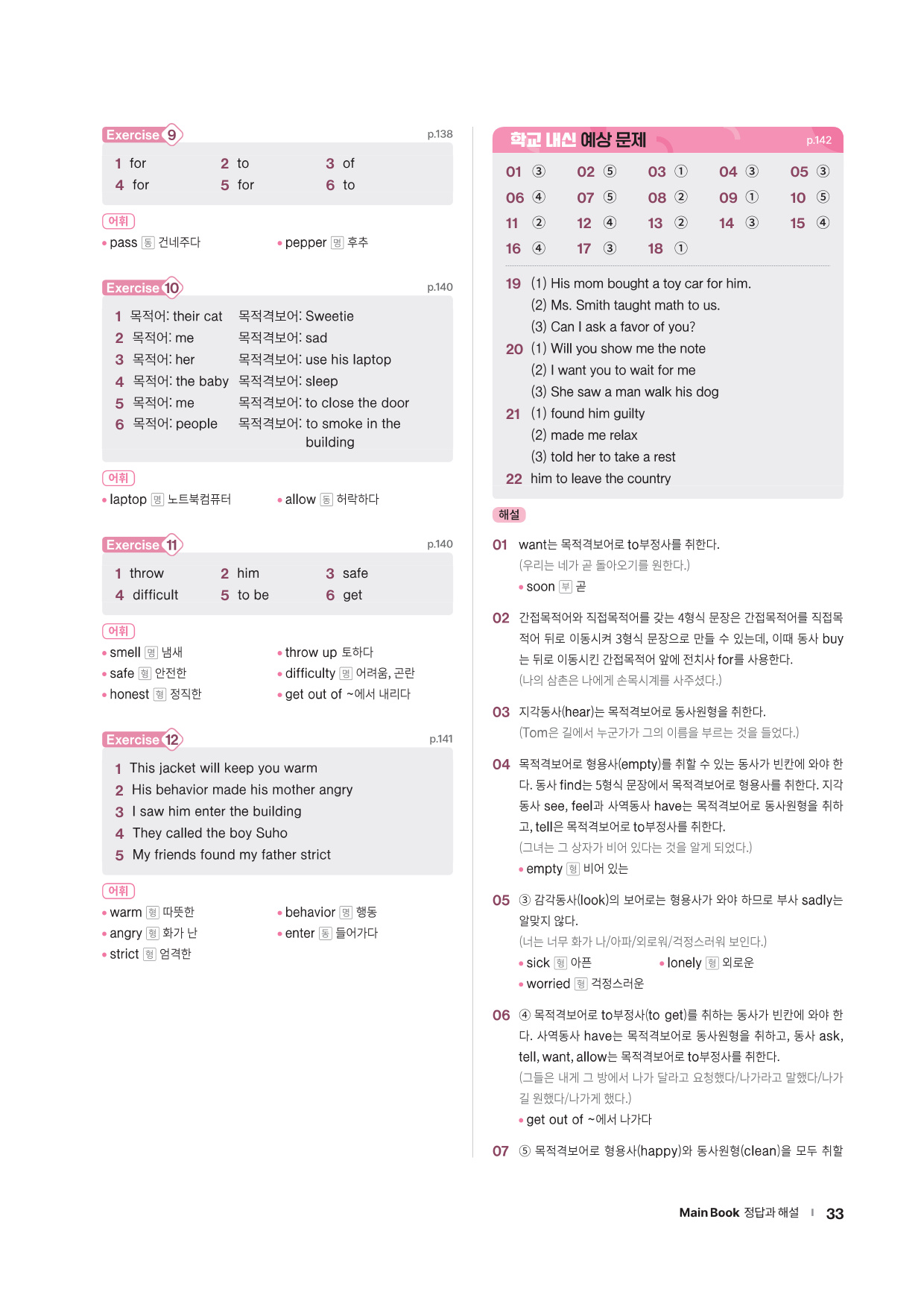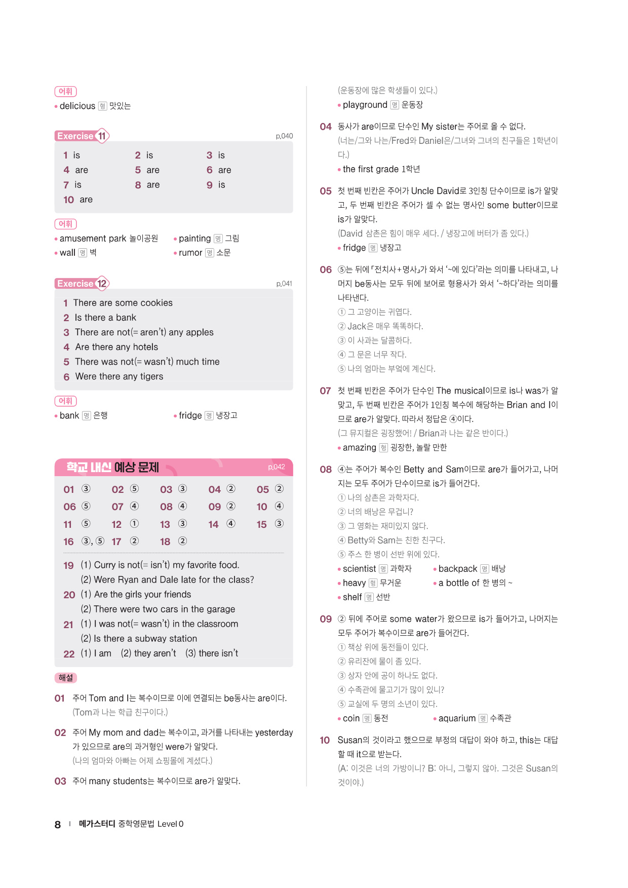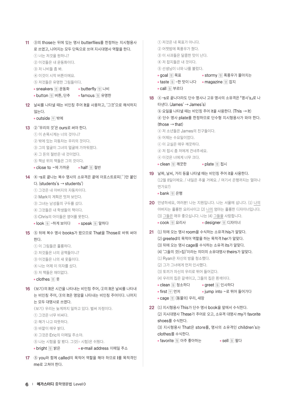 · Chapter Test - 각 챕터에서 학습한 문법 개념을 탄탄히 해 줄 추가 문제들을 제공합니다. 문법 확인 문제, 틀린 것 고치기, 문장 배열하기 유형의 문제들을 통해 학습한 문법을 복습합니다.