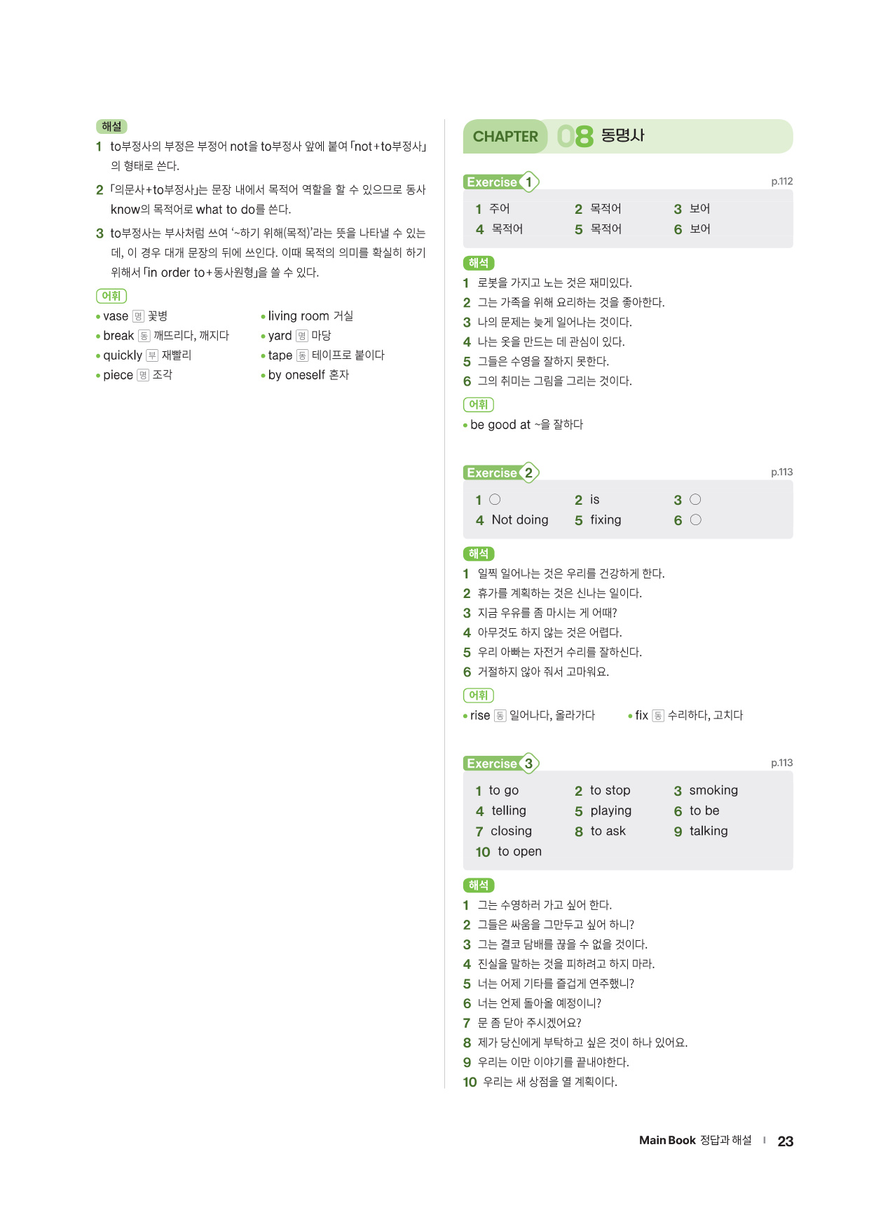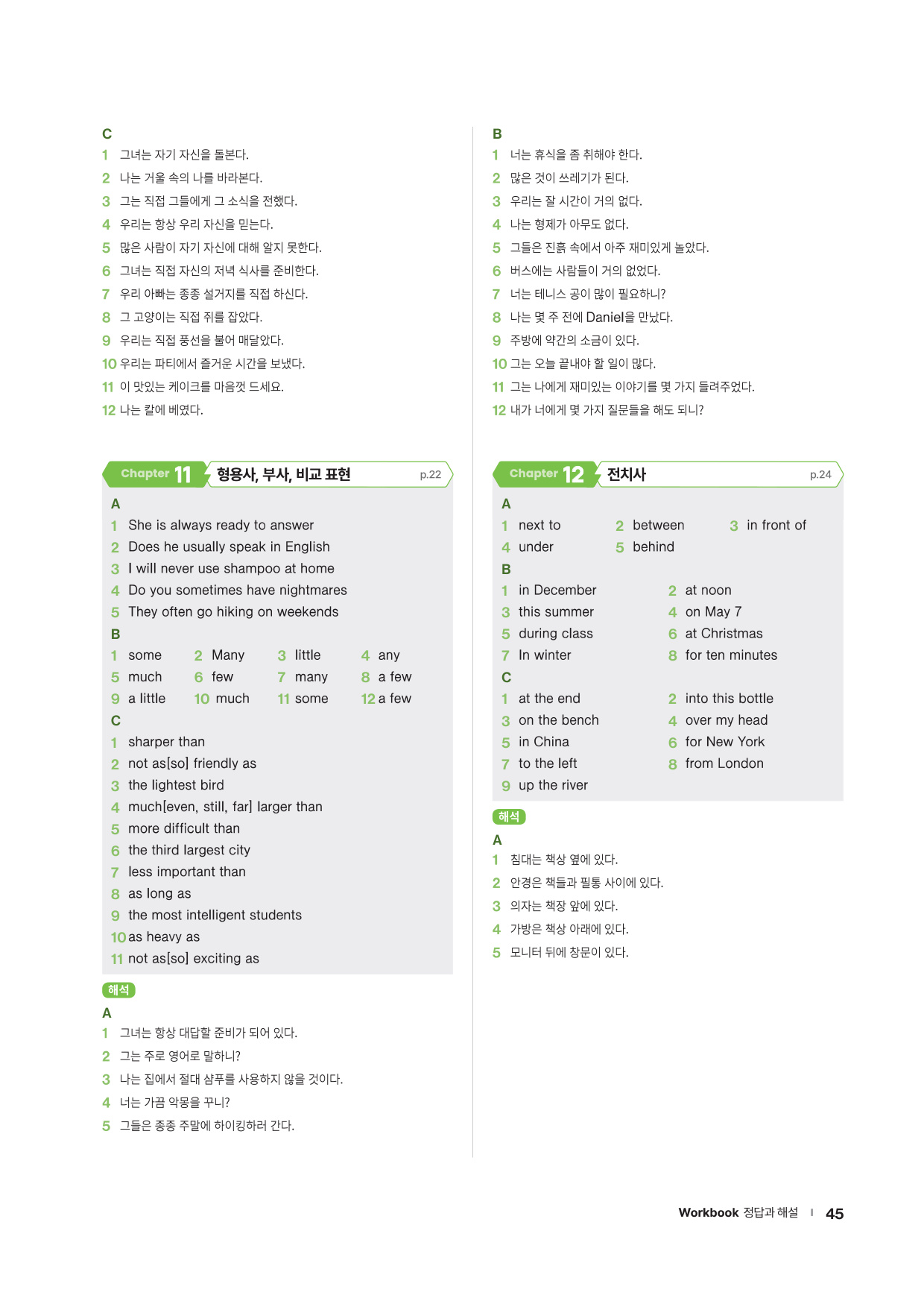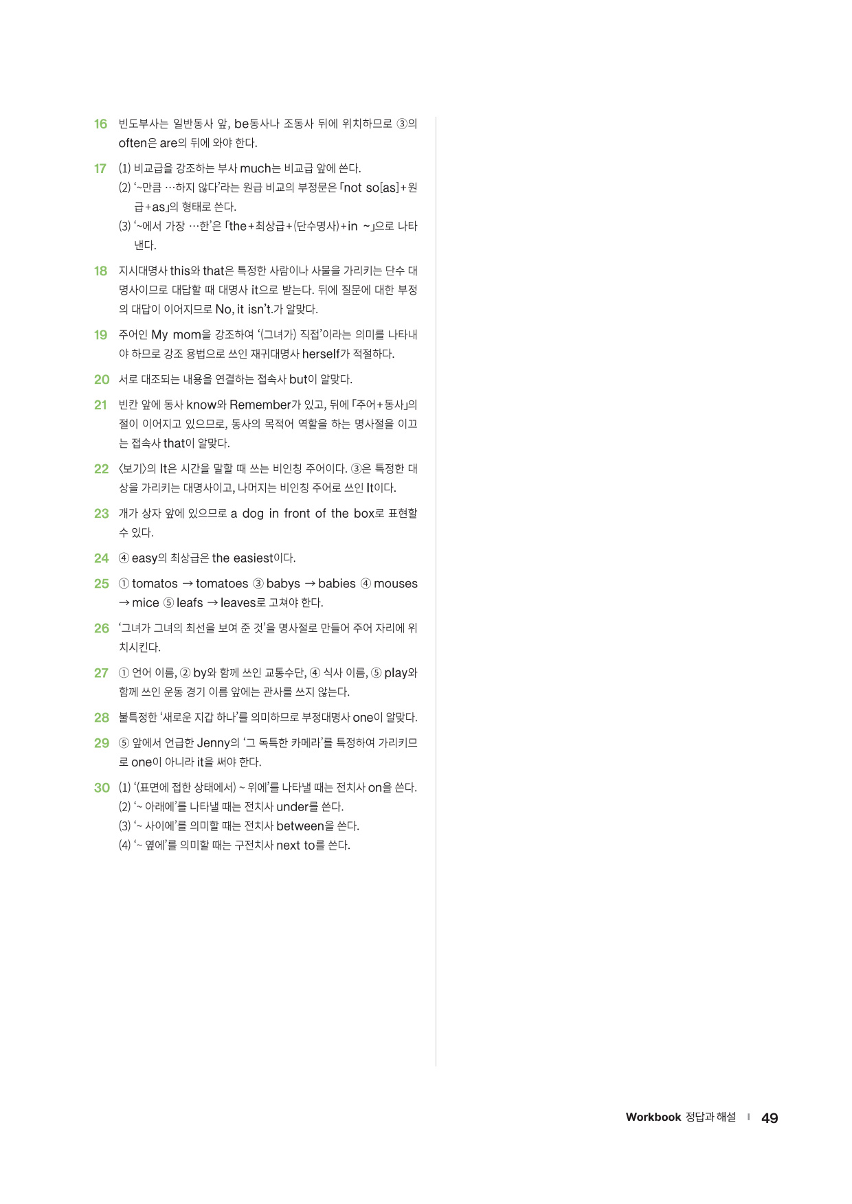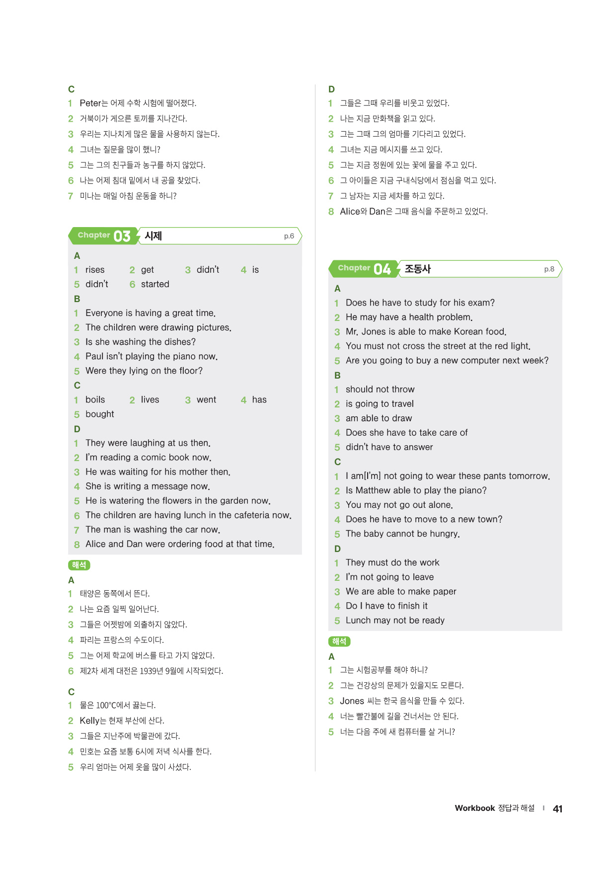 · Chapter Test - 각 챕터에서 학습한 문법 실력을 탄탄히 해 줄 추가 문제들을 제공합니다. 문법 확인 문제, 틀린 것 고치기, 문장 배열하기 유형의 문제들을 통해 학습한 문법을 복습합니다.