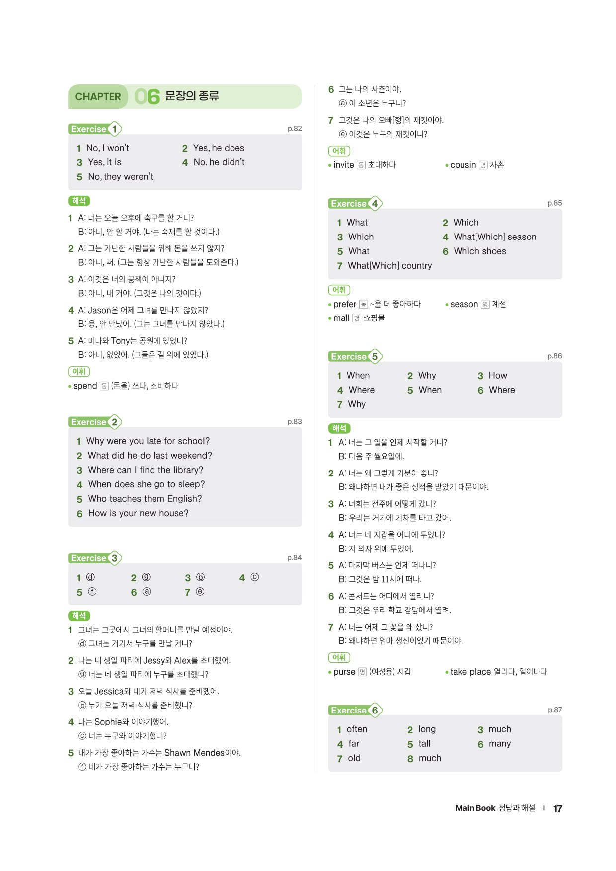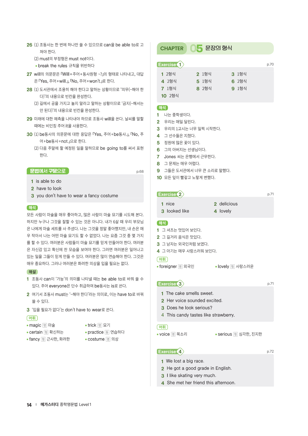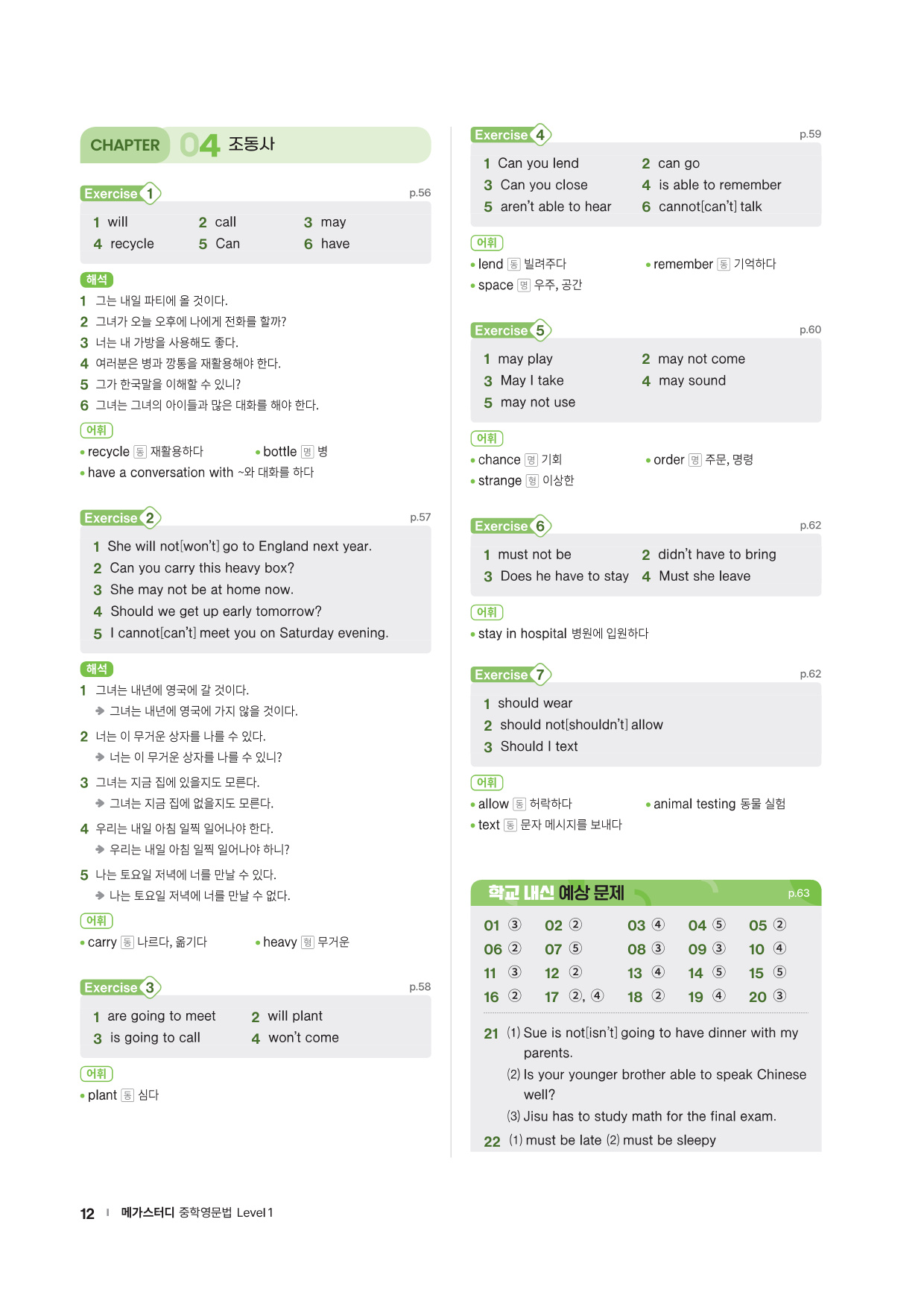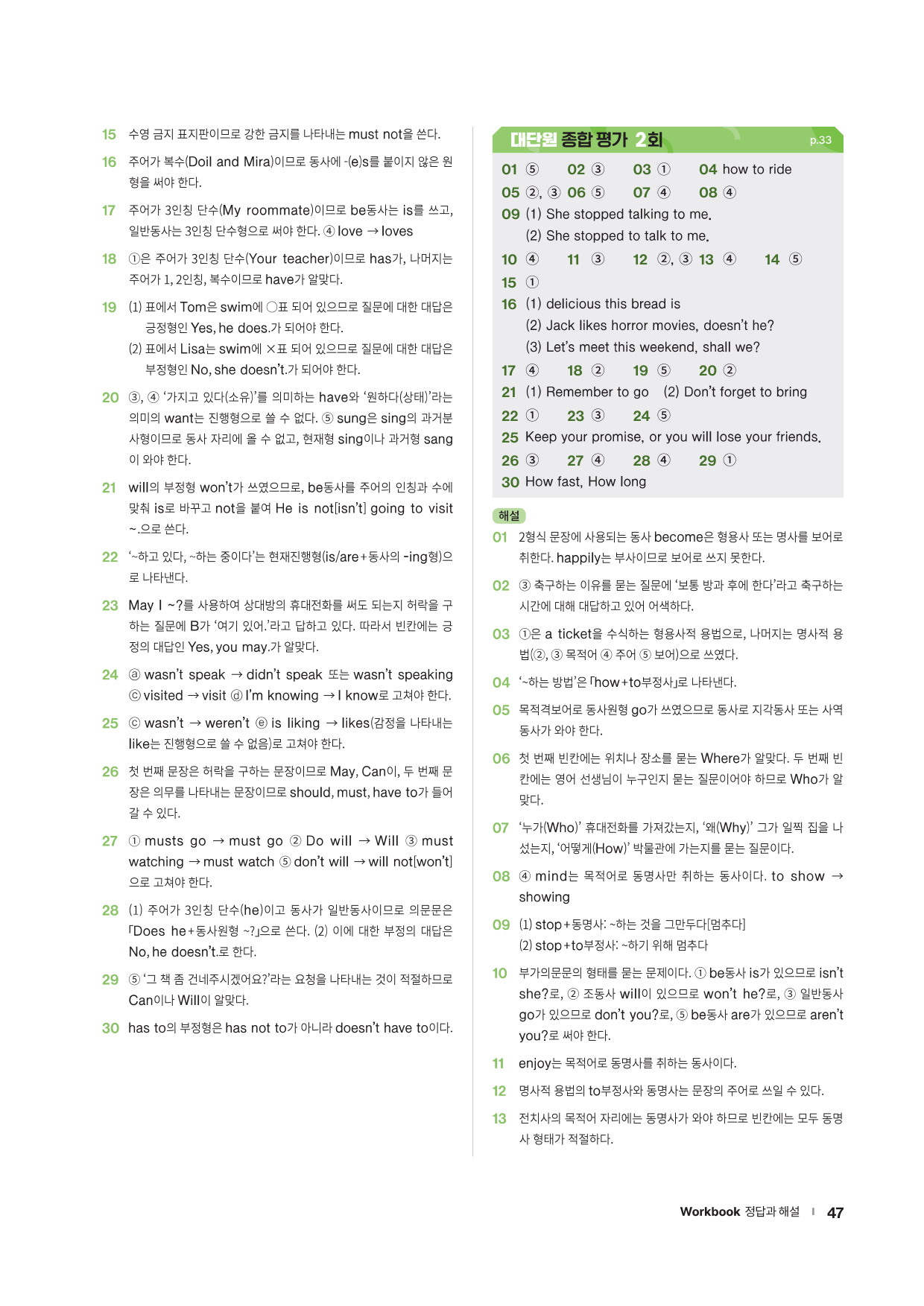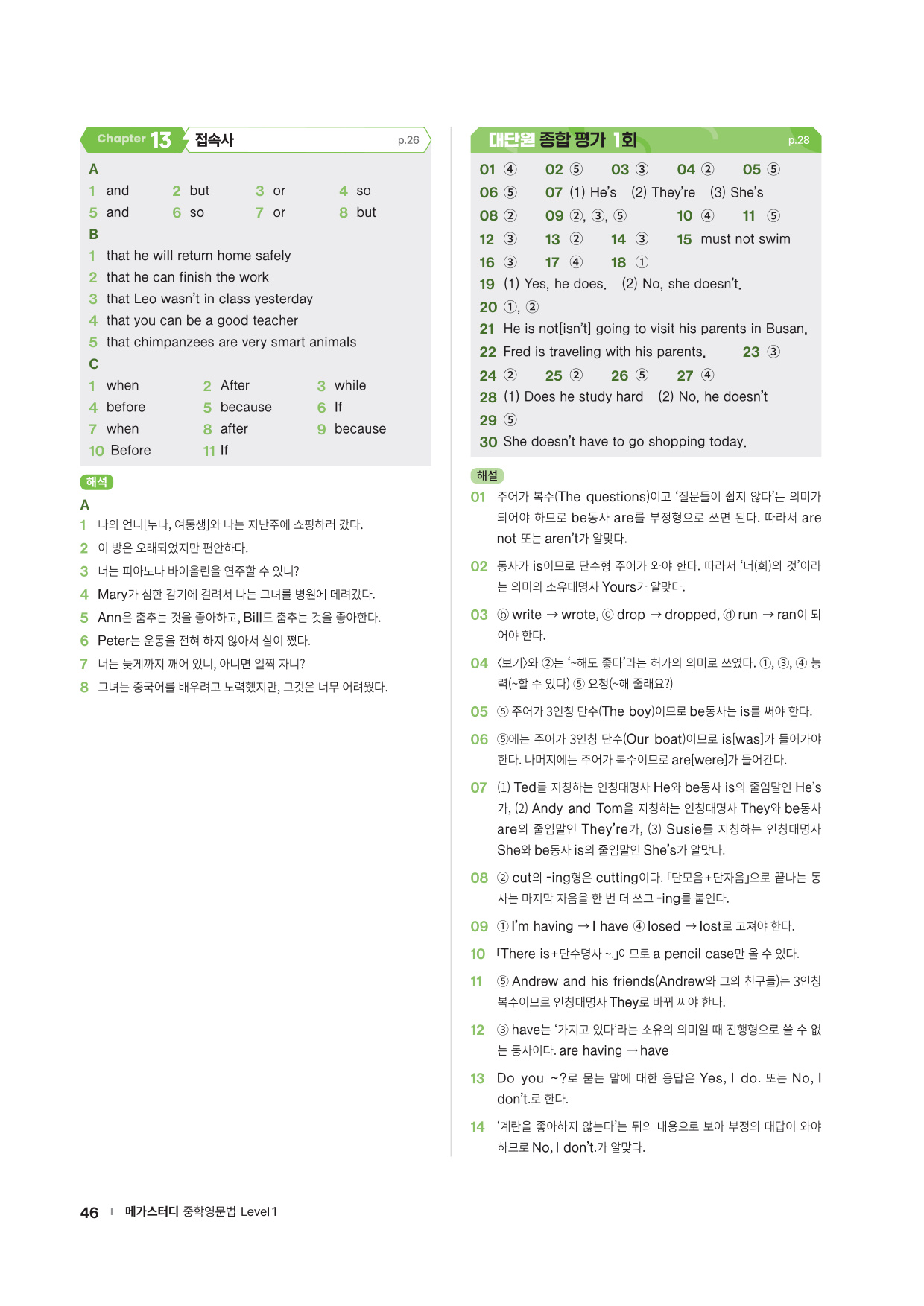 · Chapter Test - 각 챕터에서 학습한 문법 실력을 탄탄히 해 줄 추가 문제들을 제공합니다. 문법 확인 문제, 틀린 것 고치기, 문장 배열하기 유형의 문제들을 통해 학습한 문법을 복습합니다.