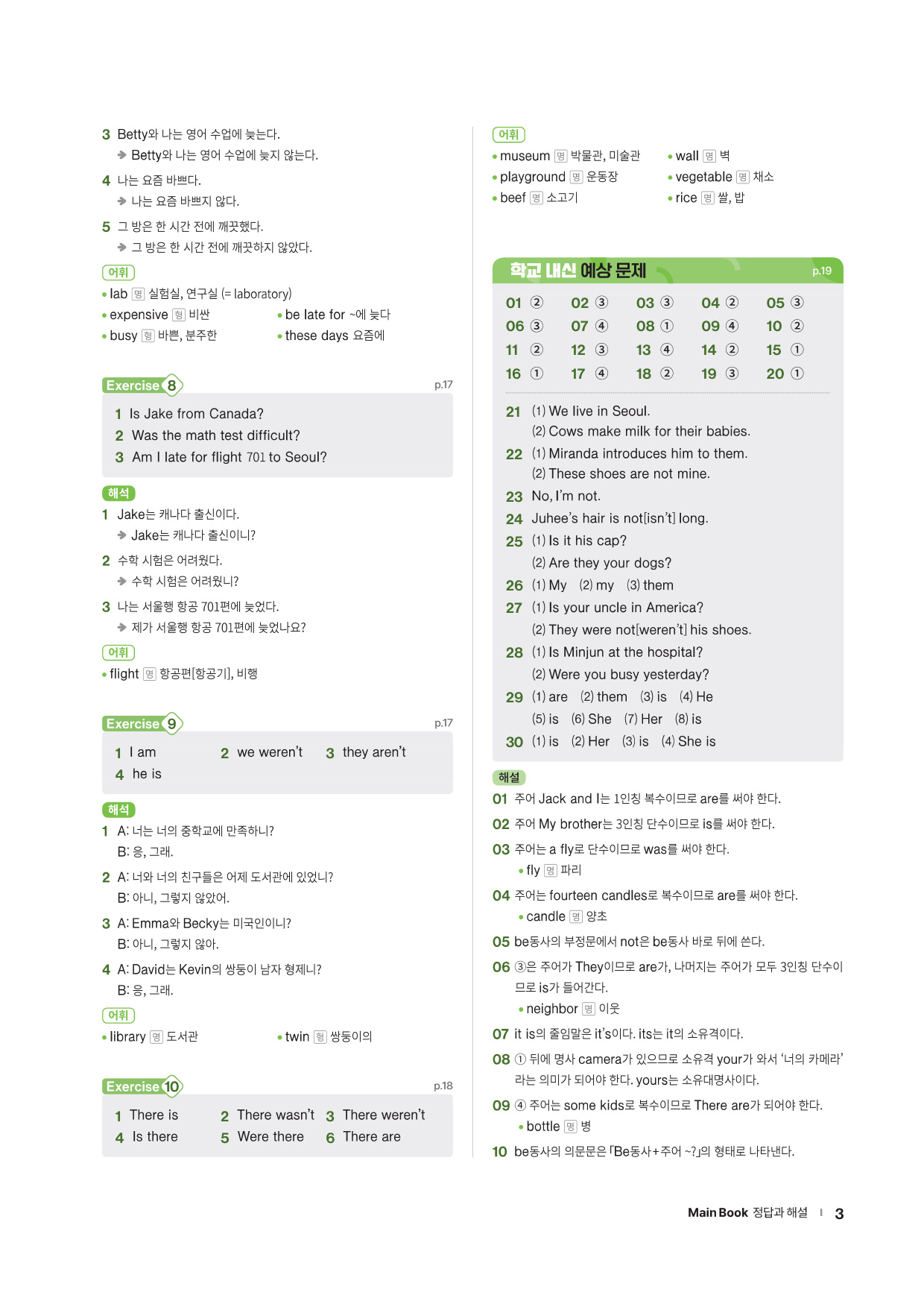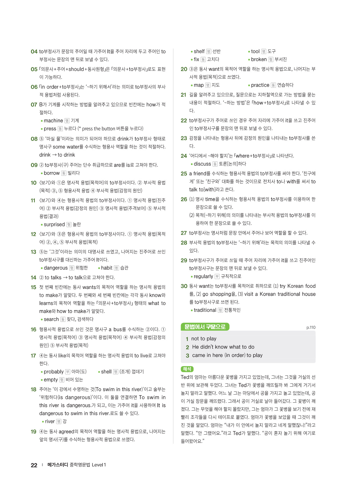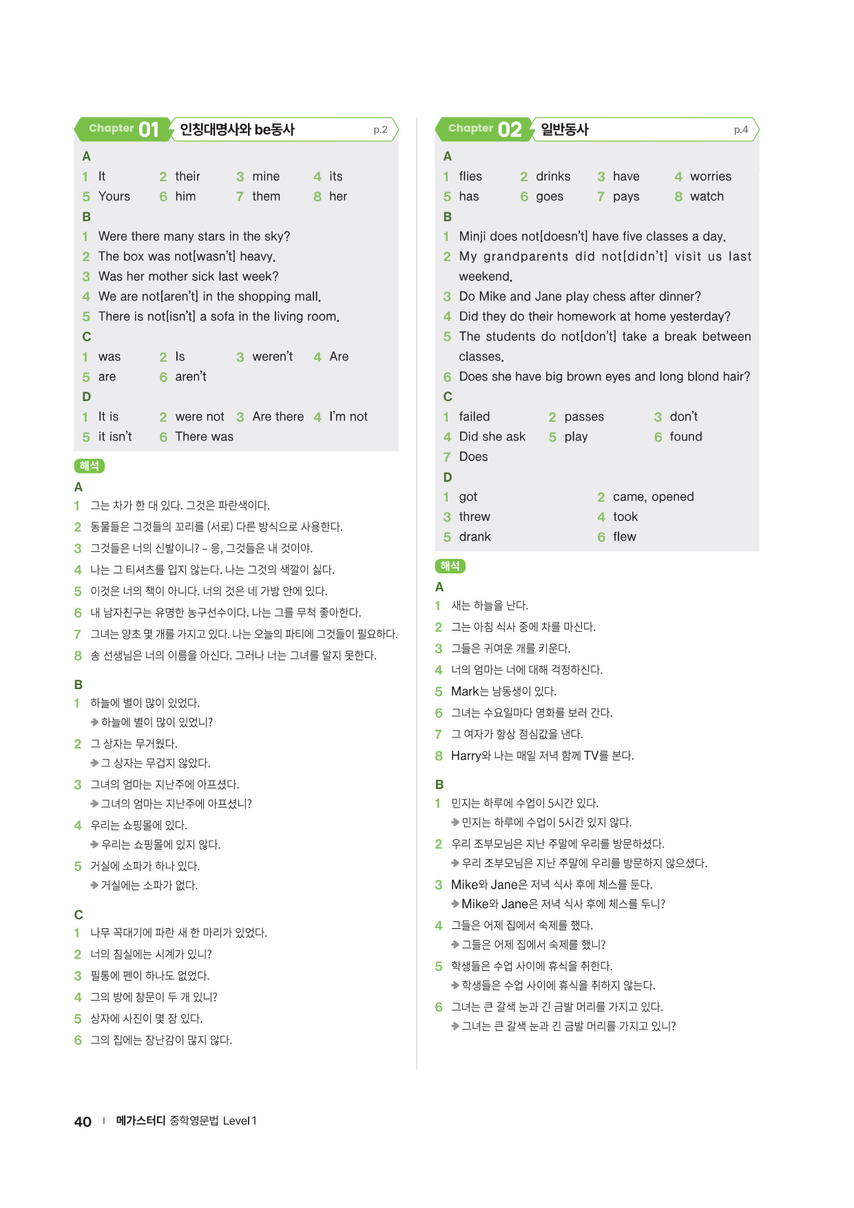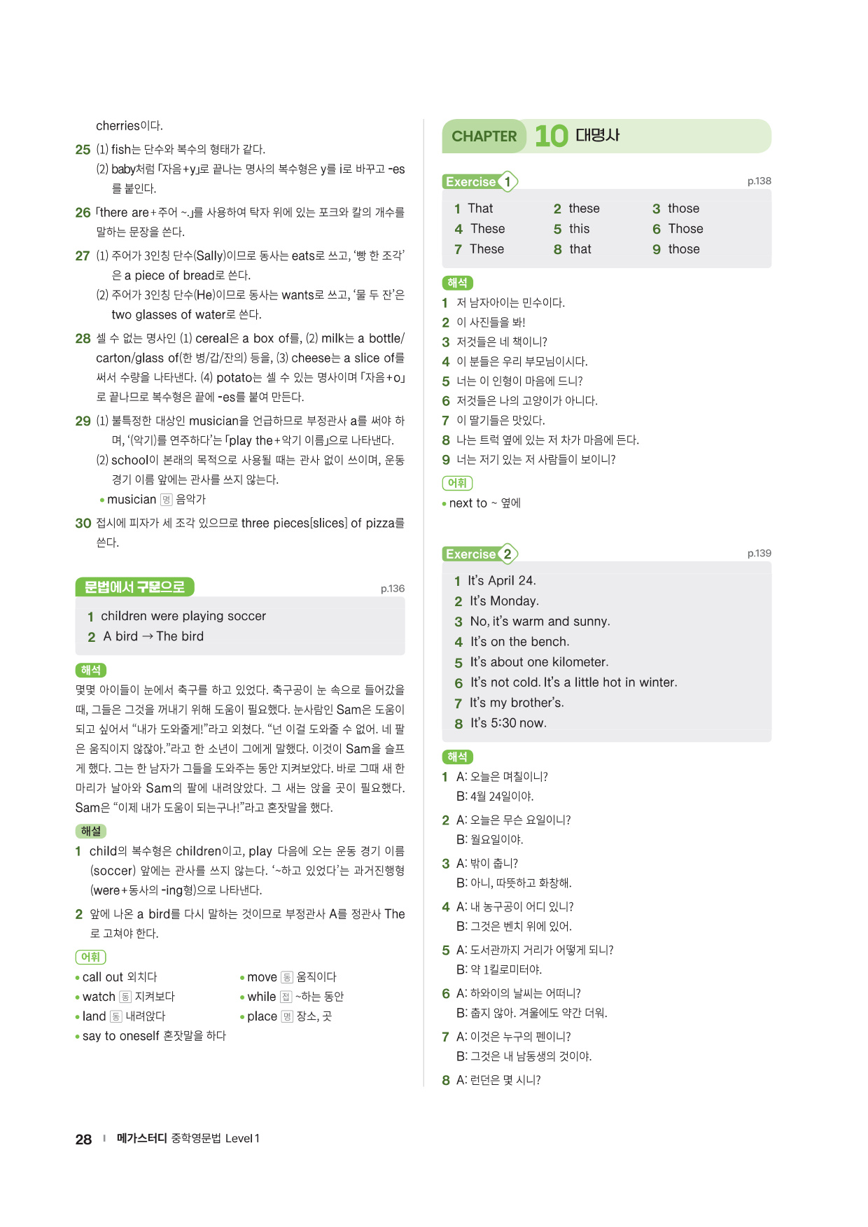 · Chapter Test - 각 챕터에서 학습한 문법 실력을 탄탄히 해 줄 추가 문제들을 제공합니다. 문법 확인 문제, 틀린 것 고치기, 문장 배열하기 유형의 문제들을 통해 학습한 문법을 복습합니다.