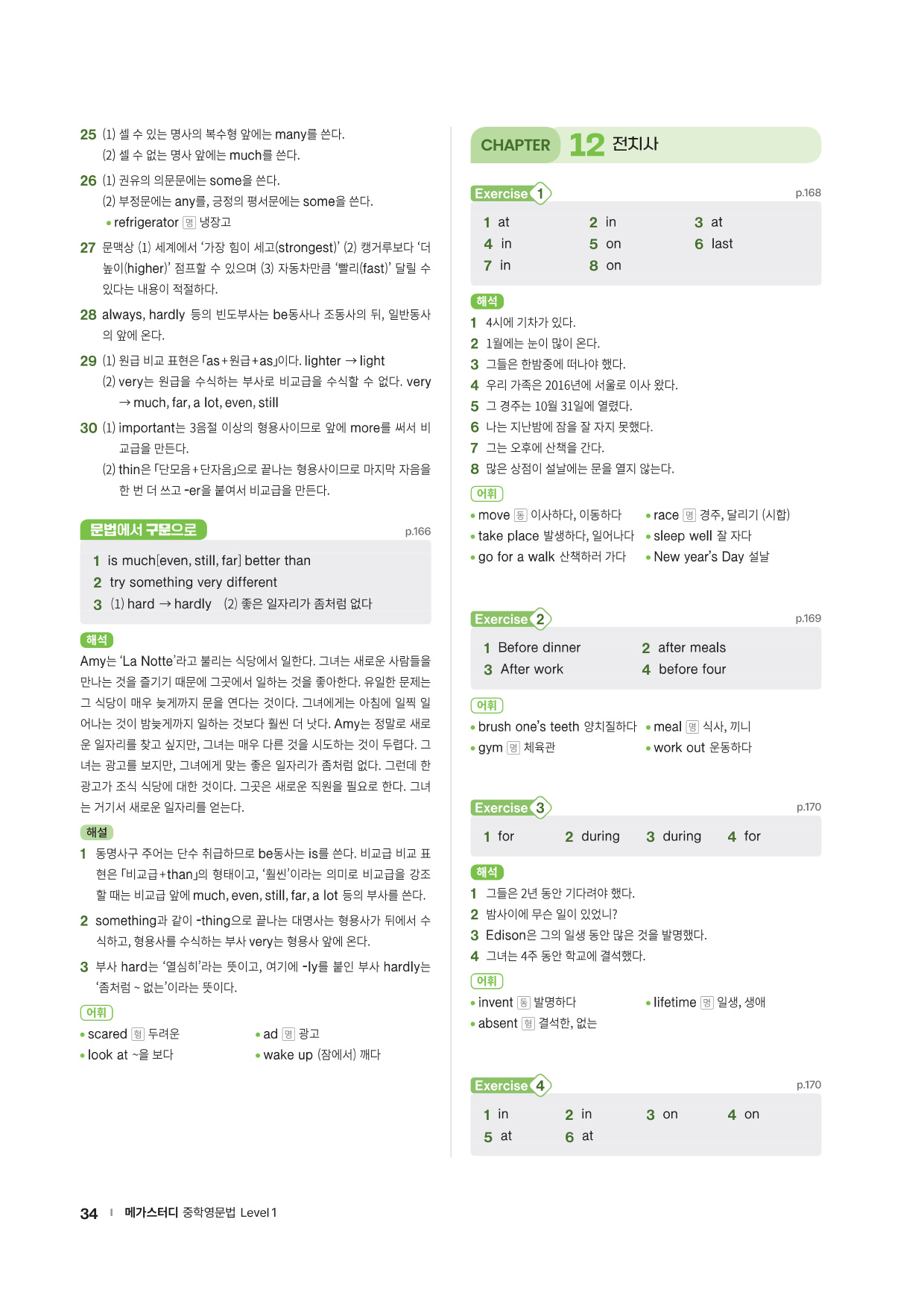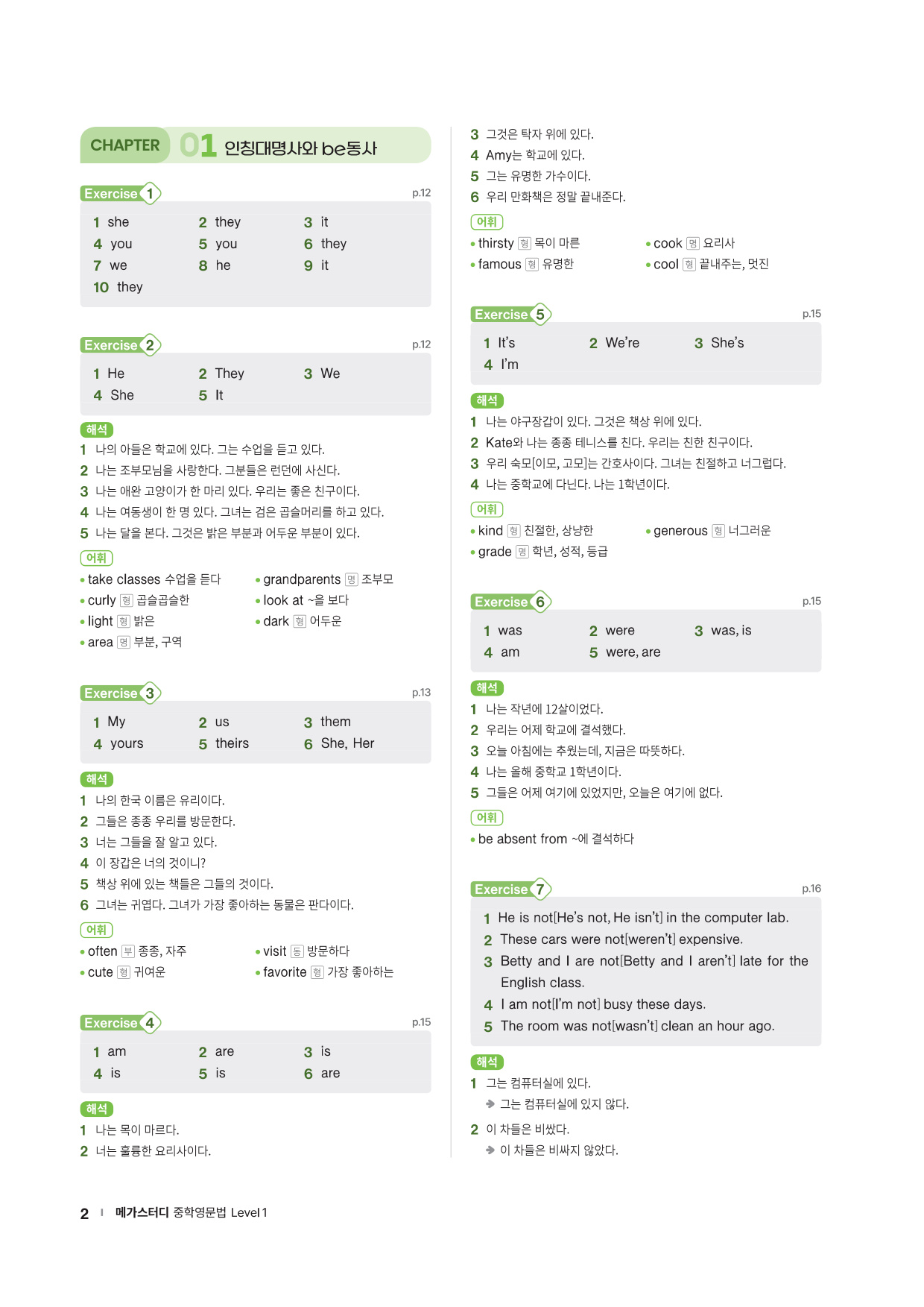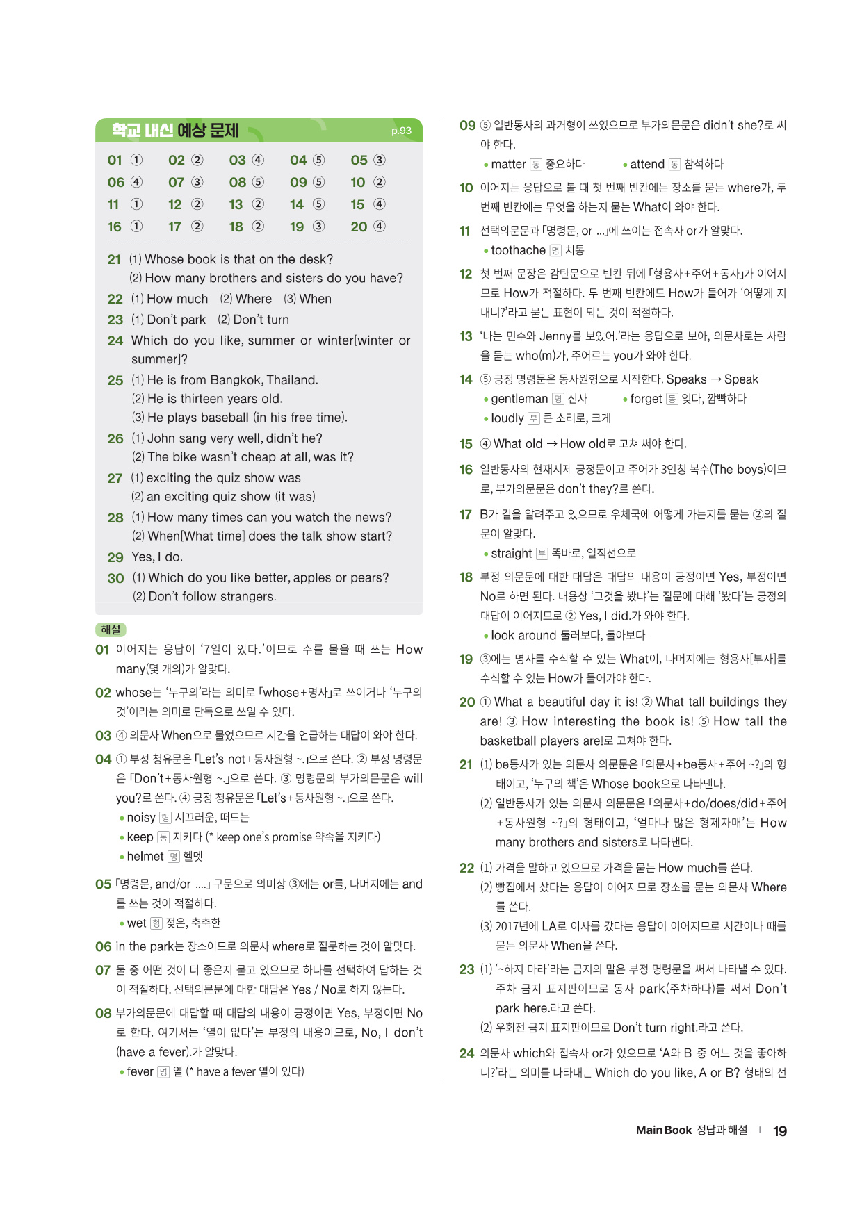 다양한 유형의 객관식 문제와 내신 서술형에 대비한 문제들을 챕터마다 제공합니다. 실제 전국의 중학교 기출 문제들을 응용·변형한 문제들로 구성하여 실전에 대한 감각을 익히고 내신에 완벽히 대비할 수 있도록 하였습니다.
