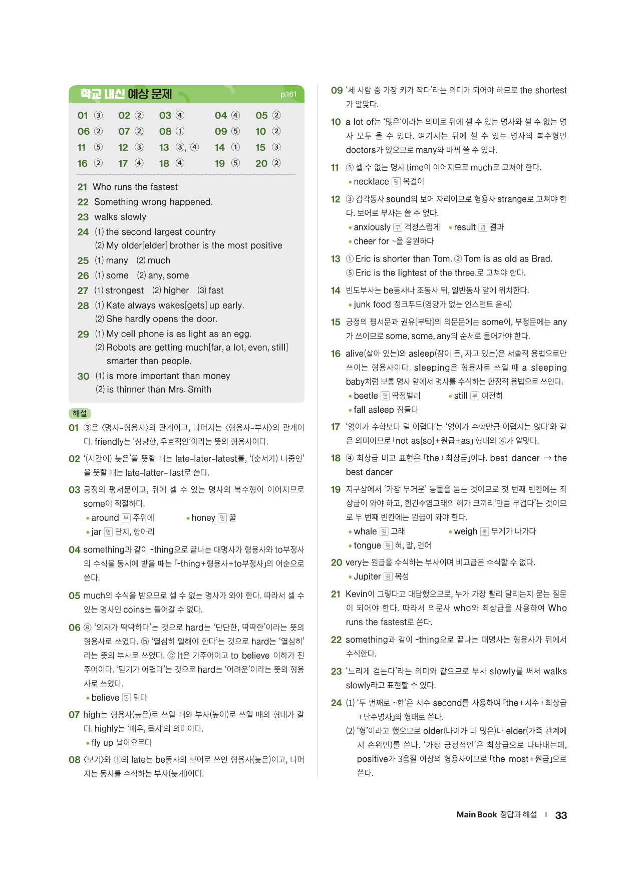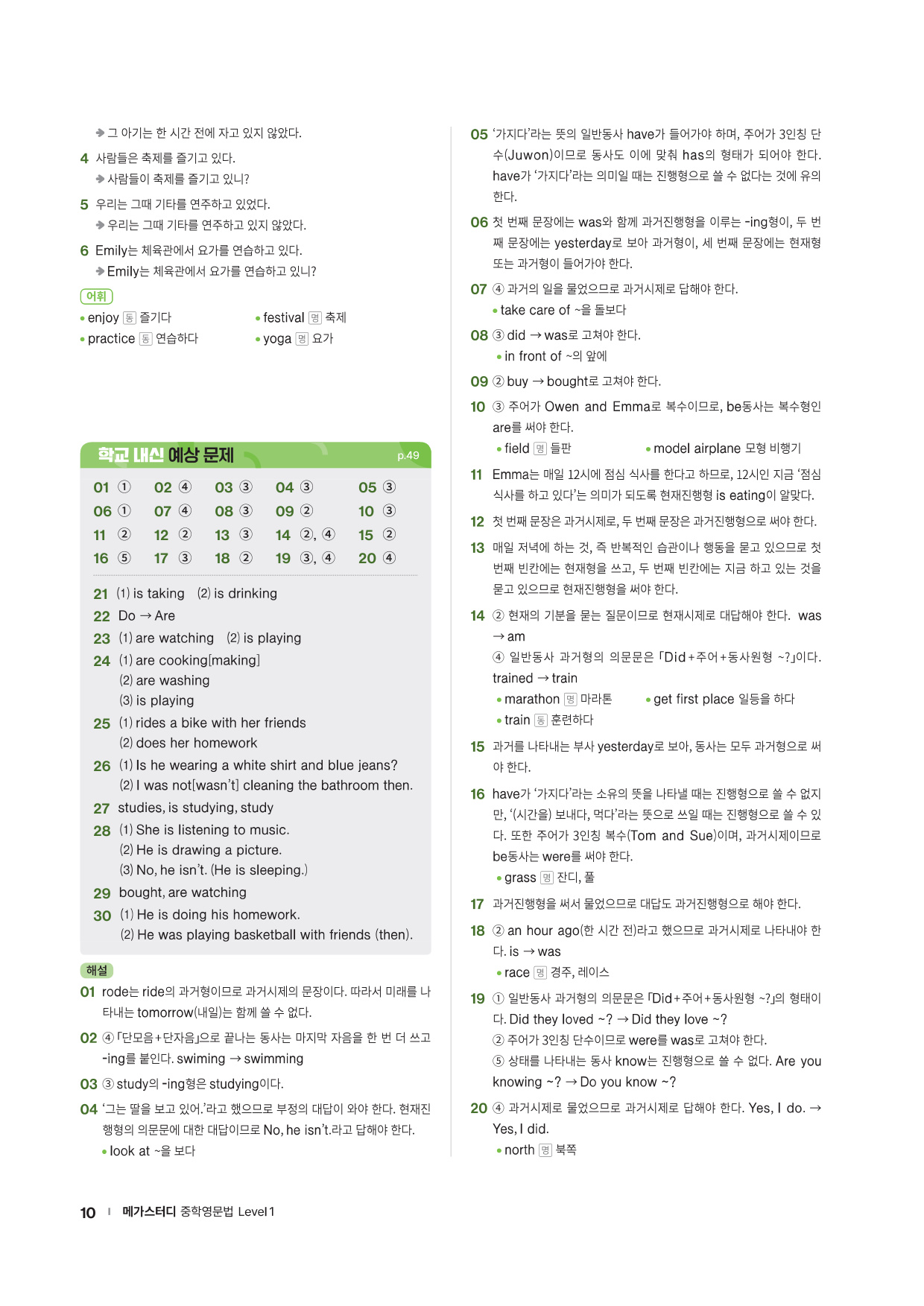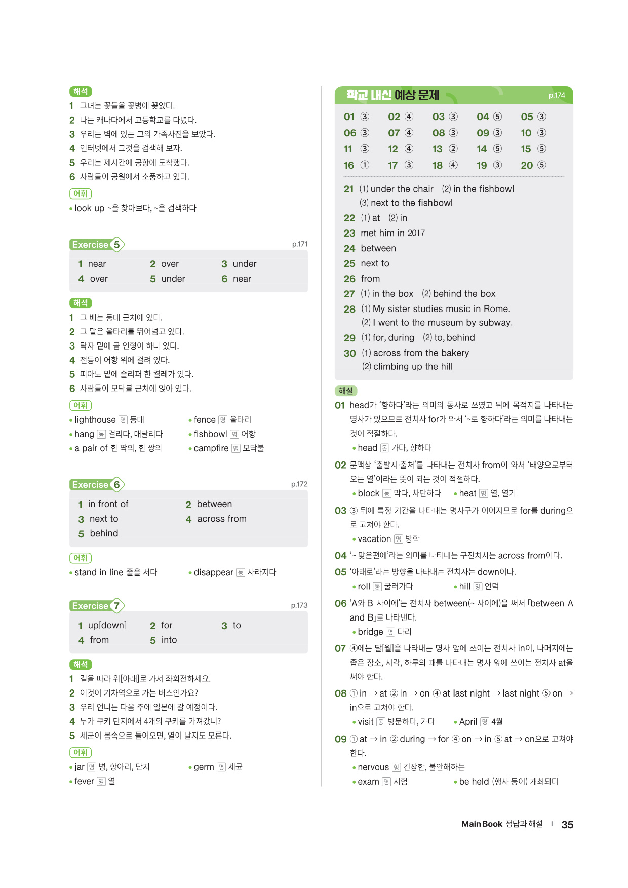 다양한 유형의 객관식 문제와 내신 서술형에 대비한 문제들을 챕터마다 제공합니다. 실제 전국의 중학교 기출 문제들을 응용·변형한 문제들로 구성하여 실전에 대한 감각을 익히고 내신에 완벽히 대비할 수 있도록 하였습니다.