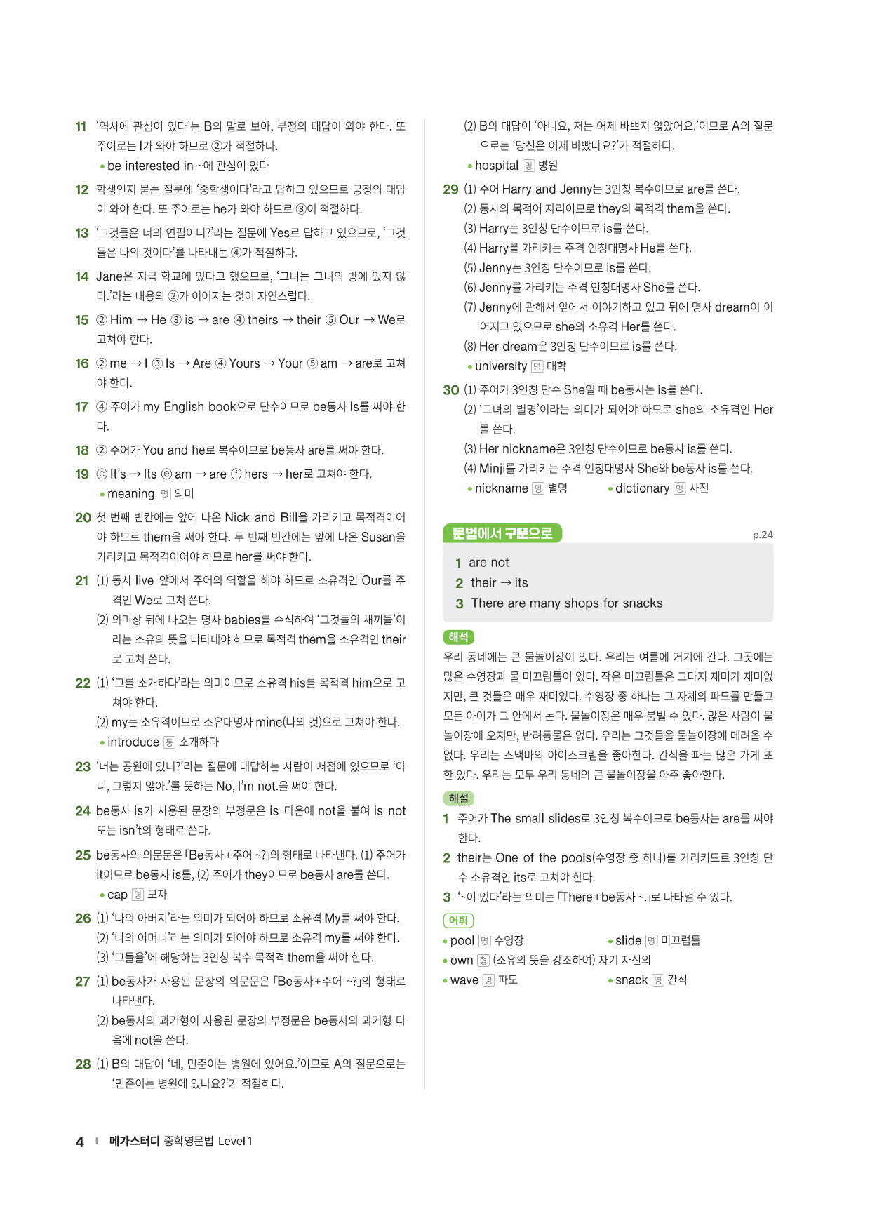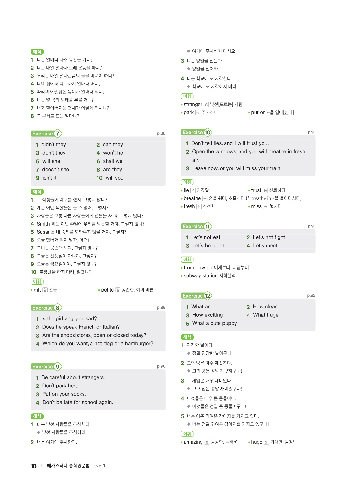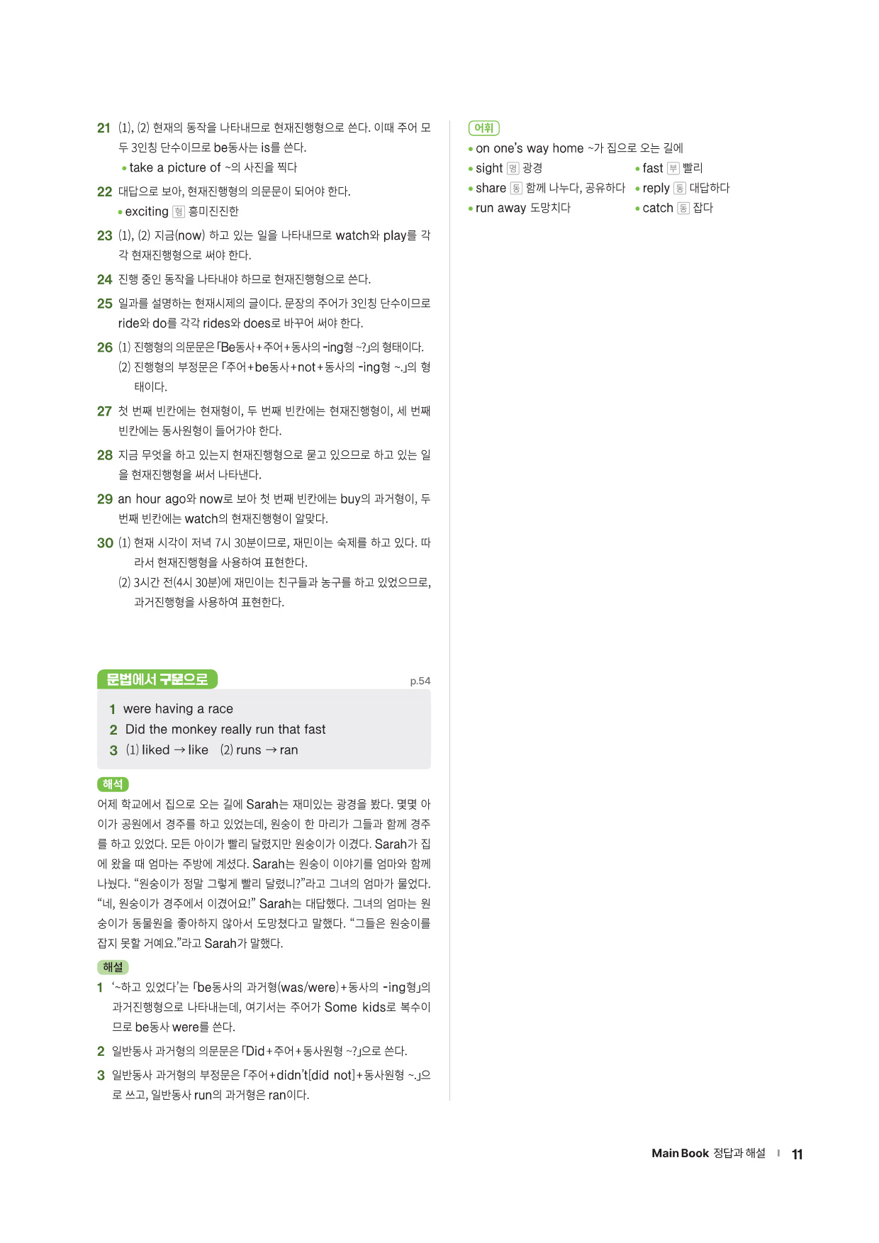 앞에서 배운 문법 사항을 글 읽기에 적용해 의미 해석 연습으로 확장할 수 있는 코너를 제시합니다. 흥미로운 스토리와 구문 해석 실력을 키울 수 있는 다양한 문제들로 해당 문법을 완벽히 마무리할 수 있도록 구성하였습니다.