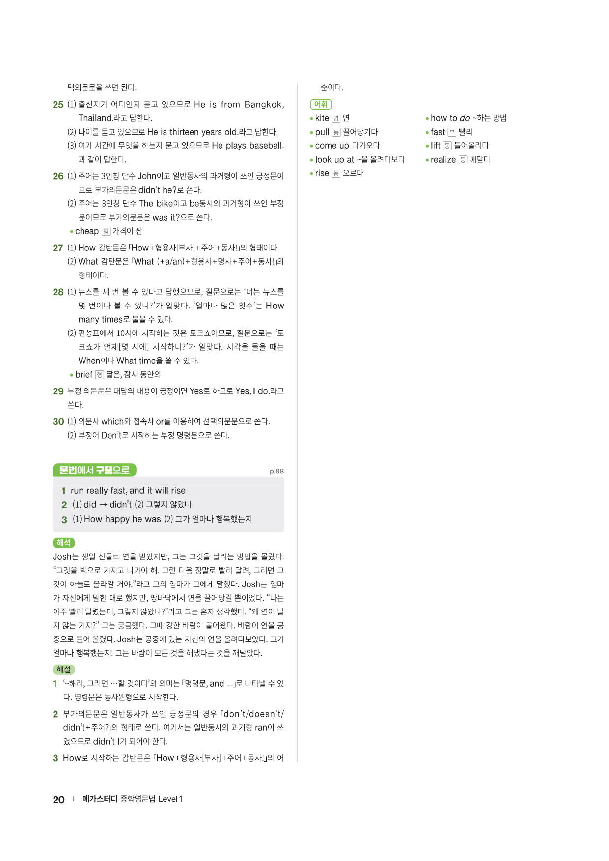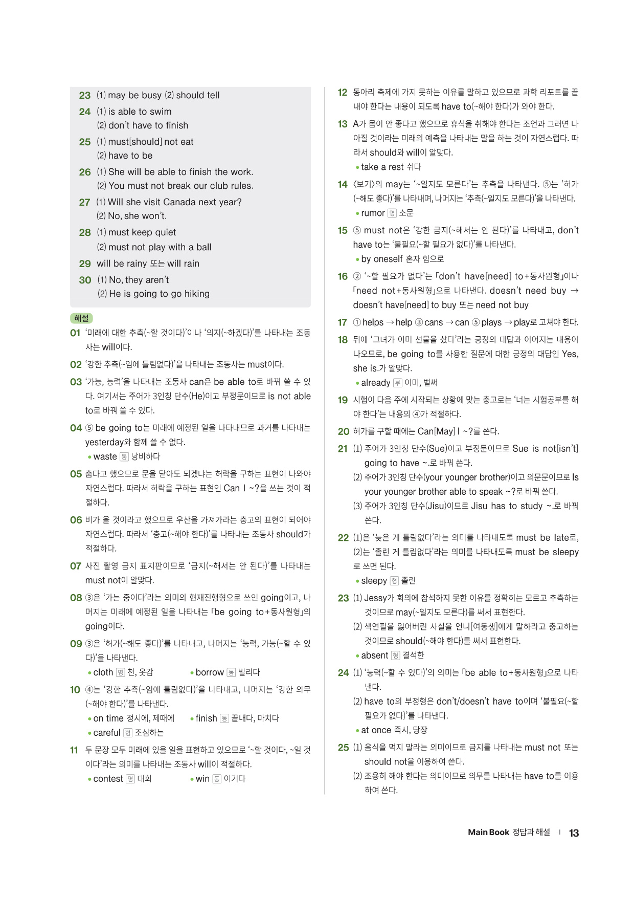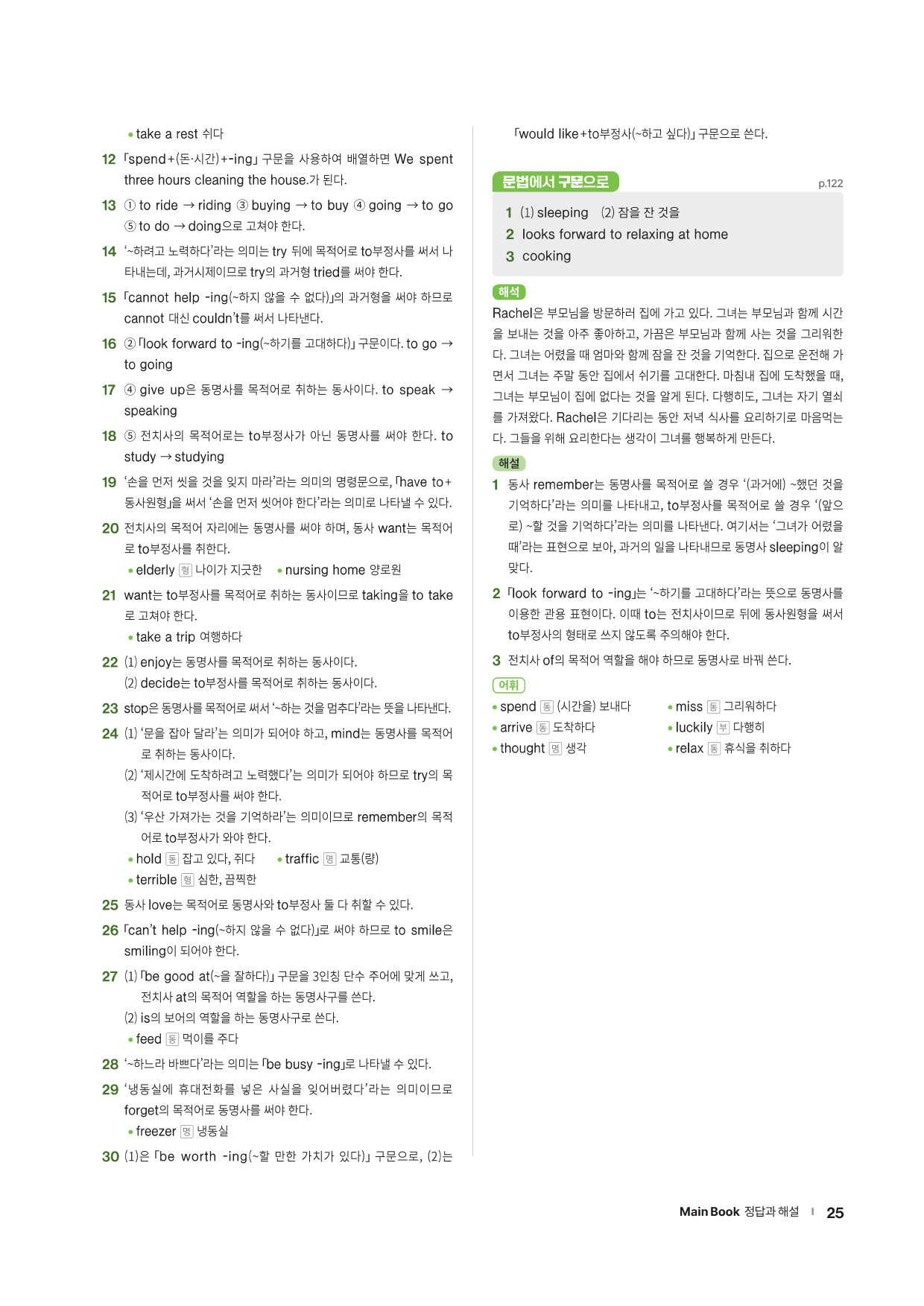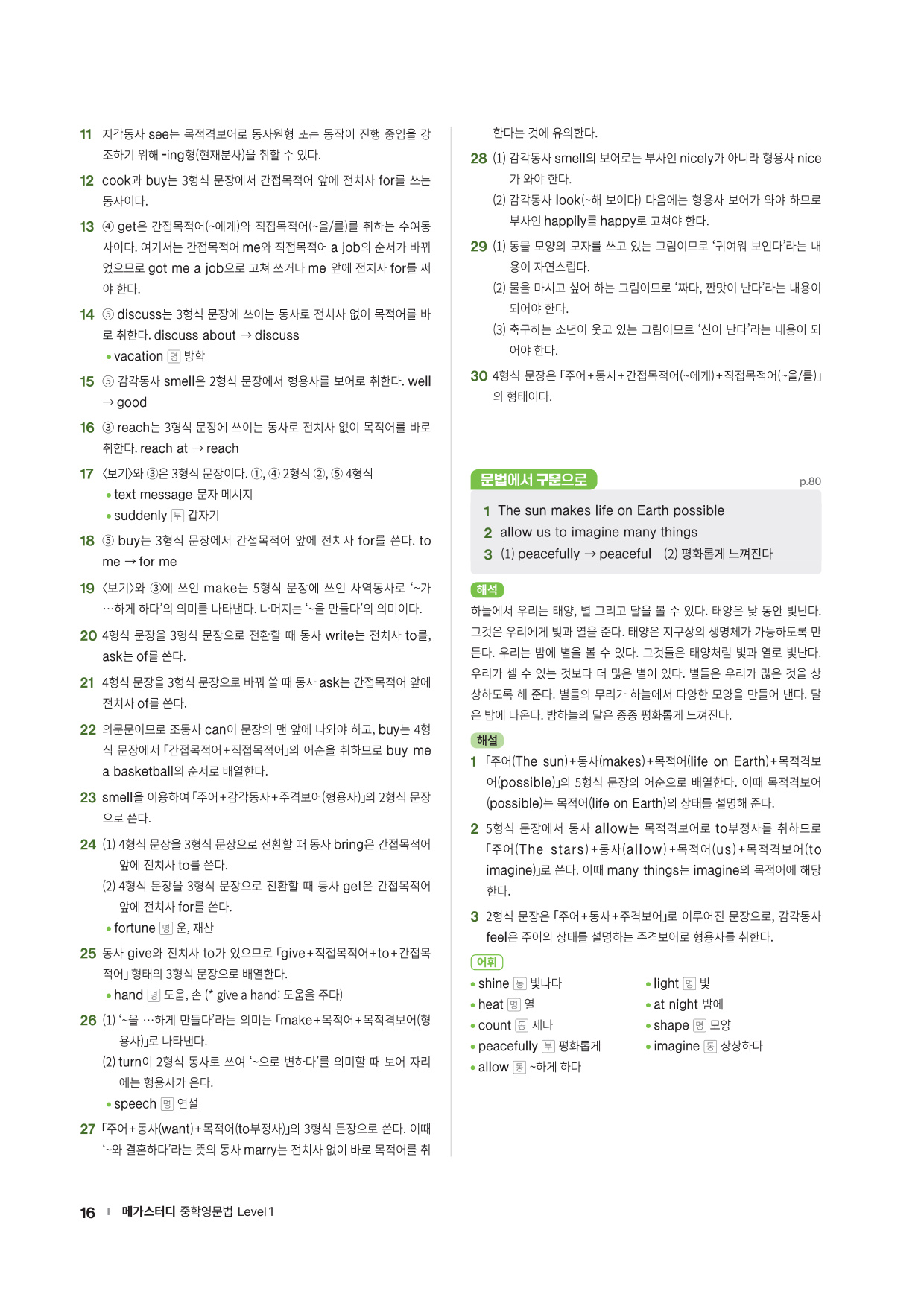 앞에서 배운 문법 사항을 글 읽기에 적용해 의미 해석 연습으로 확장할 수 있는 코너를 제시합니다. 흥미로운 스토리와 구문 해석 실력을 키울 수 있는 다양한 문제들로 해당 문법을 완벽히 마무리할 수 있도록 구성하였습니다.