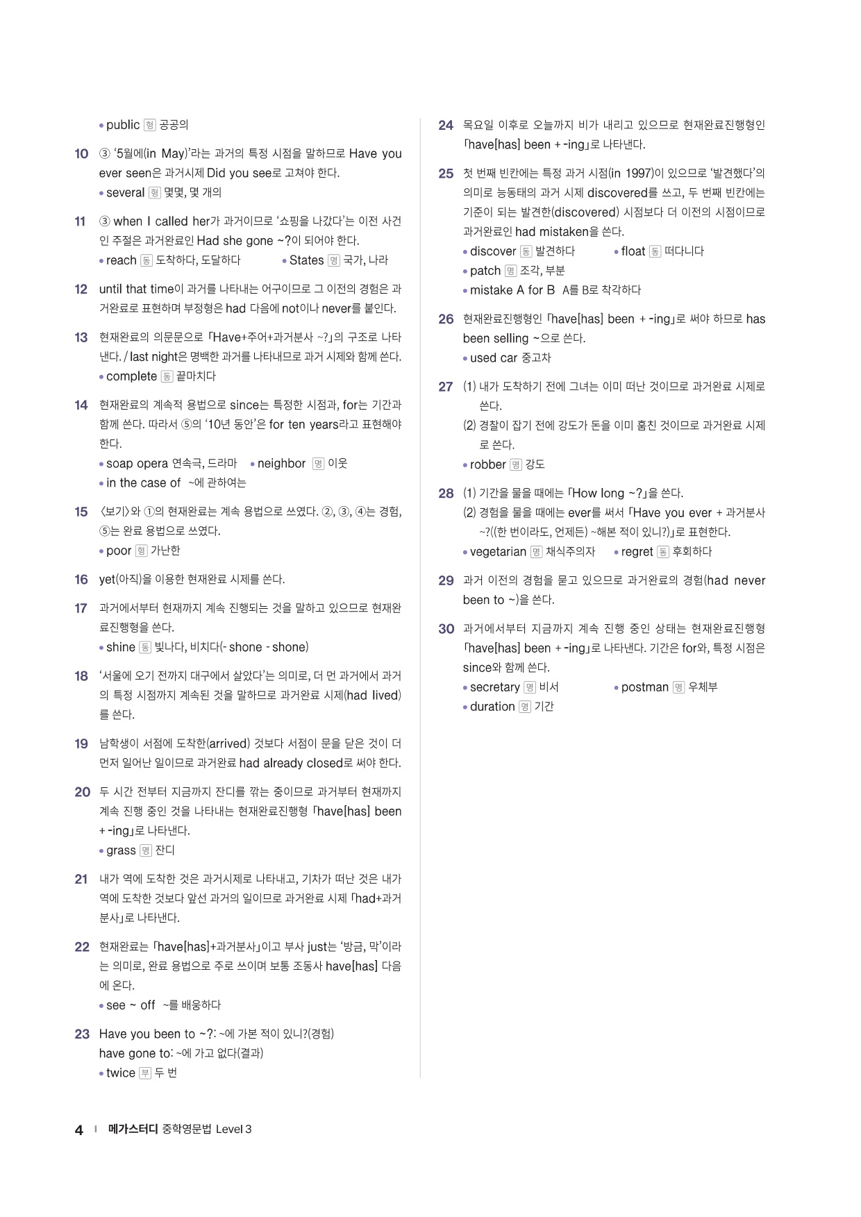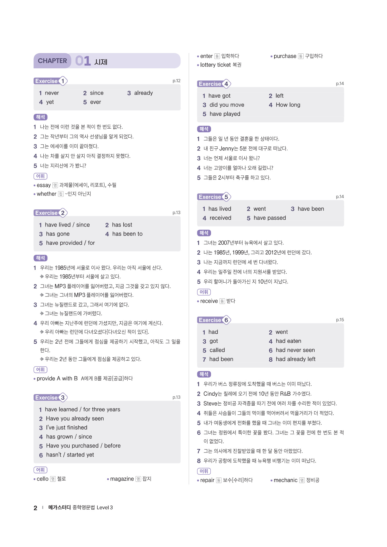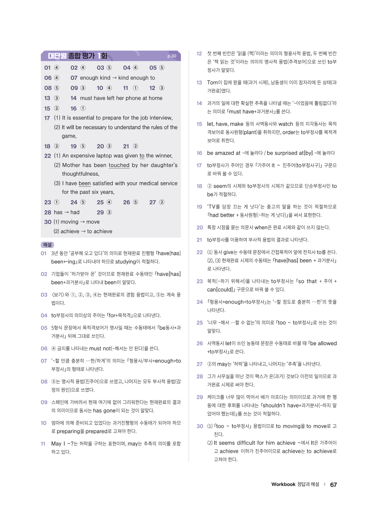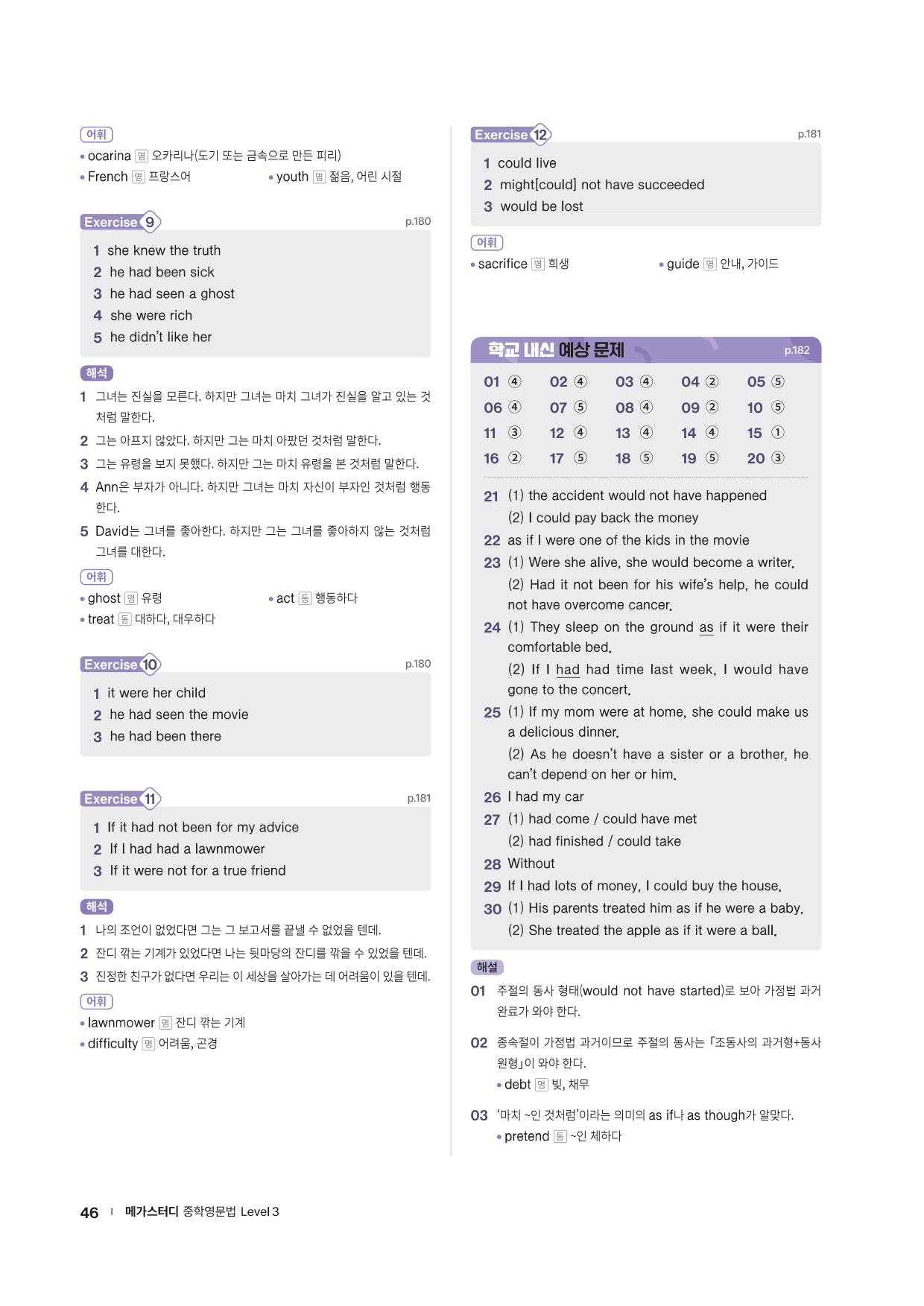· Chapter Test - 각 챕터에서 학습한 문법 실력을 탄탄히 해 줄 추가 문제들을 제공합니다. 문법 확인 문제, 틀린 것 고치기, 문장 배열하기 유형의 문제들을 통해 학습한 문법을 복습합니다.