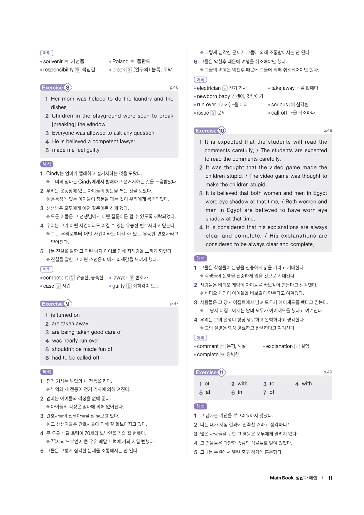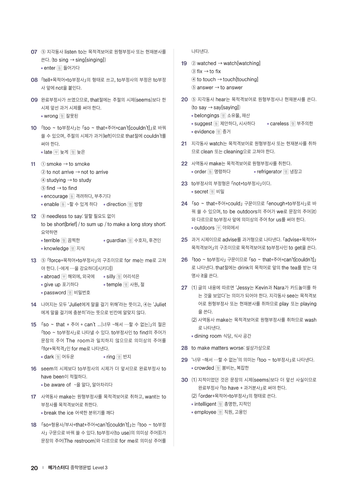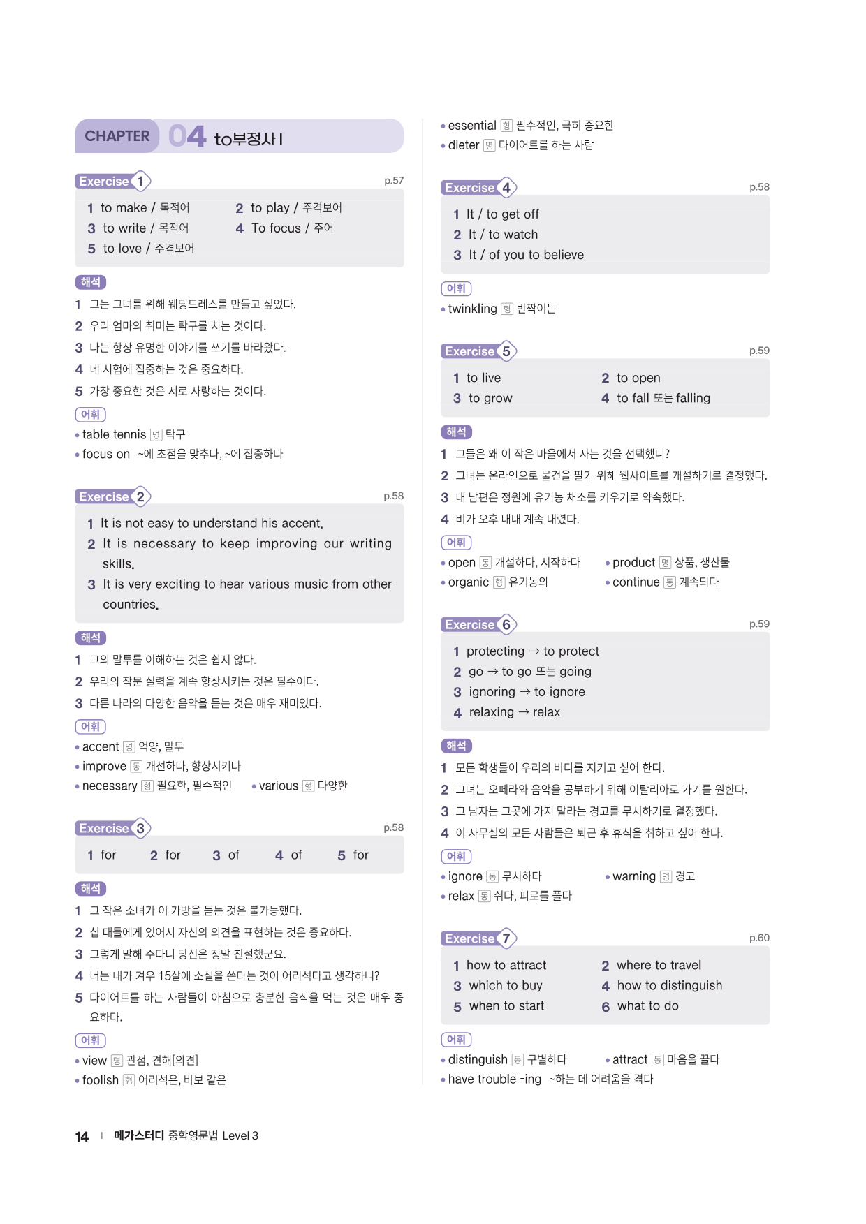 앞에서 배운 문법 사항을 글 읽기에 적용해 의미 해석 연습으로 확장할 수 있는 코너를 제시합니다. 흥미로운 스토리와 구문 해석 실력을 키울 수 있는 다양한 문제들로 해당 문법을 완벽히 마무리할 수 있도록 구성하였습니다.