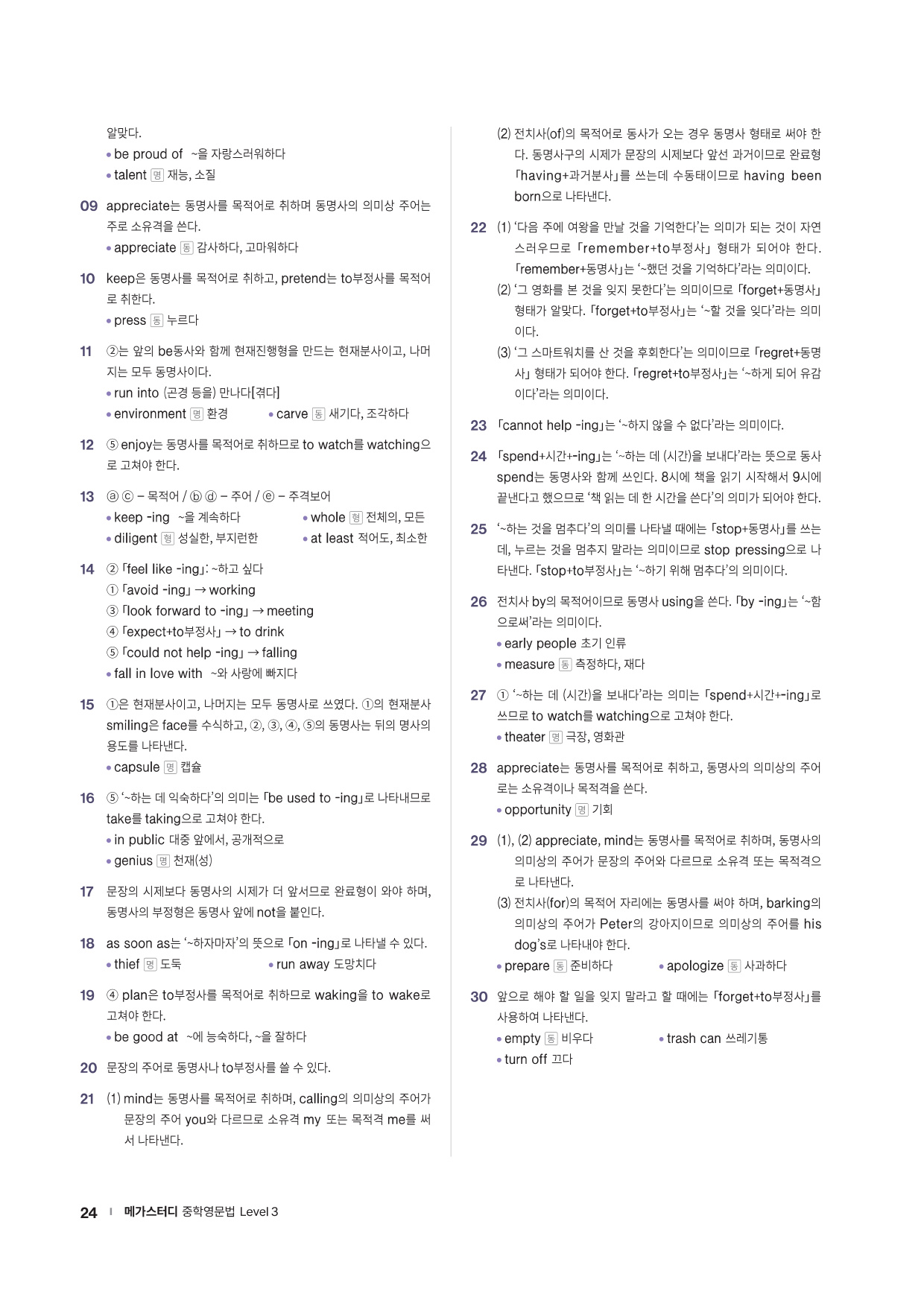 중학 필수 문법 개념을 쉬운 예문들로 학습할 수 있도록 하였고, 추가설명이 필요한 내용은 TIP으로 제시하였습니다. 충분히 제공되는 Exercise 문제들로 핵심적인 문법 사항들을 확실하게 다질 수 있습니다.