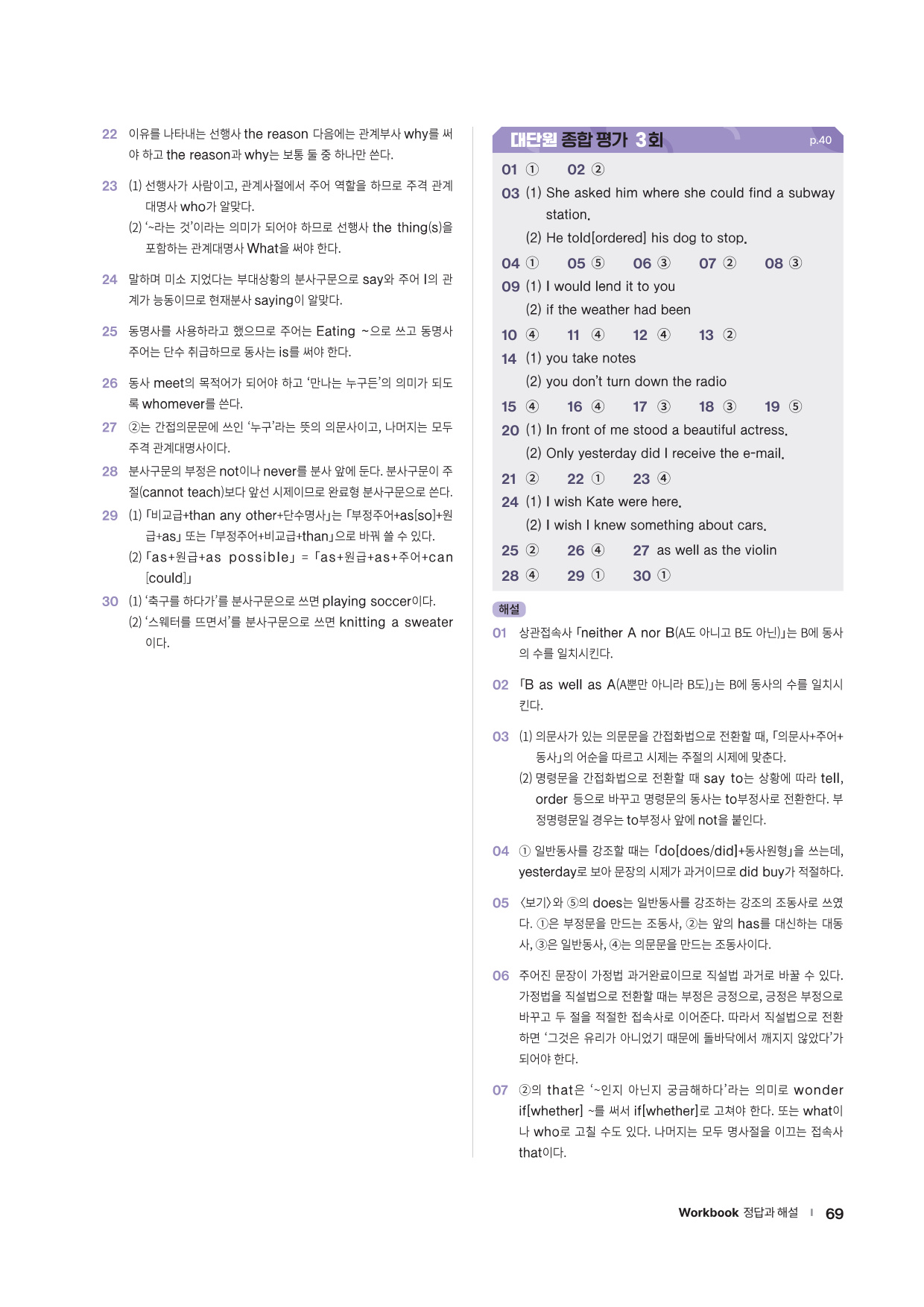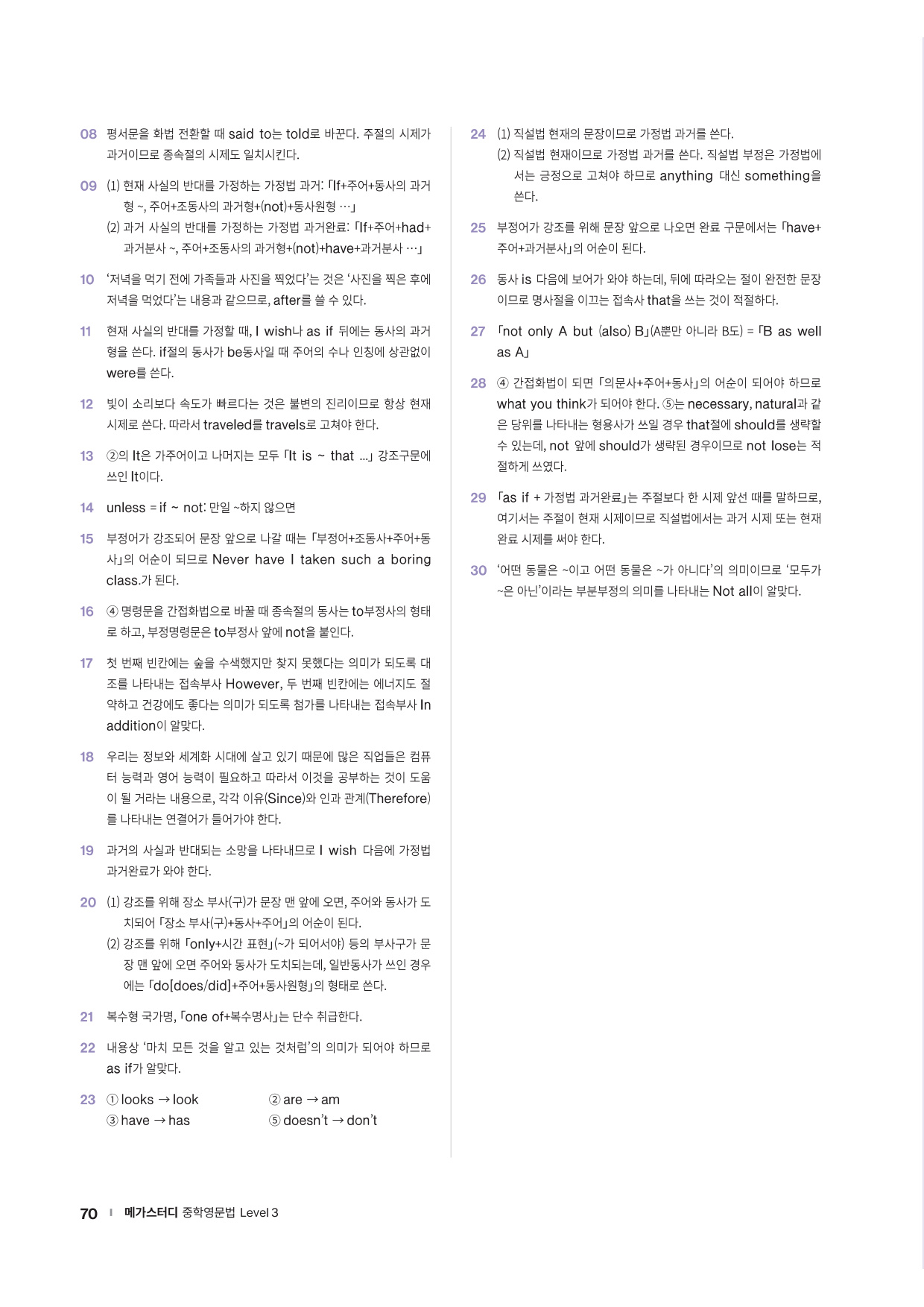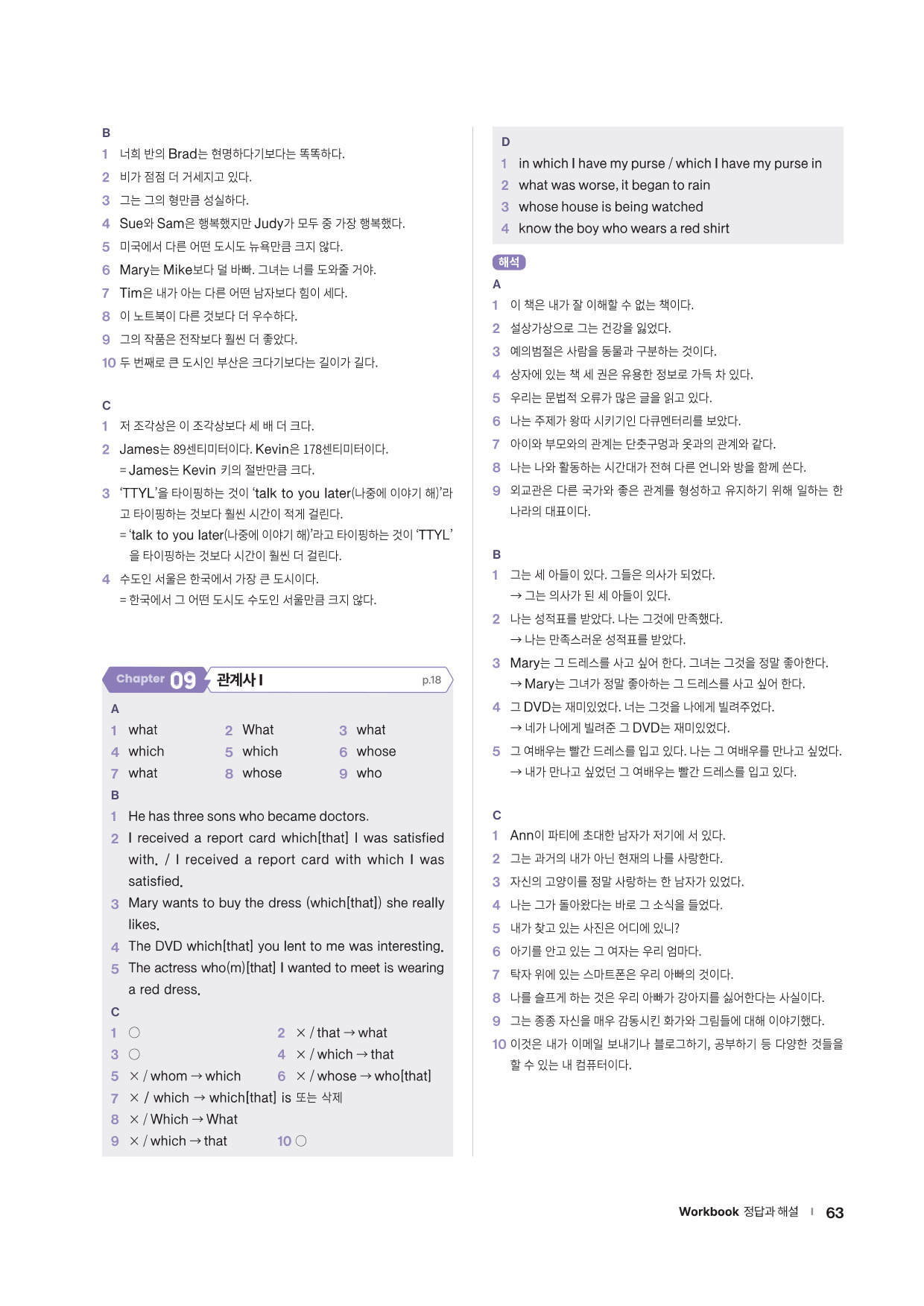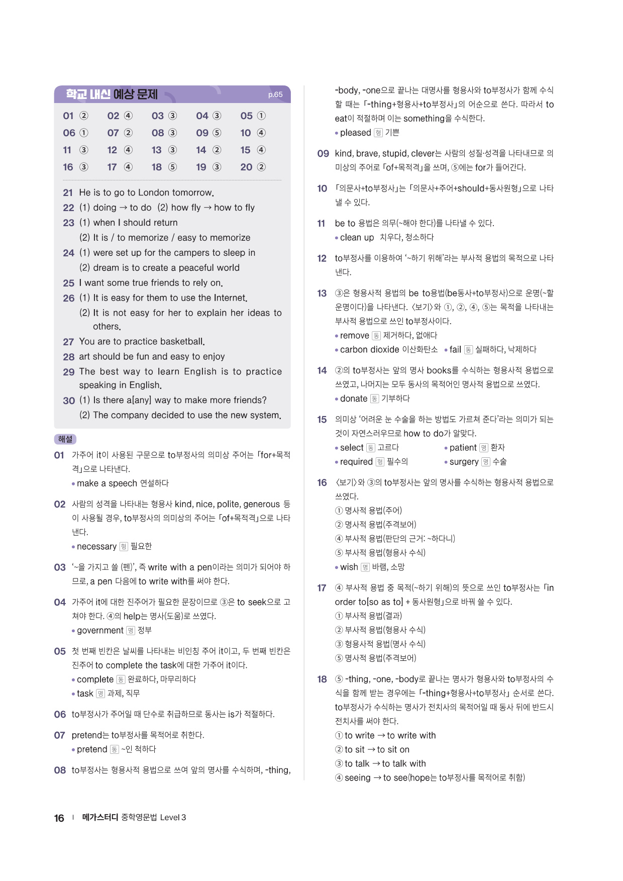 · Chapter Test - 각 챕터에서 학습한 문법 실력을 탄탄히 해 줄 추가 문제들을 제공합니다. 문법 확인 문제, 틀린 것 고치기, 문장 배열하기 유형의 문제들을 통해 학습한 문법을 복습합니다.