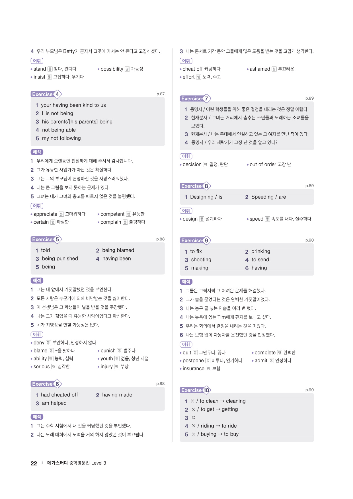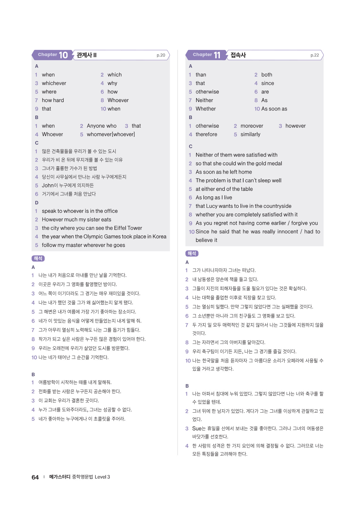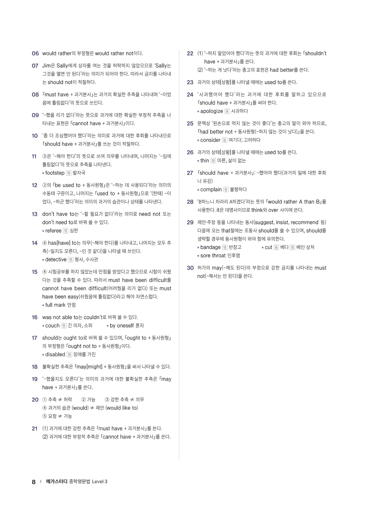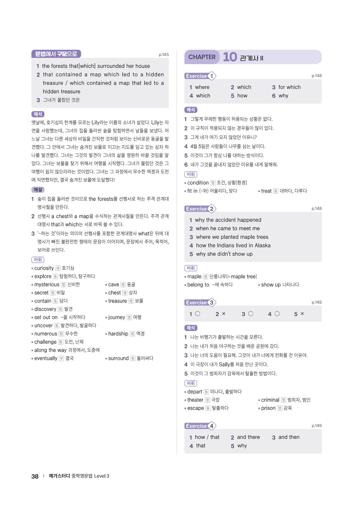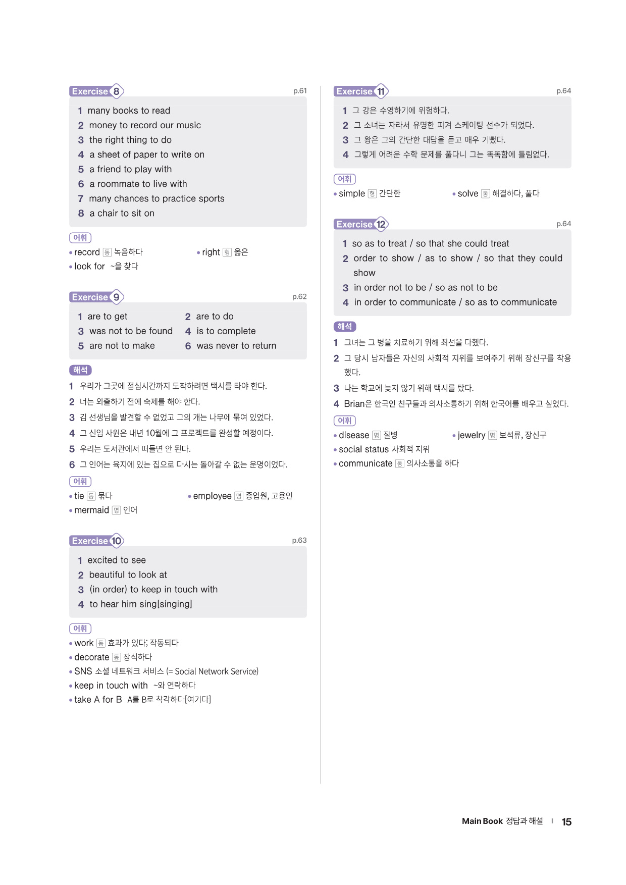 · Chapter Test - 각 챕터에서 학습한 문법 실력을 탄탄히 해 줄 추가 문제들을 제공합니다. 문법 확인 문제, 틀린 것 고치기, 문장 배열하기 유형의 문제들을 통해 학습한 문법을 복습합니다.