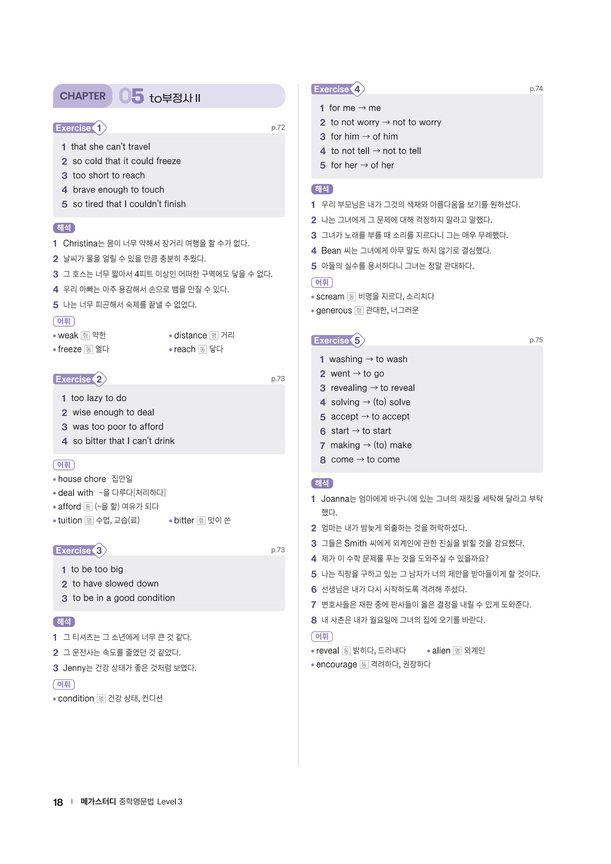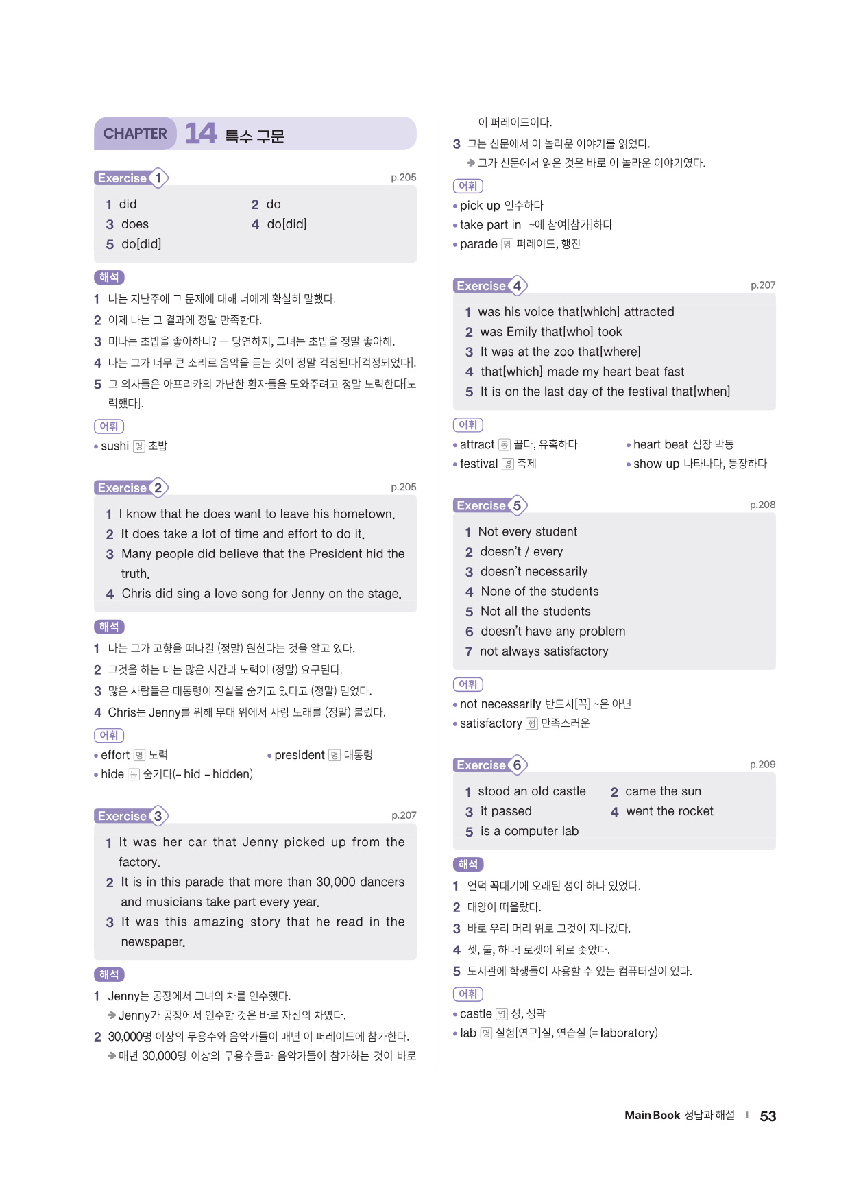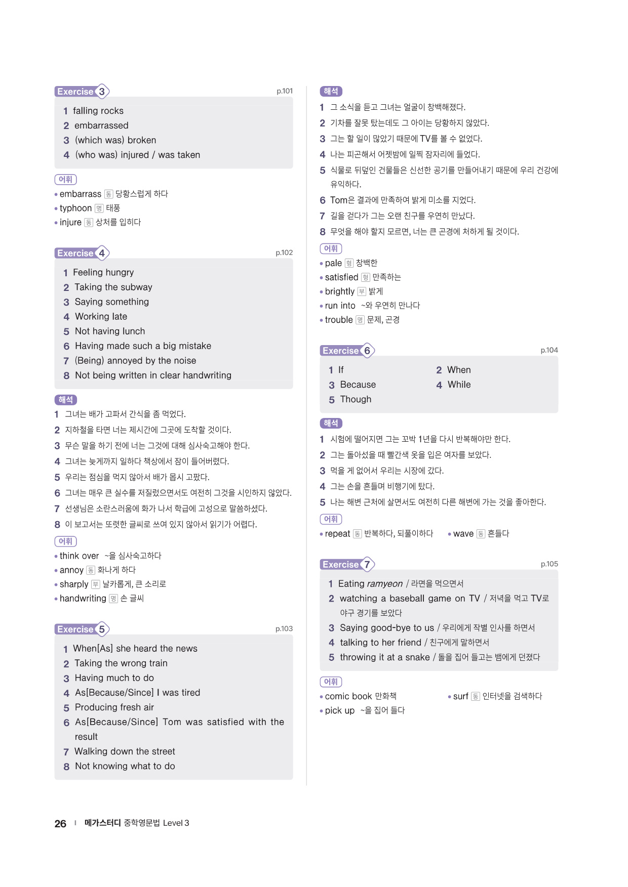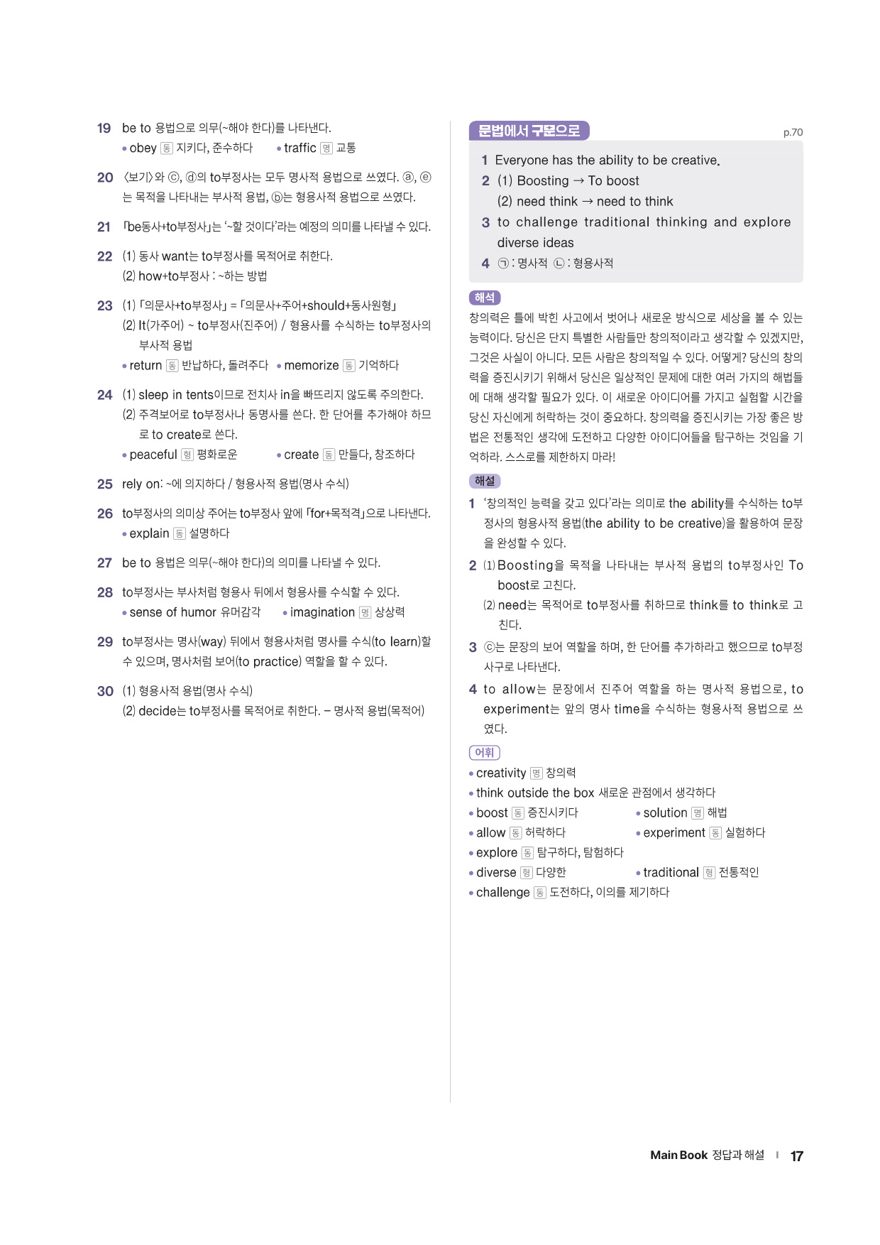 앞에서 배운 문법 사항을 글 읽기에 적용해 의미 해석 연습으로 확장할 수 있는 코너를 제시합니다. 흥미로운 스토리와 구문 해석 실력을 키울 수 있는 다양한 문제들로 해당 문법을 완벽히 마무리할 수 있도록 구성하였습니다.