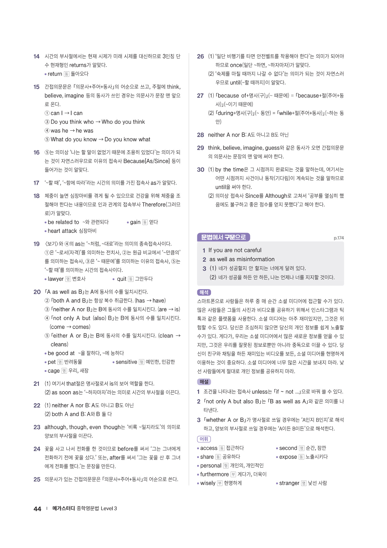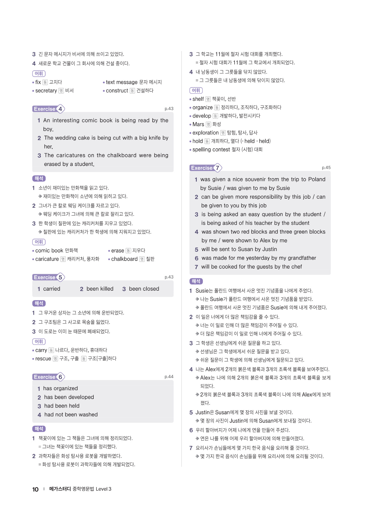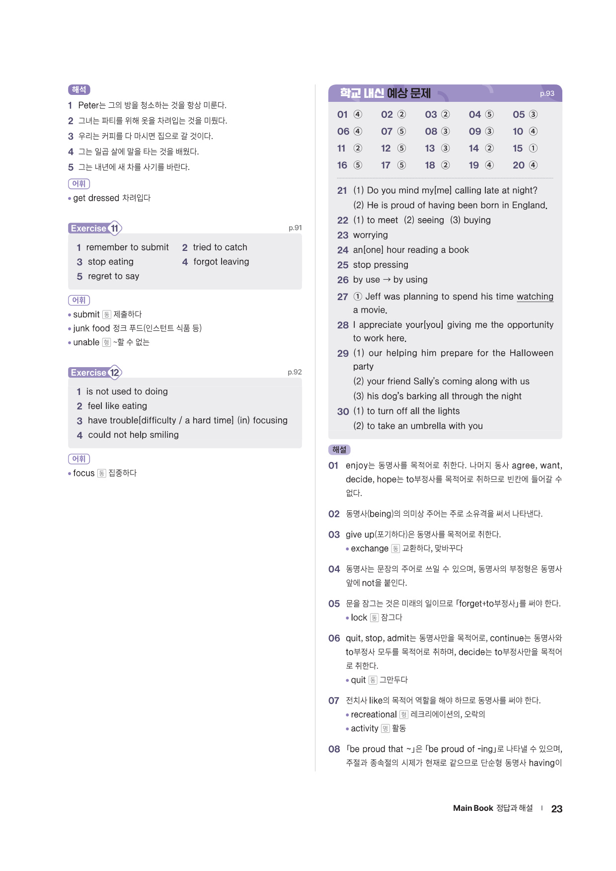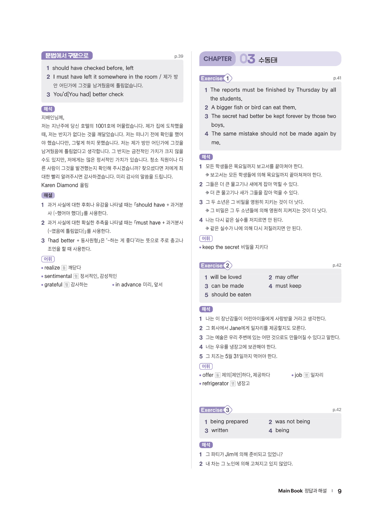앞에서 배운 문법 사항을 글 읽기에 적용해 의미 해석 연습으로 확장할 수 있는 코너를 제시합니다. 흥미로운 스토리와 구문 해석 실력을 키울 수 있는 다양한 문제들로 해당 문법을 완벽히 마무리할 수 있도록 구성하였습니다.