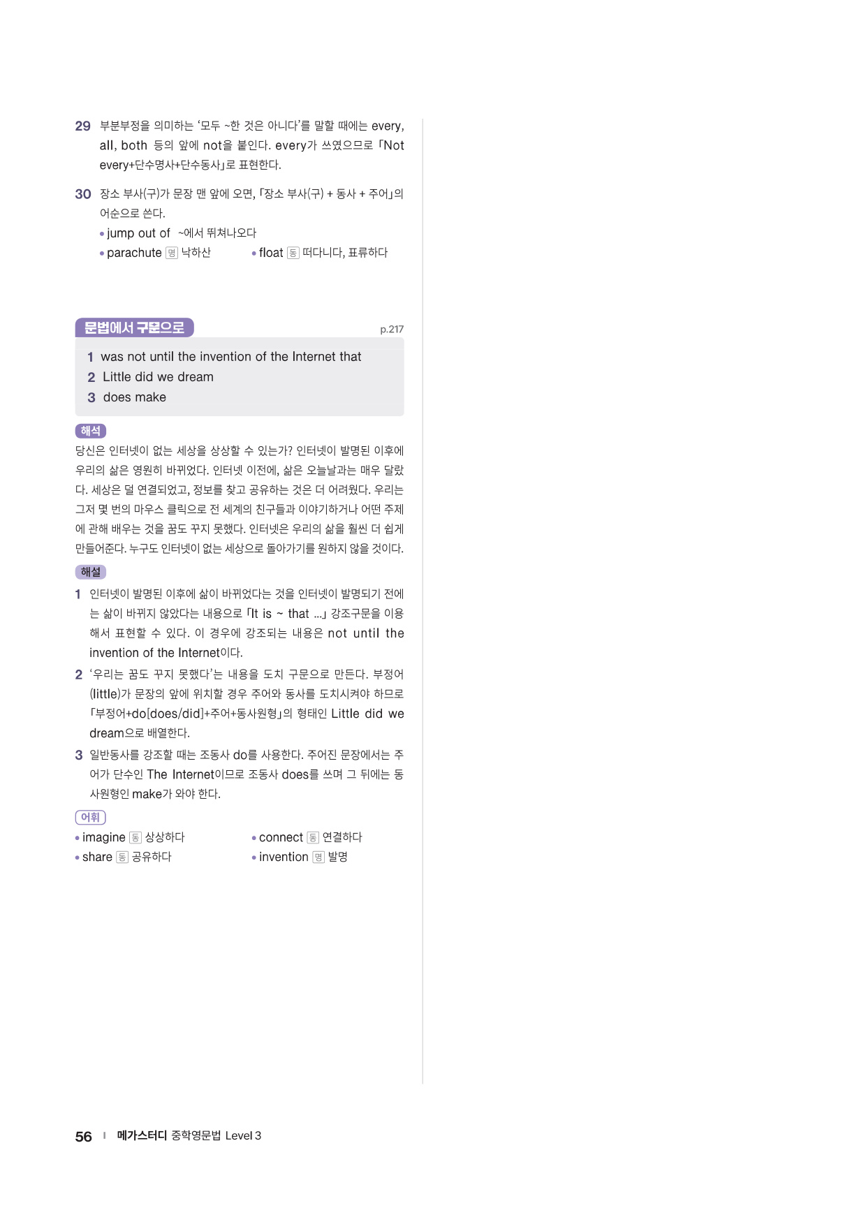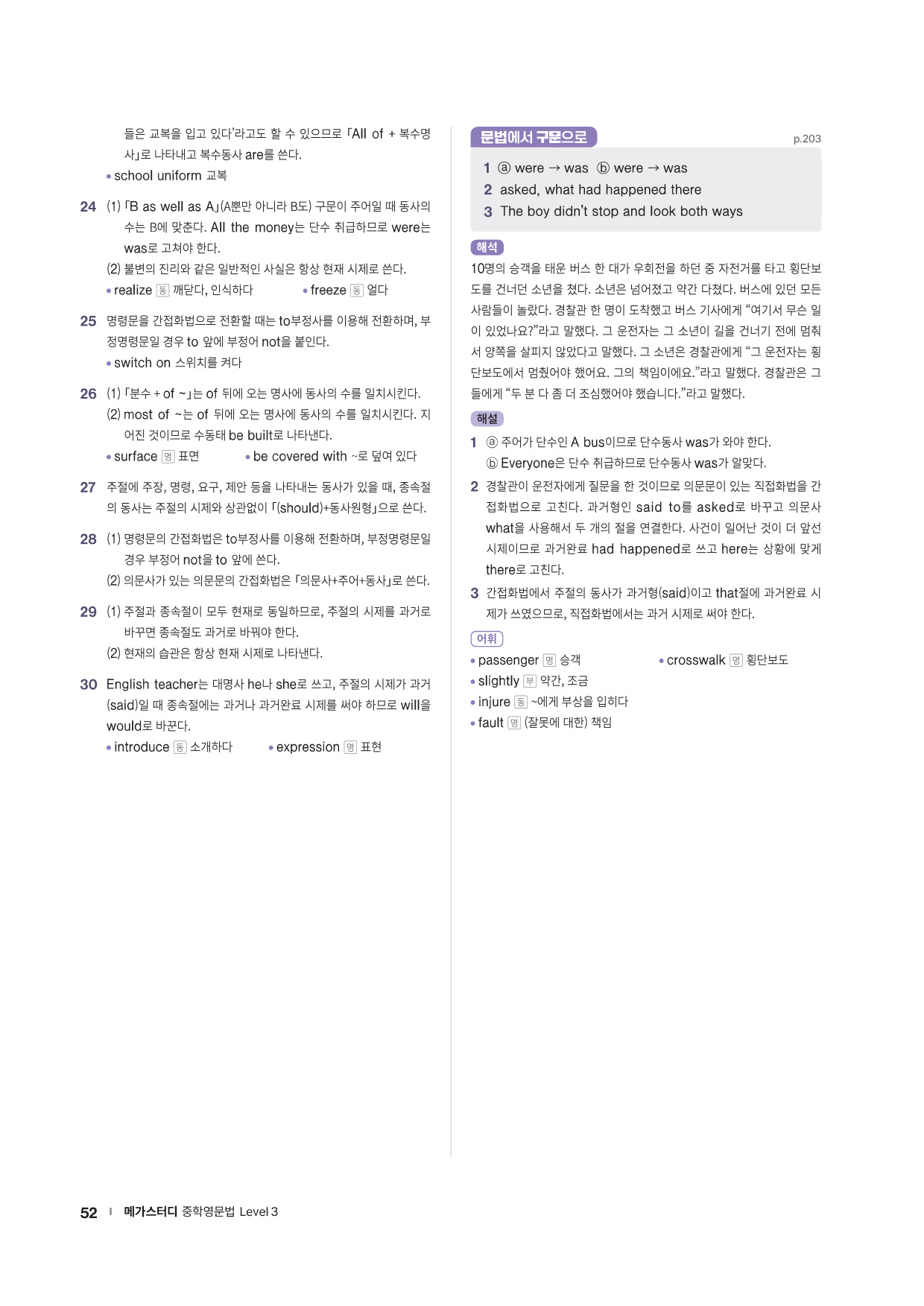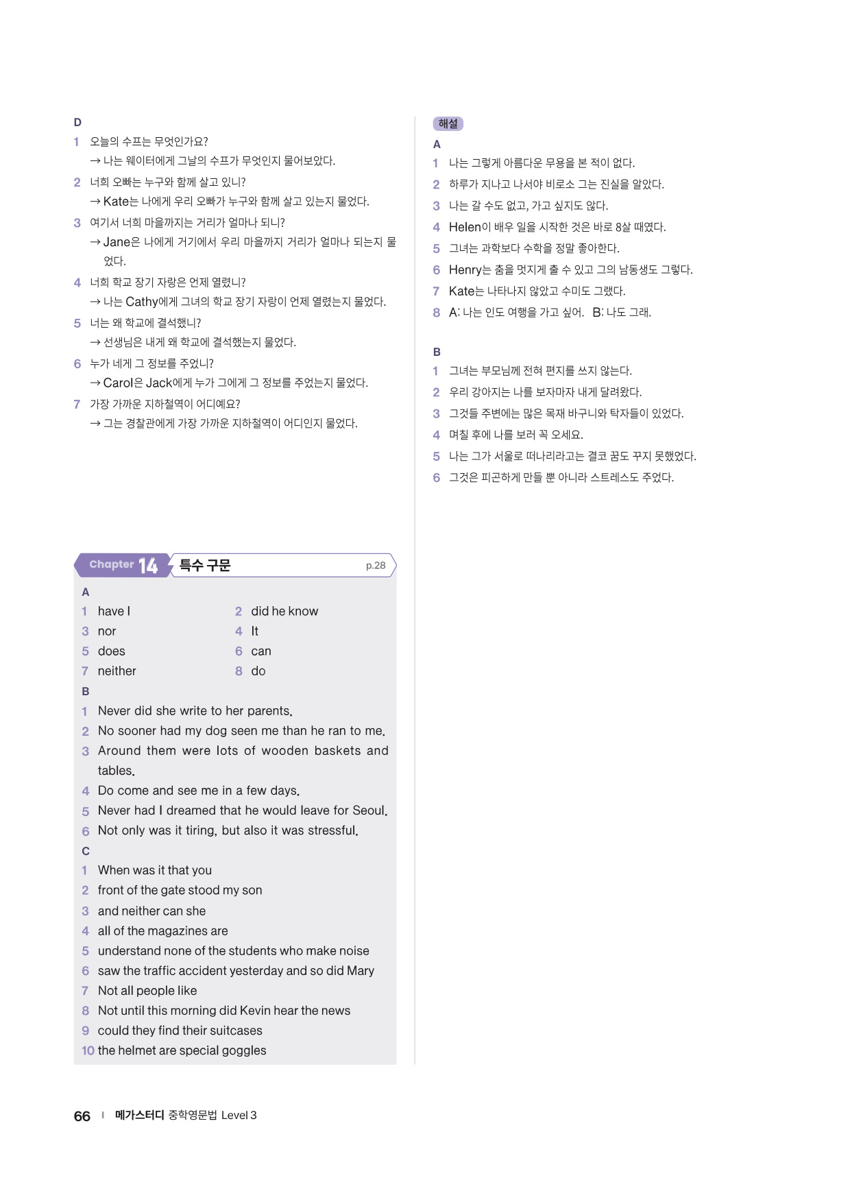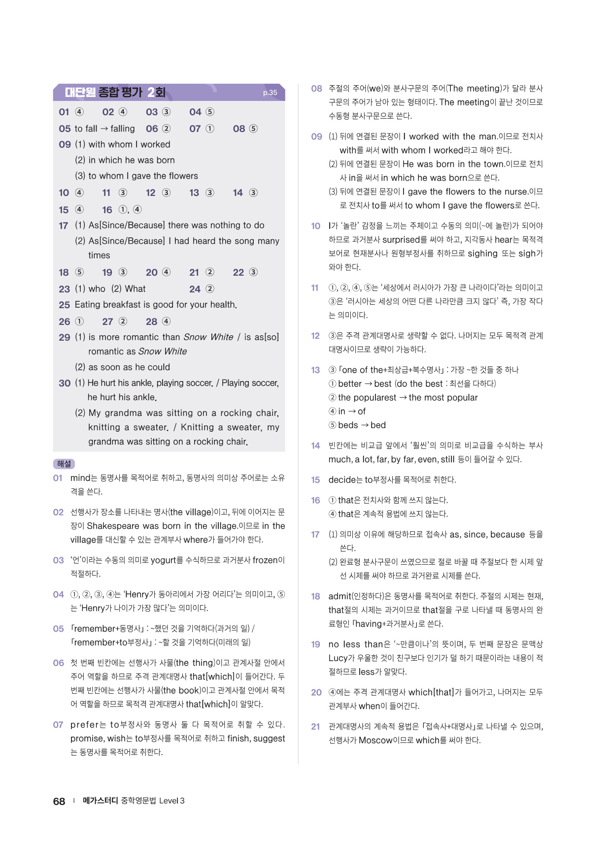 앞에서 배운 문법 사항을 글 읽기에 적용해 의미 해석 연습으로 확장할 수 있는 코너를 제시합니다. 흥미로운 스토리와 구문 해석 실력을 키울 수 있는 다양한 문제들로 해당 문법을 완벽히 마무리할 수 있도록 구성하였습니다.