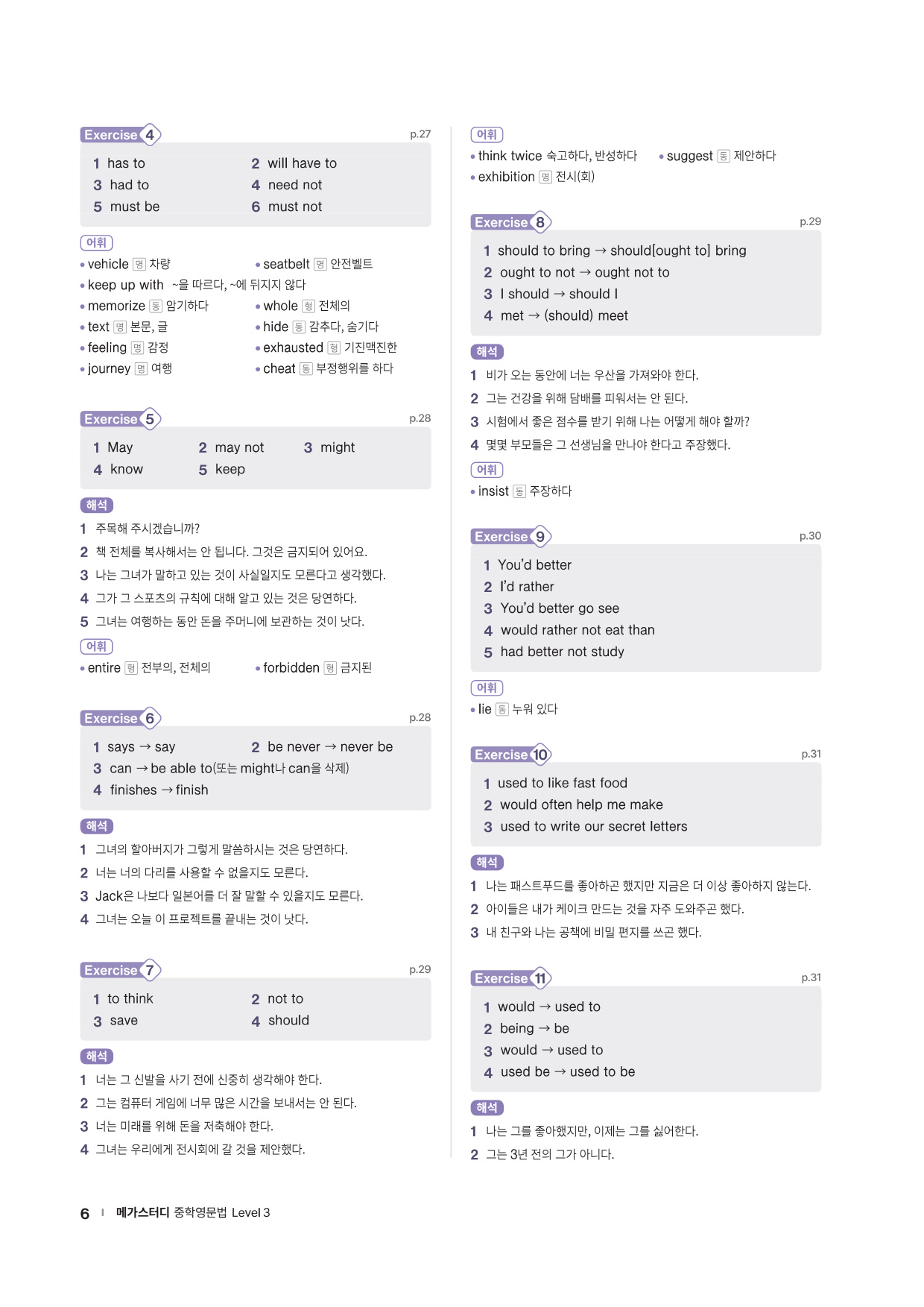 중학 필수 문법 개념을 쉬운 예문들로 학습할 수 있도록 하였고, 추가설명이 필요한 내용은 TIP으로 제시하였습니다. 충분히 제공되는 Exercise 문제들로 핵심적인 문법 사항들을 확실하게 다질 수 있습니다.