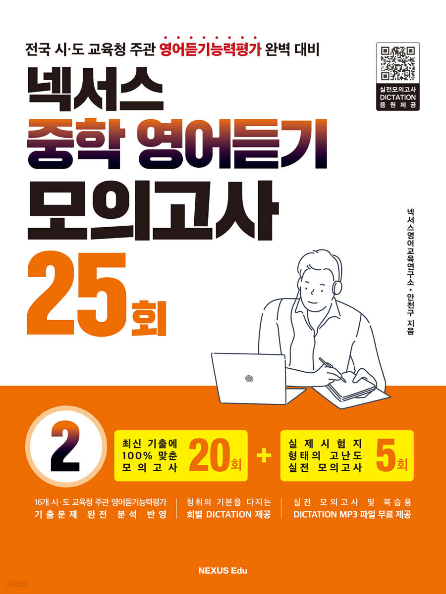 『넥서스 중학 영어듣기 모의고사 25회 시리즈 1, 2, 3』는 전국 16개 시·도 교육청 공동 주관 영어듣기평가를 대비하는 실전 대비서로 최신 기출문제를 완전 분석한 최신 문제 유형을 제공한다. 또한, 모의고사 20회와 실제 시험지 형태의 실전 모의고사 5회를 제공하여 실전에 완벽하게 대비하도록 하였다. 매회 받아쓰기를 통해 어휘 복습과 청취 연습이 동시에 가능하도록 제공하고 있어, 청취 실력 향상 및 기출 어휘 학습도 가능하도록 구성하였다. 그뿐만 아니라, 원어민의 일상 회화에 가까운 자연스러운 대화 속도의 음원을 제공하고 있어, 의사소통 기능 향상도 기대할 수 있을 것이다. 회별 모의고사와 딕테이션 음원은 QR코드 터치(클릭) 또는 스캔으로 이용할 수 있다.