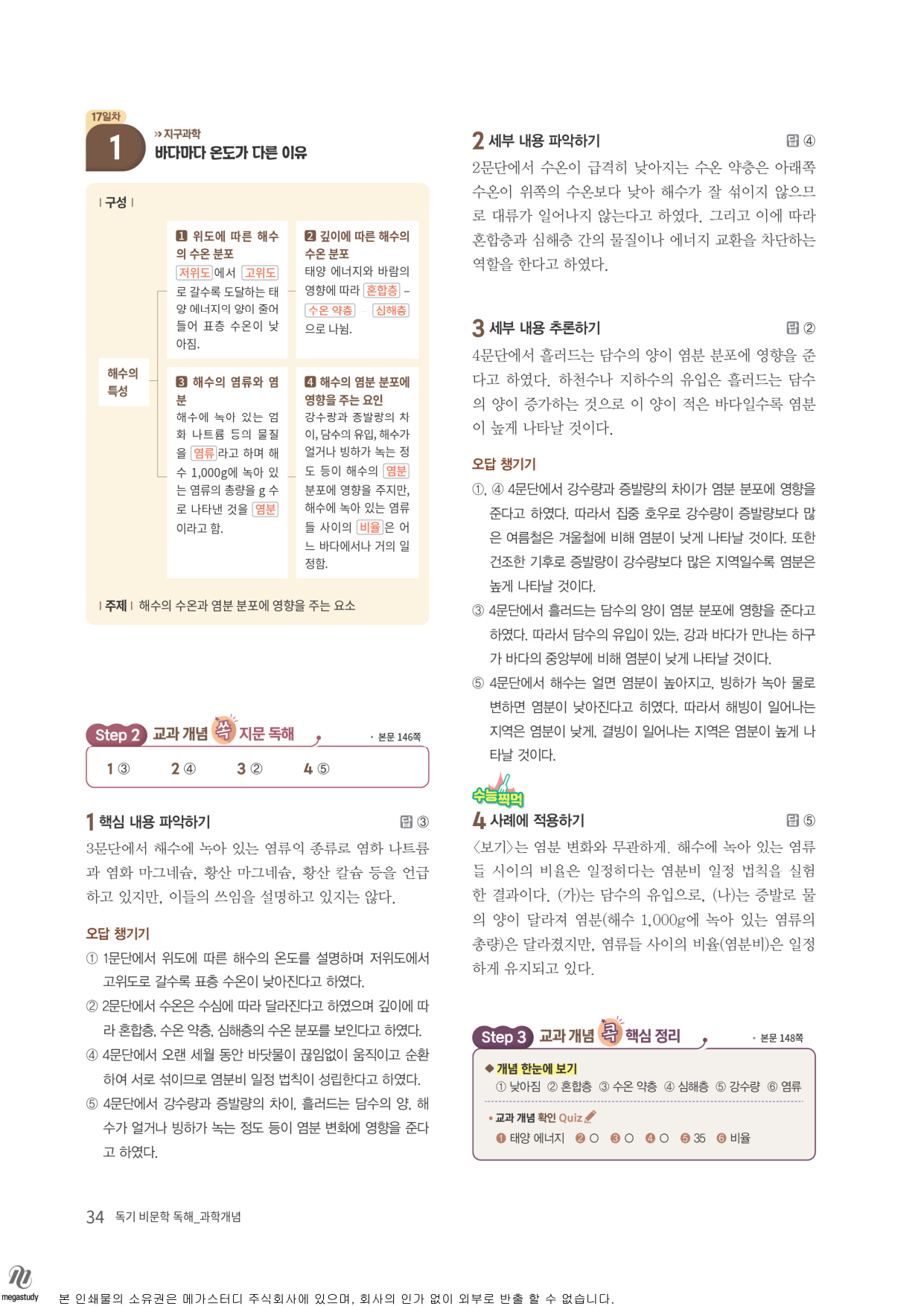 ‘Step 1. 교과 개념 톡 생각 열기 → Step 2. 교과 개념 쏙 지문 독해 → Step 3. 교과 개념 콕 핵심 정리’를 통한 체계적인 학습이 가능합니다. 또한 세부적인 독해 학습을 위해 지문의 구조와 문단별 중심 내용을 정리할 수 있는 빈칸 문제를 제공하여 학생들이 독해 과정을 스스로 체크할 수 있도록 하였습니다.