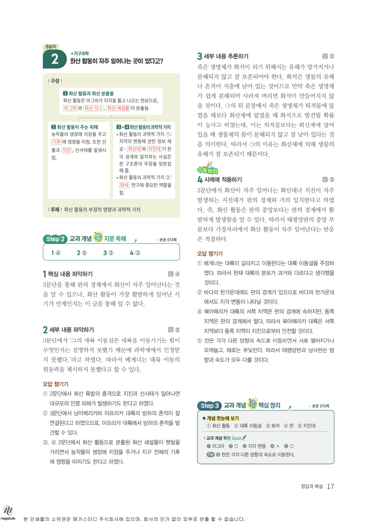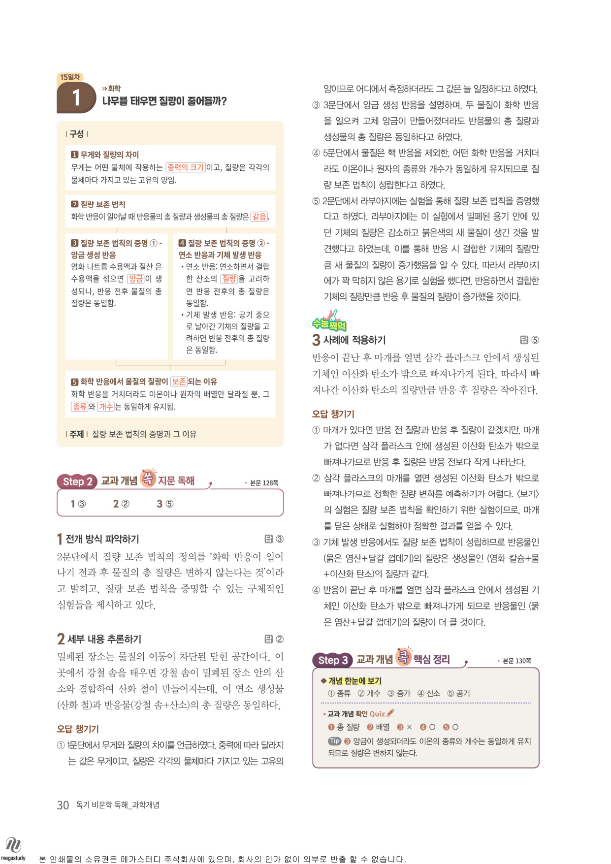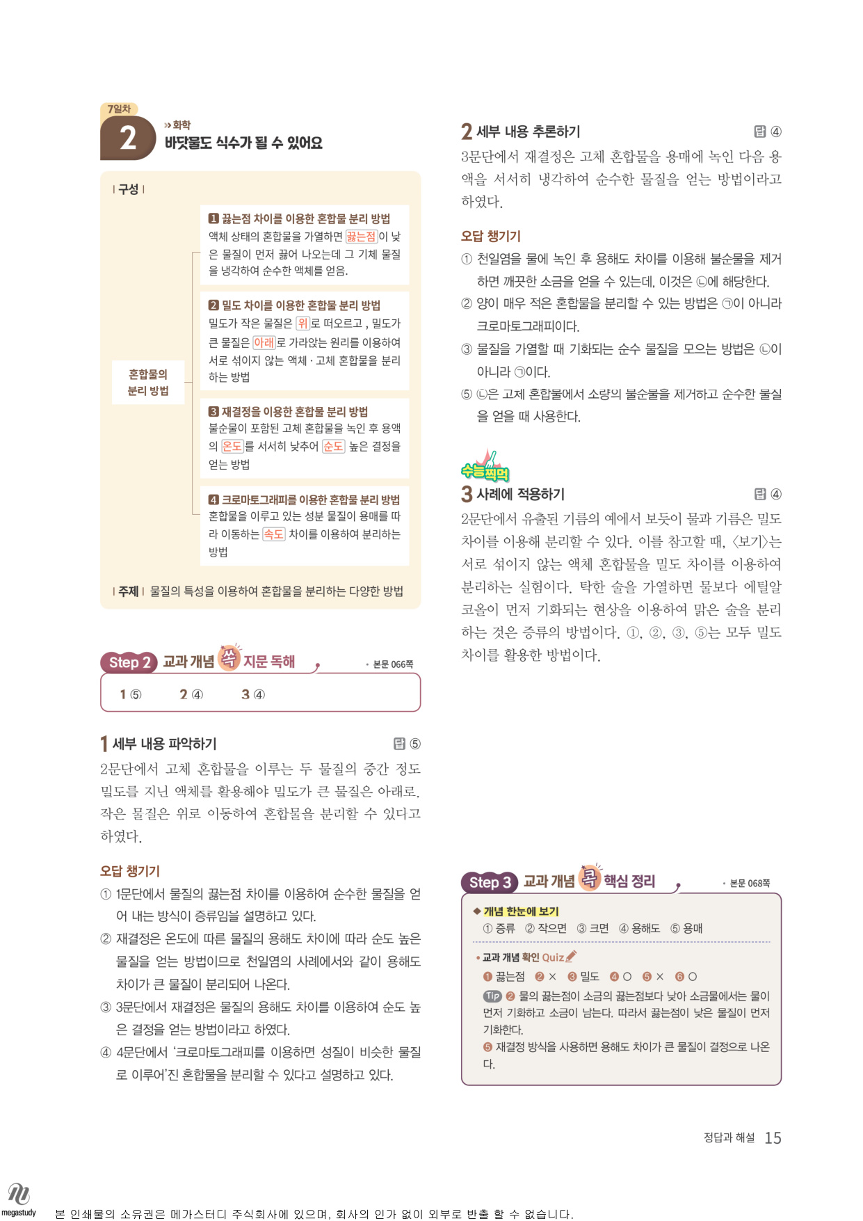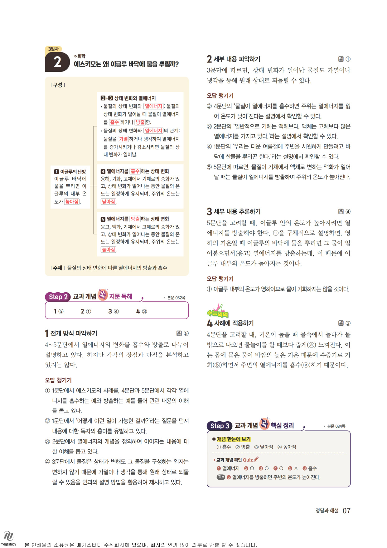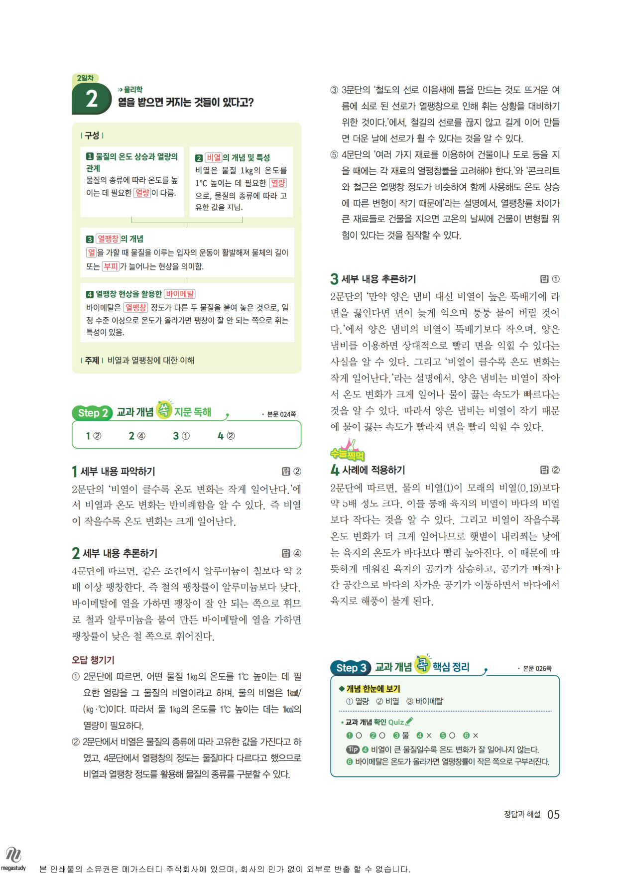 ‘Step 1. 교과 개념 톡 생각 열기 → Step 2. 교과 개념 쏙 지문 독해 → Step 3. 교과 개념 콕 핵심 정리’를 통한 체계적인 학습이 가능합니다. 또한 세부적인 독해 학습을 위해 지문의 구조와 문단별 중심 내용을 정리할 수 있는 빈칸 문제를 제공하여 학생들이 독해 과정을 스스로 체크할 수 있도록 하였습니다.
