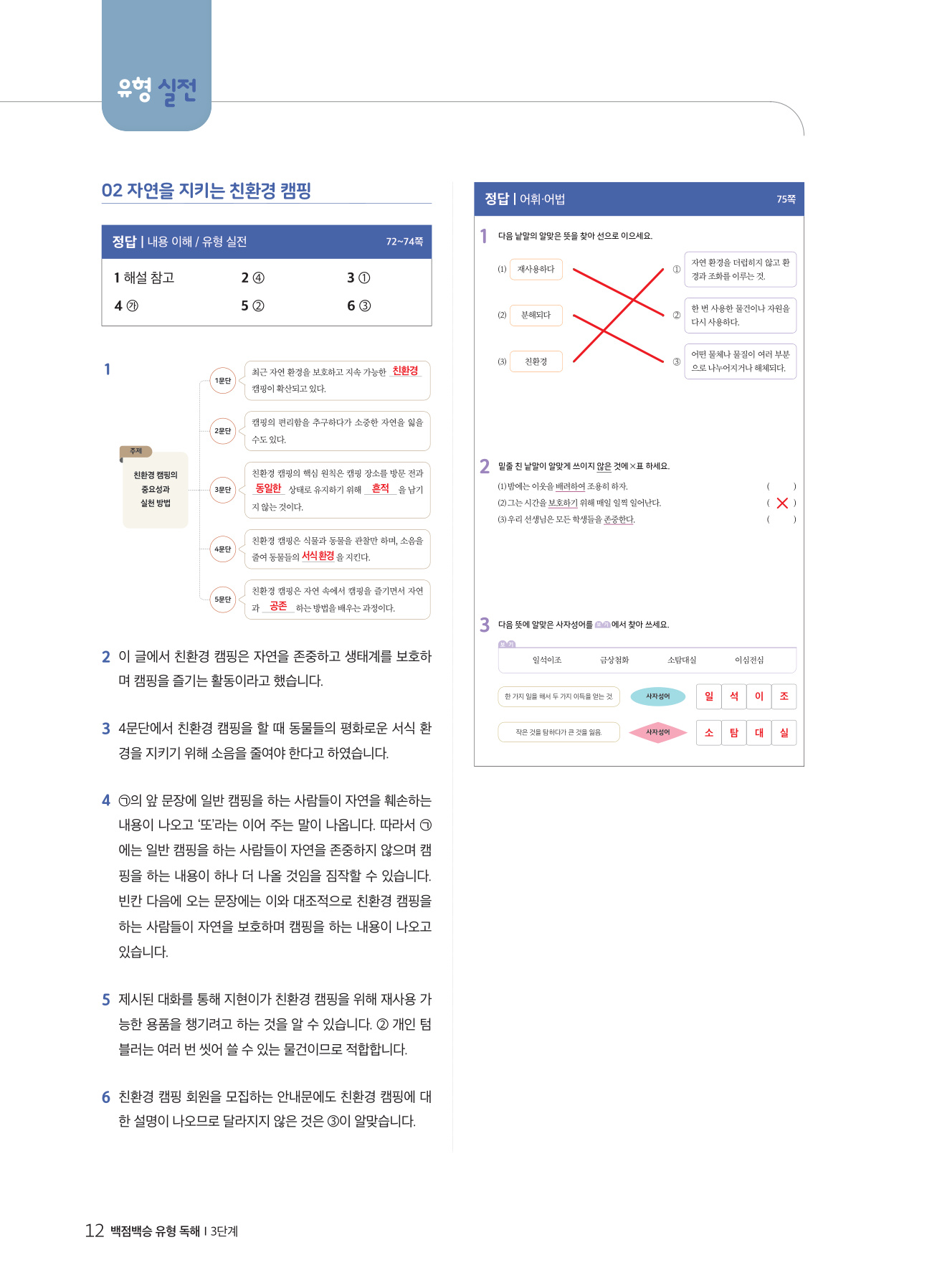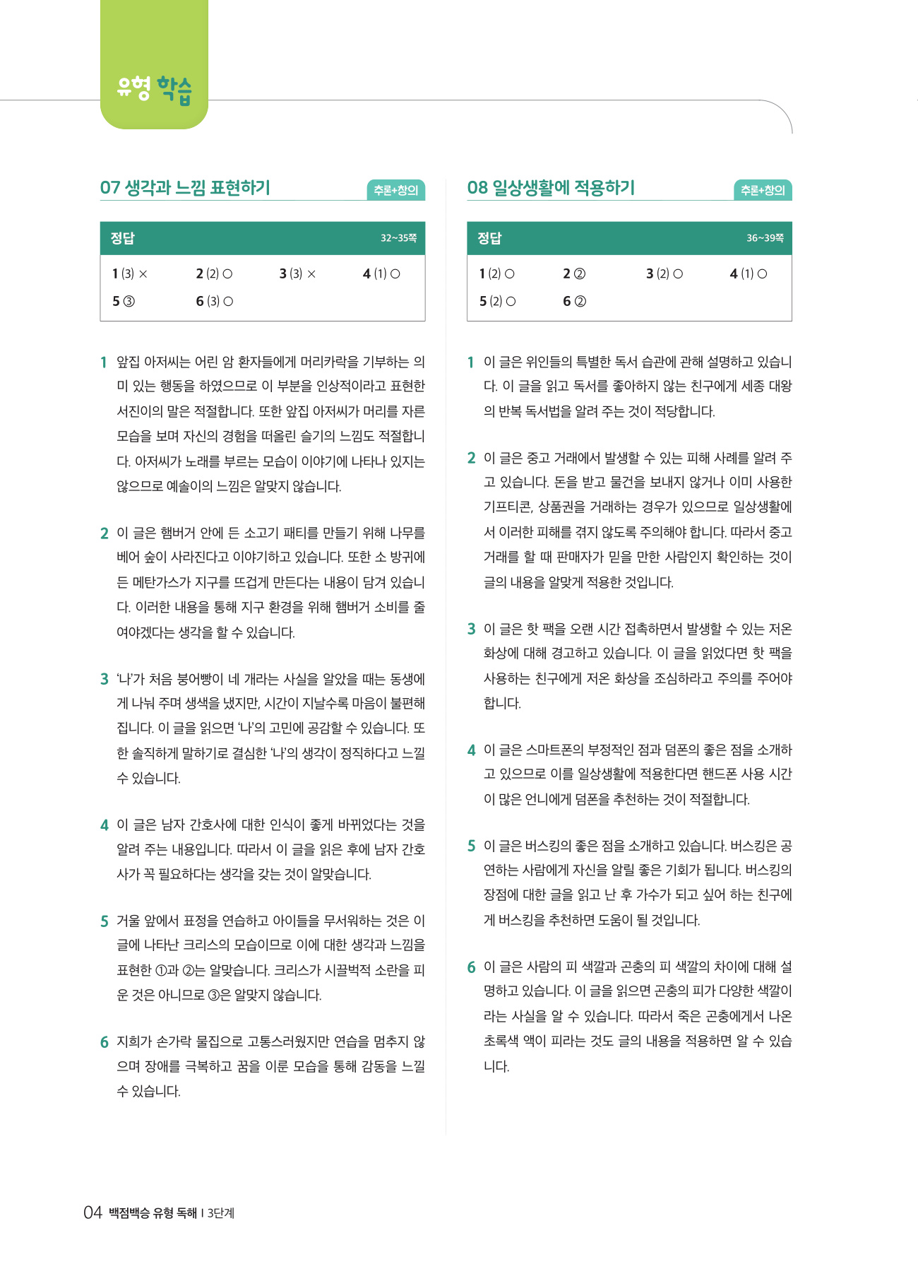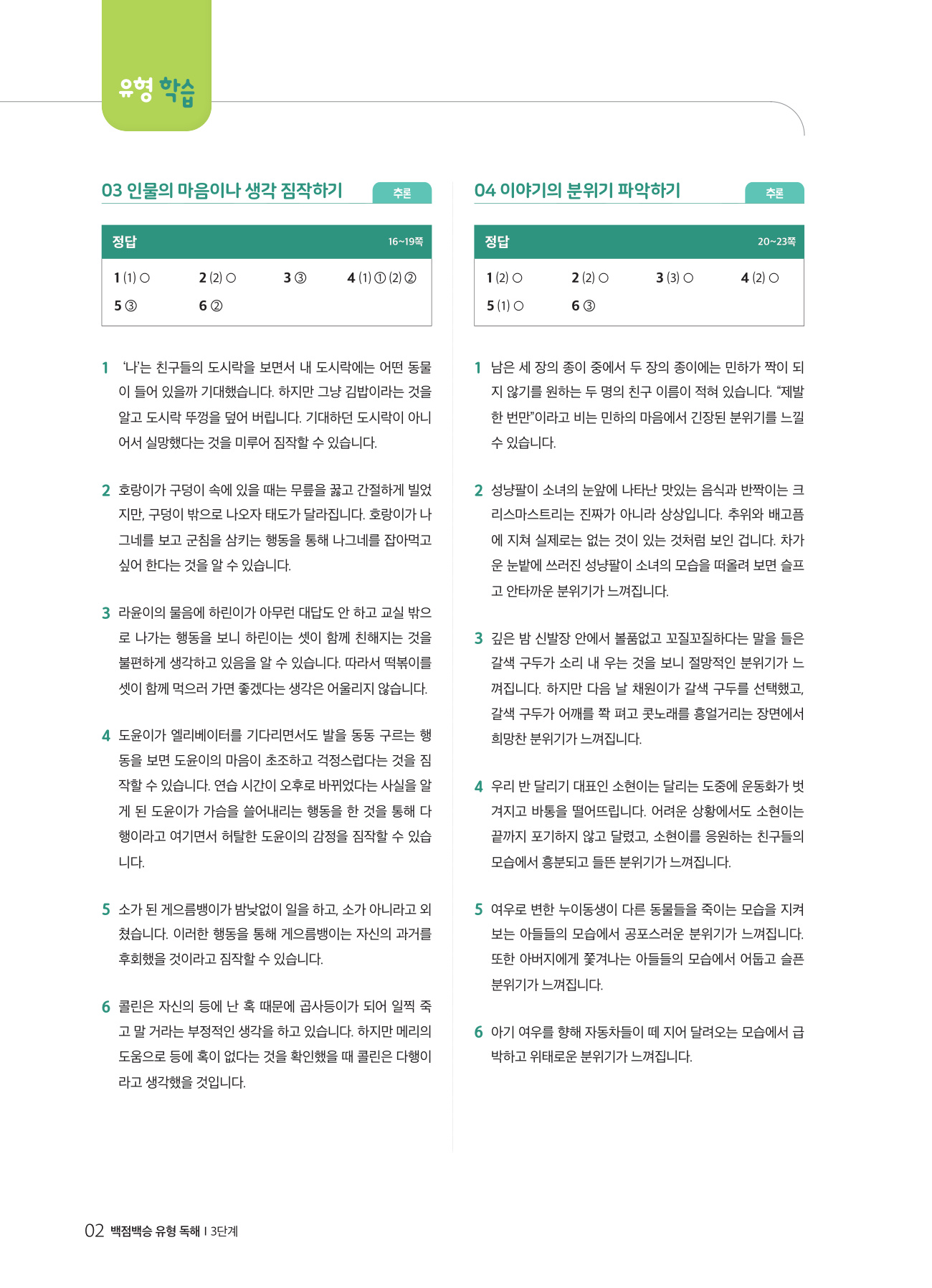 독해력은 모든 학습 능력의 기초입니다. 독해력이 뛰어난 학생은 단순히 겉에 드러난 내용을 이해하는 것에서 나아가 지문과 문제 속에 드러나지 않은 핵심까지 추론하고, 비판적으로 분석하고, 응용 문제를 창의적으로 해결합니다. 독해력을 키우려면 사실 독해를 바탕으로 추론·비판·창의 독해까지 체계적으로 학습해야 합니다. 『백점백승 유형 독해』에서는 고차원 독해 능력을 키우기 위하여 추론·비판·창의 독해 전략을 집중적으로 훈련합니다.