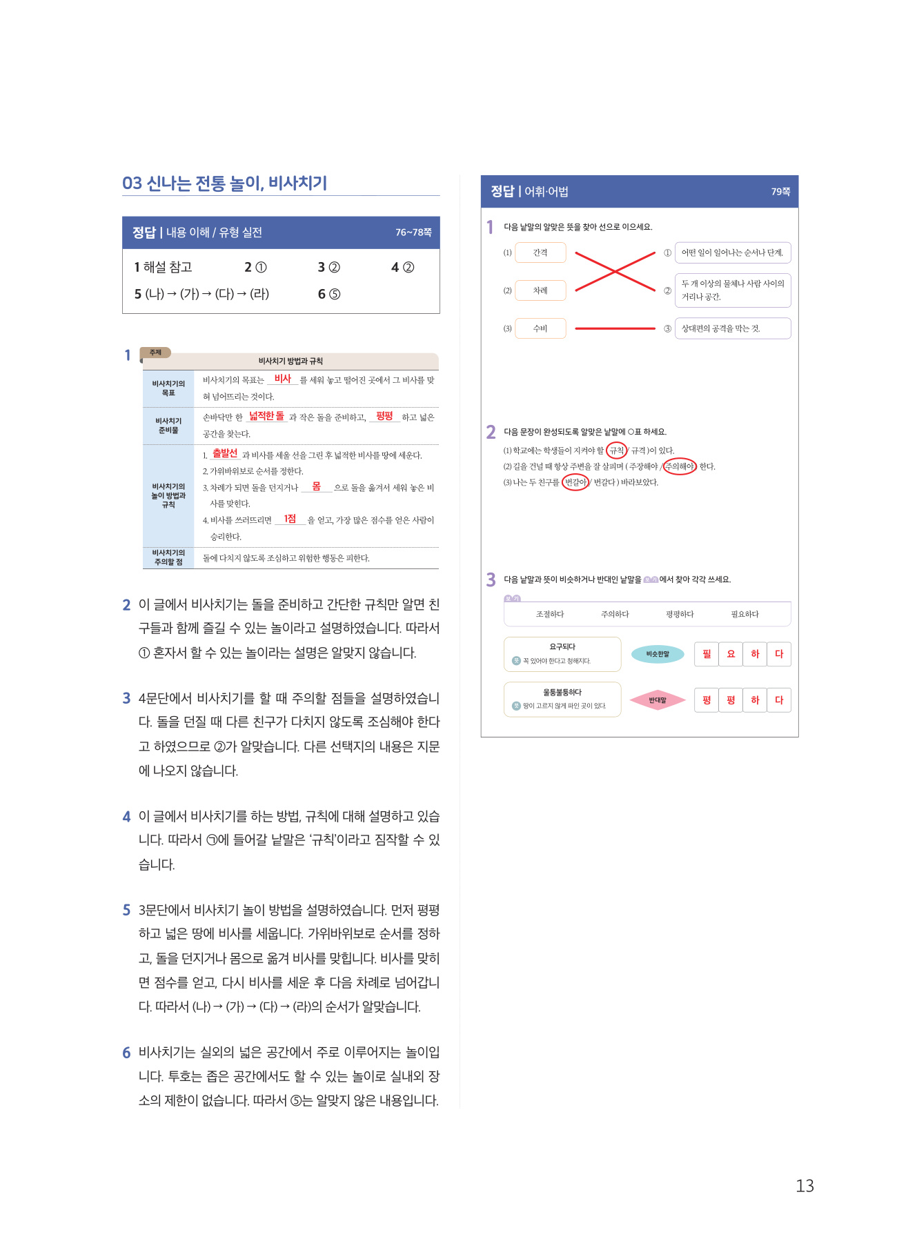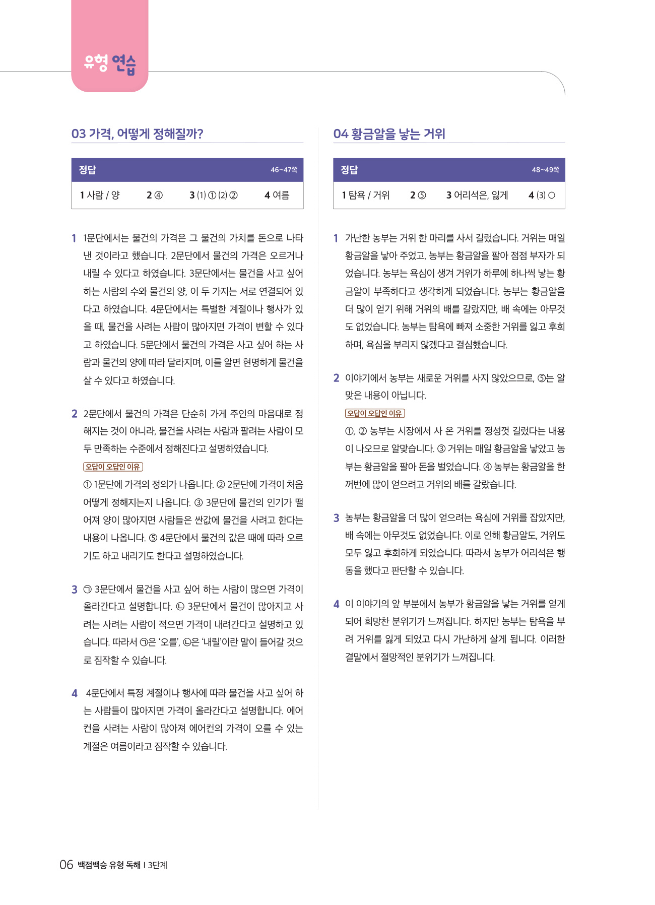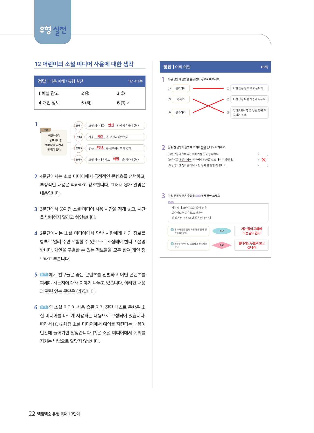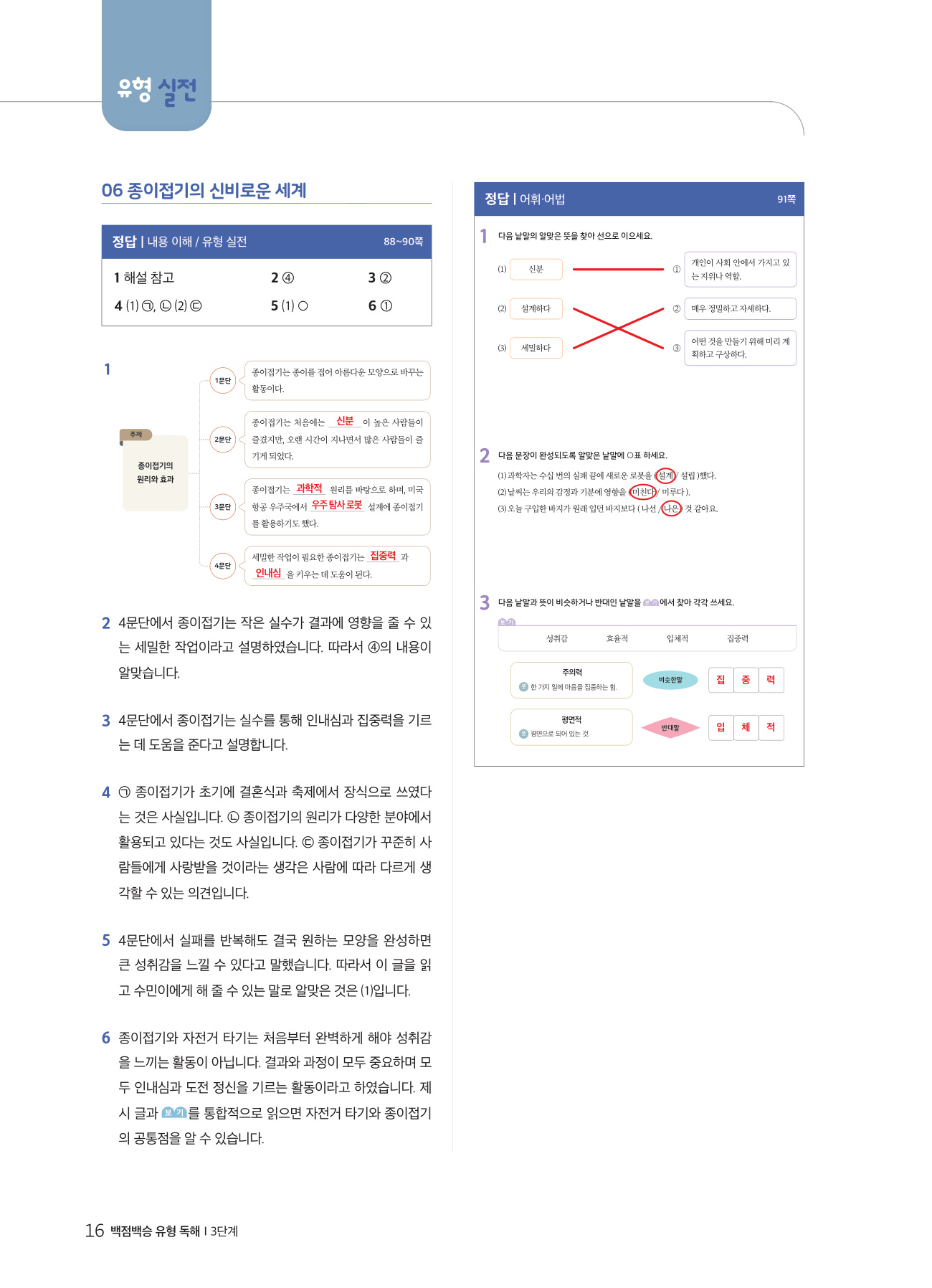 독해력은 모든 학습 능력의 기초입니다. 독해력이 뛰어난 학생은 단순히 겉에 드러난 내용을 이해하는 것에서 나아가 지문과 문제 속에 드러나지 않은 핵심까지 추론하고, 비판적으로 분석하고, 응용 문제를 창의적으로 해결합니다. 독해력을 키우려면 사실 독해를 바탕으로 추론·비판·창의 독해까지 체계적으로 학습해야 합니다. 『백점백승 유형 독해』에서는 고차원 독해 능력을 키우기 위하여 추론·비판·창의 독해 전략을 집중적으로 훈련합니다.