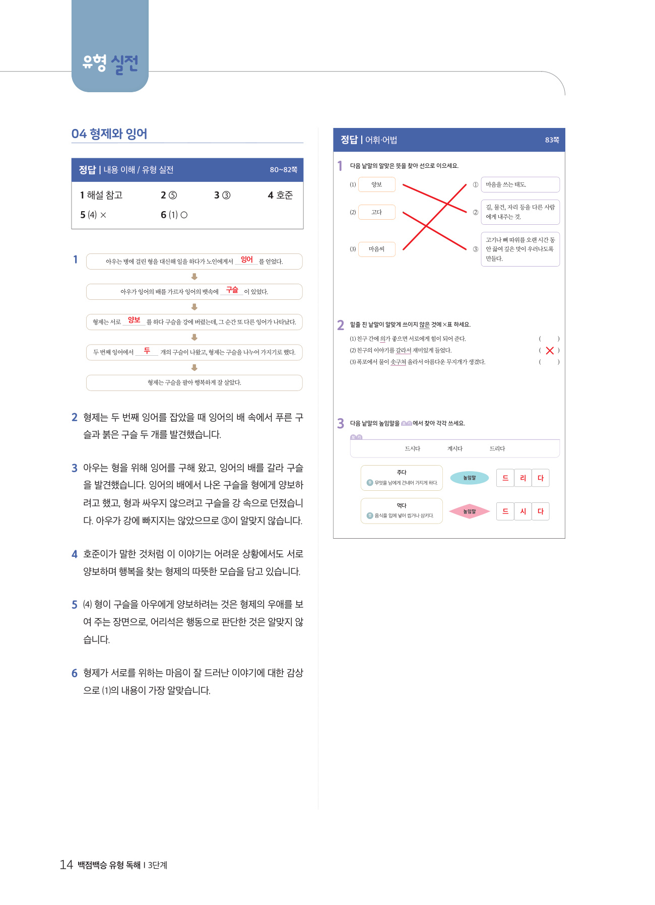 무작정 독해 문제집을 많이 푼다고 독해력이 키워지지 않습니다. 아이들이 어려워하는 문제 유형은 정해져 있습니다. 『백점백승 유형 독해』는 [유형 학습]-[유형 연습]-[유형 실전]의 3단계로 구성되어 있습니다. [유형 학습]에서 약 56개의 지문으로 문제 유형을 익히고, [유형 연습]에서 학습한 내용을 문제 풀이에 적용합니다. [유형 실전]에서는 내용 구조화, 사실·추론·비판·창의 독해, 어휘·어법 학습으로 독해 실력을 강화합니다.