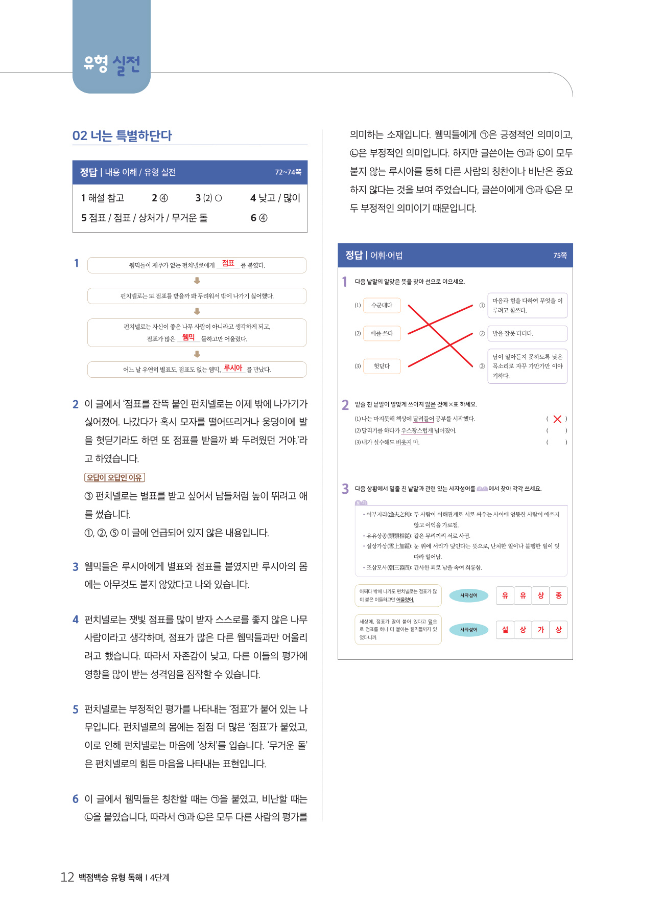 독해력은 모든 학습 능력의 기초입니다. 독해력이 뛰어난 학생은 단순히 겉에 드러난 내용을 이해하는 것에서 나아가 지문과 문제 속에 드러나지 않은 핵심까지 추론하고, 비판적으로 분석하고, 응용 문제를 창의적으로 해결합니다. 독해력을 키우려면 사실 독해를 바탕으로 추론·비판·창의 독해까지 체계적으로 학습해야 합니다. 『백점백승 유형 독해』에서는 고차원 독해 능력을 키우기 위하여 추론·비판·창의 독해 전략을 집중적으로 훈련합니다.