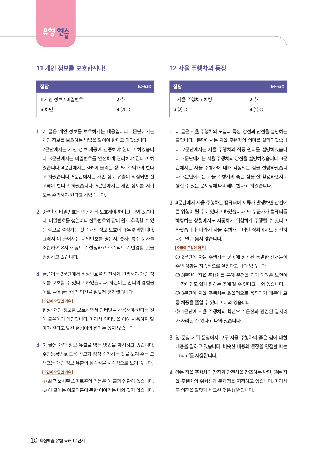 독해력은 모든 학습 능력의 기초입니다. 독해력이 뛰어난 학생은 단순히 겉에 드러난 내용을 이해하는 것에서 나아가 지문과 문제 속에 드러나지 않은 핵심까지 추론하고, 비판적으로 분석하고, 응용 문제를 창의적으로 해결합니다. 독해력을 키우려면 사실 독해를 바탕으로 추론·비판·창의 독해까지 체계적으로 학습해야 합니다. 『백점백승 유형 독해』에서는 고차원 독해 능력을 키우기 위하여 추론·비판·창의 독해 전략을 집중적으로 훈련합니다.
