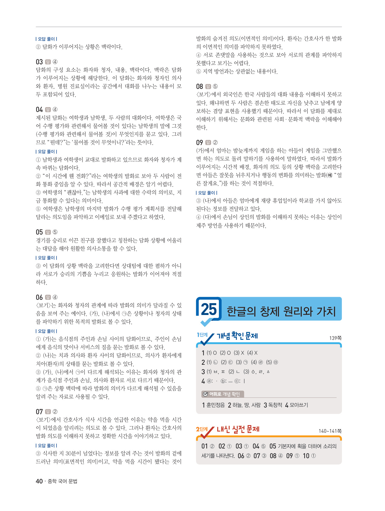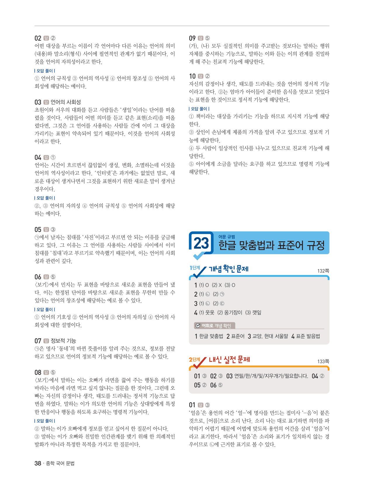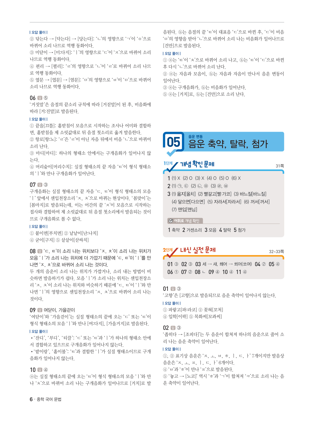 : 간단한 개념 확인 문제부터 실전 대비를 위한 내신 실전 문제, 심화 학습을 위한 통합형 문제를 단계별로 수록하였습니다. 중학교 내신 유형뿐만 아니라 학업성취도 평가, 수능 기출 문제까지 수록하여 다양한 문제를 풀어 보면서 앞서 이해한 개념을 적용해 볼 수 있도록 하였습니다.
