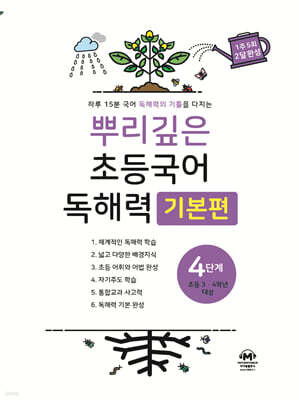 마더텅에서 발행한 뿌리깊은 초등국어 독해력 기본편 4단계는 초등학교 3학년과 4학년 학생들의 독해 완성도를 높이기 위해 기획된 독해 심화서입니다. 이 교재는 하루 15분에서 20분 정도의 꾸준한 학습을 통해 문장 이해력과 문단 분석력을 체계적으로 길러주며 8주 완성 과정을 목표로 합니다. 설명문 논설문 시 소설 등 교과서 안팎의 다양한 갈래를 다루어 학생들의 시야를 넓혀주고 중등 독해의 기초를 탄탄하게 세워주는 단계별 학습서입니다.