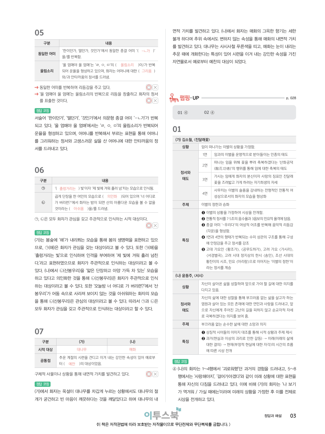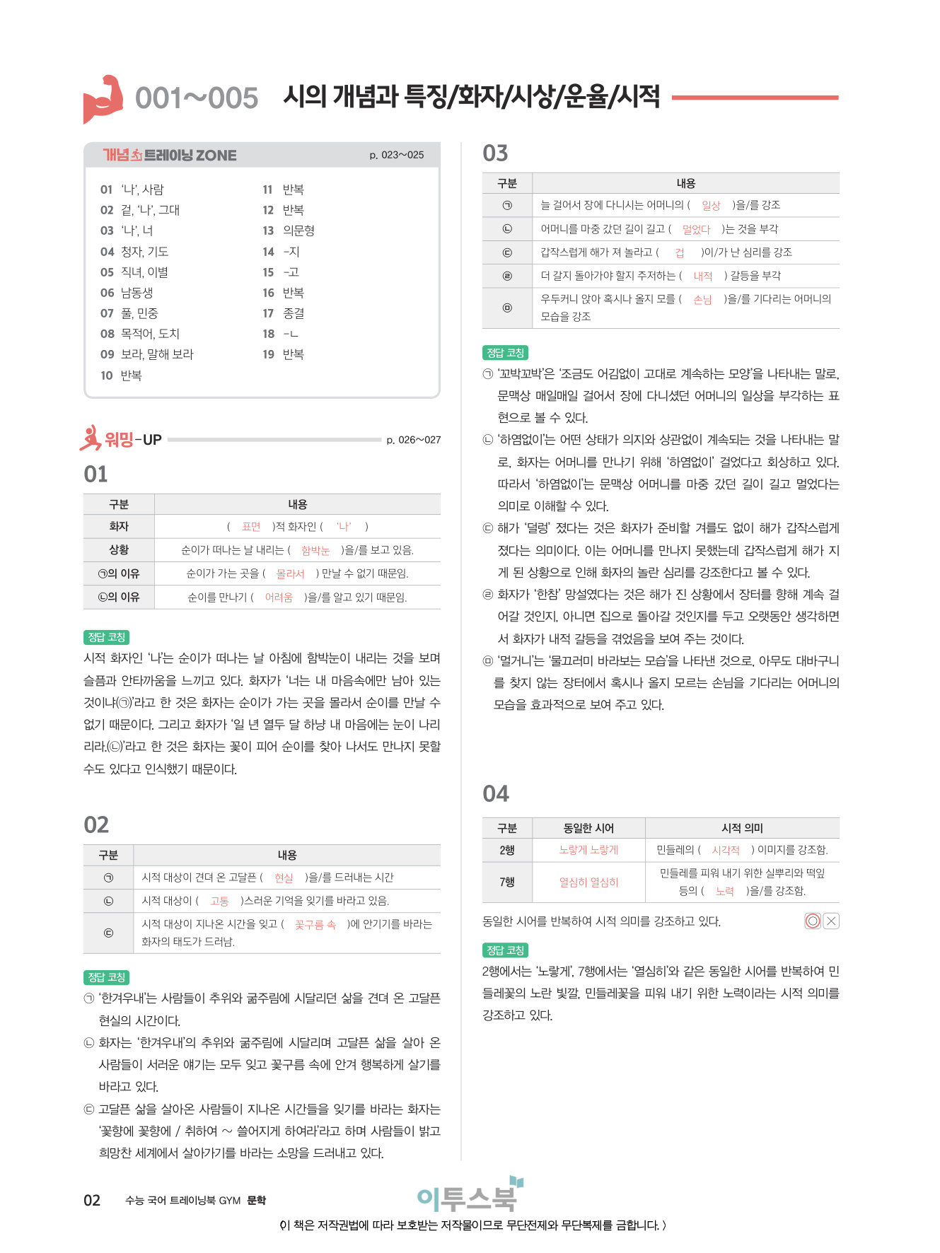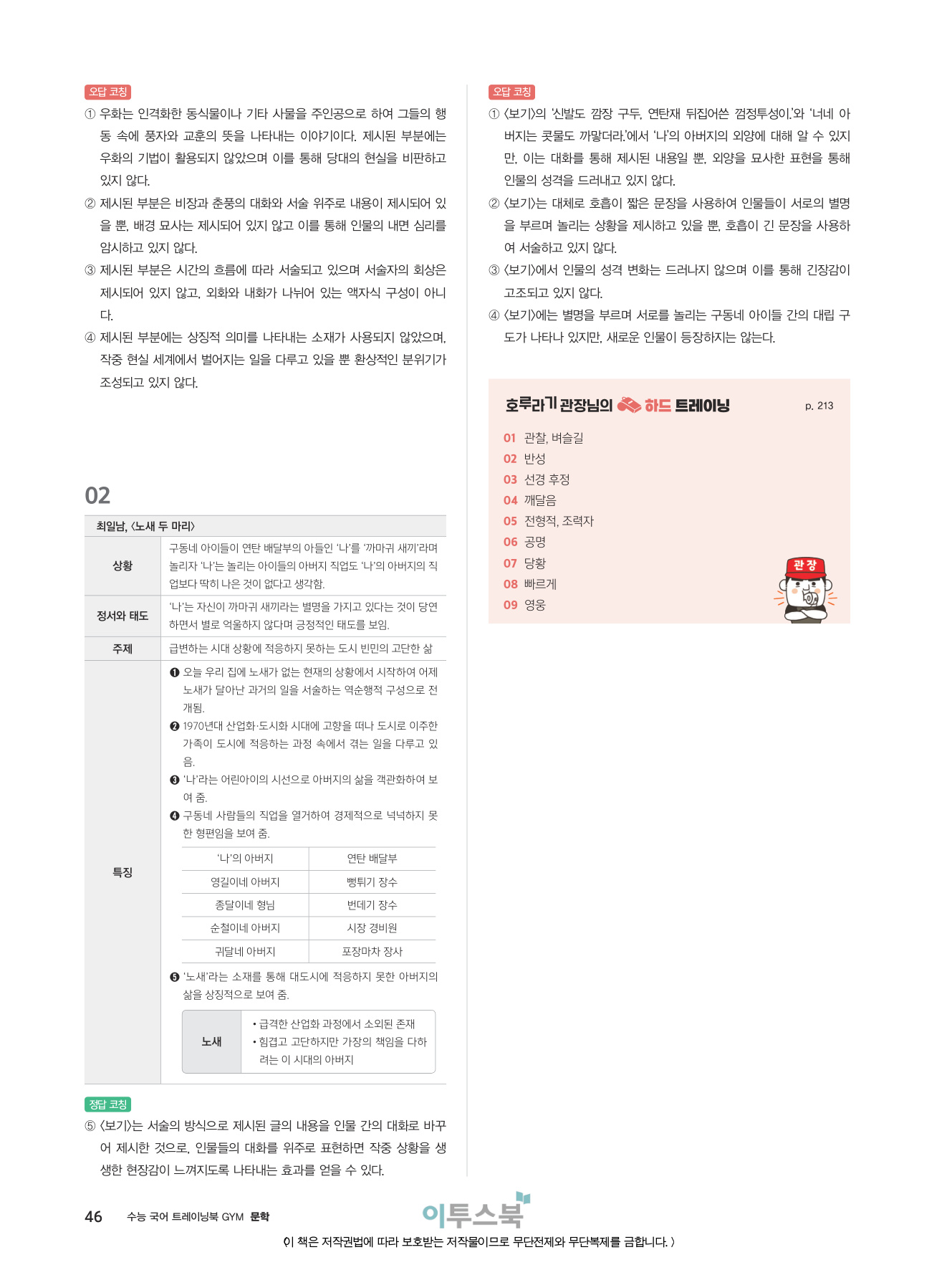 _분석적 작품 읽기 훈련을 통해 지문을 문장 단위, 장면 단위로 이해하고 표현상의 특징을 파악하는 연습을 집중적으로 할 수 있습니다.