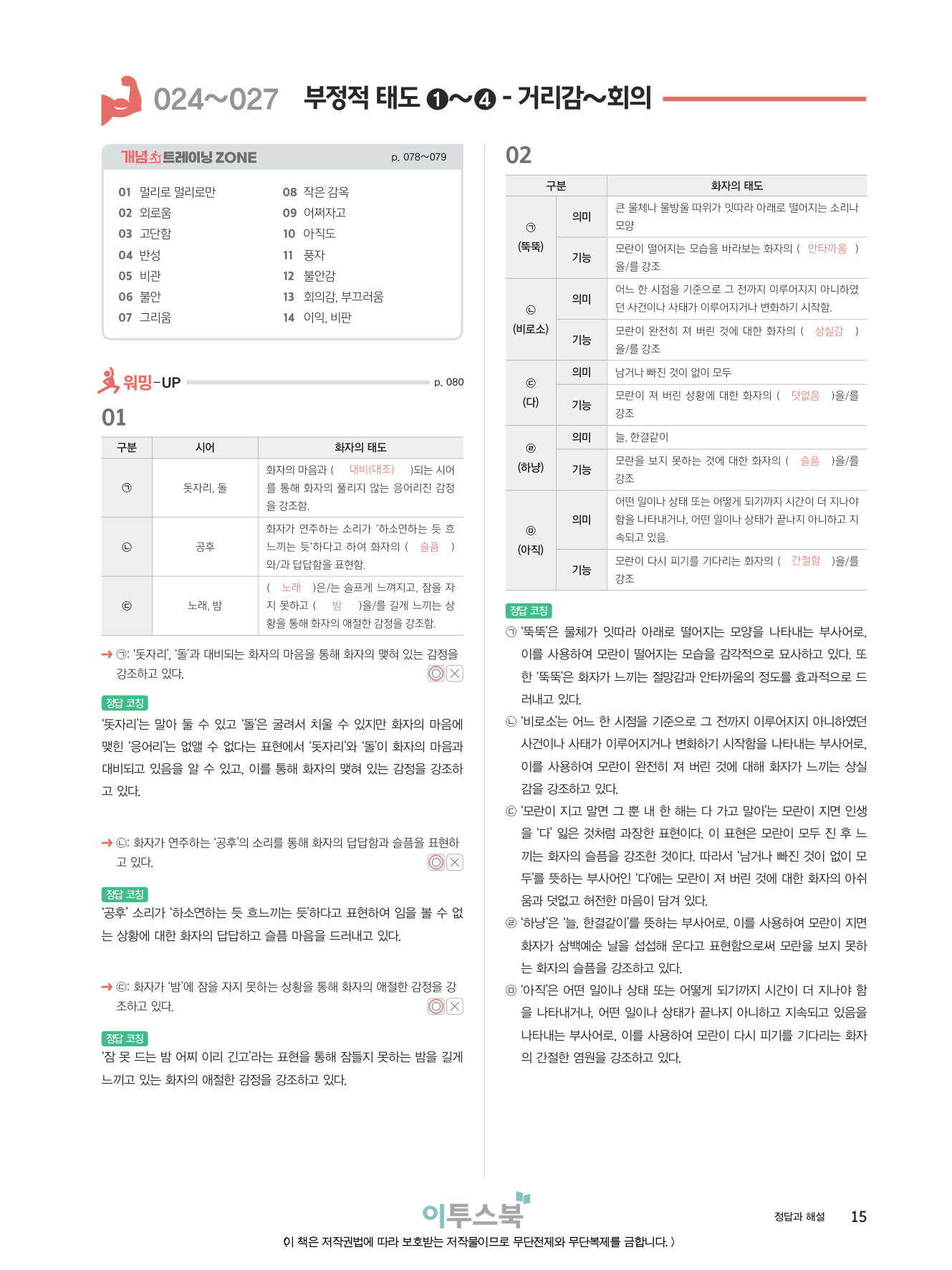 024~027 부정적 태도 (1)(거리감~도피) / (2)(두려움~상실감) / (3)(소외감~이기적) / (4)(이질감~회의)