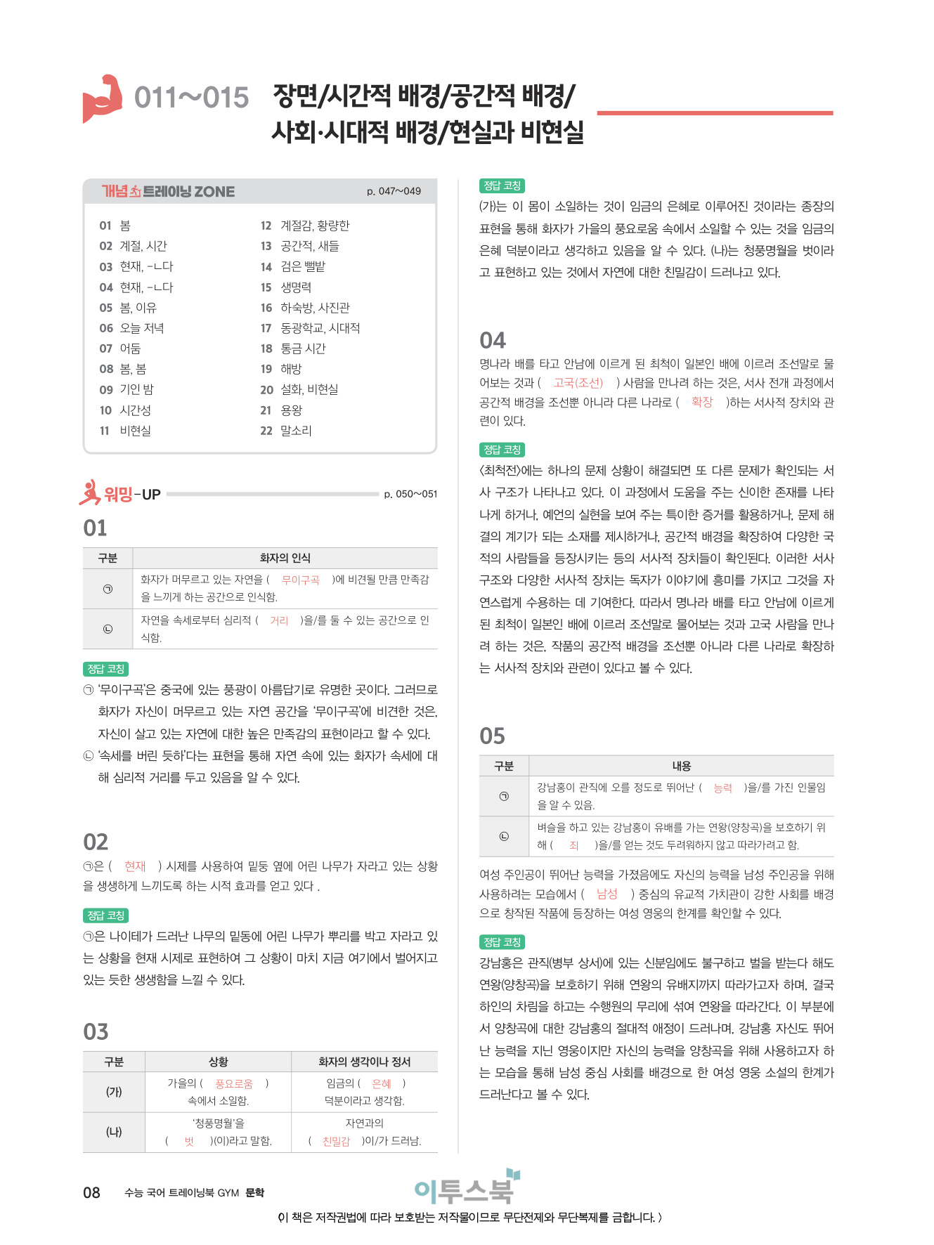 011~015 장면 / 시간적 배경 / 공간적 배경 / 사회 · 시대적 배경 / 현실과 비현실