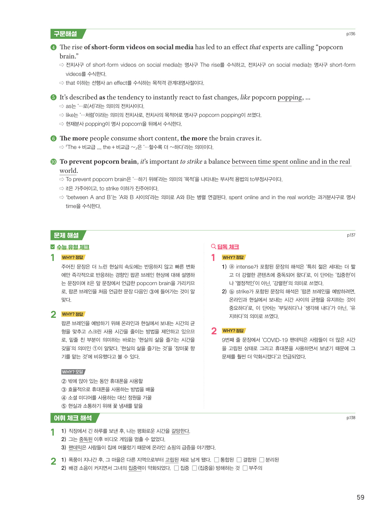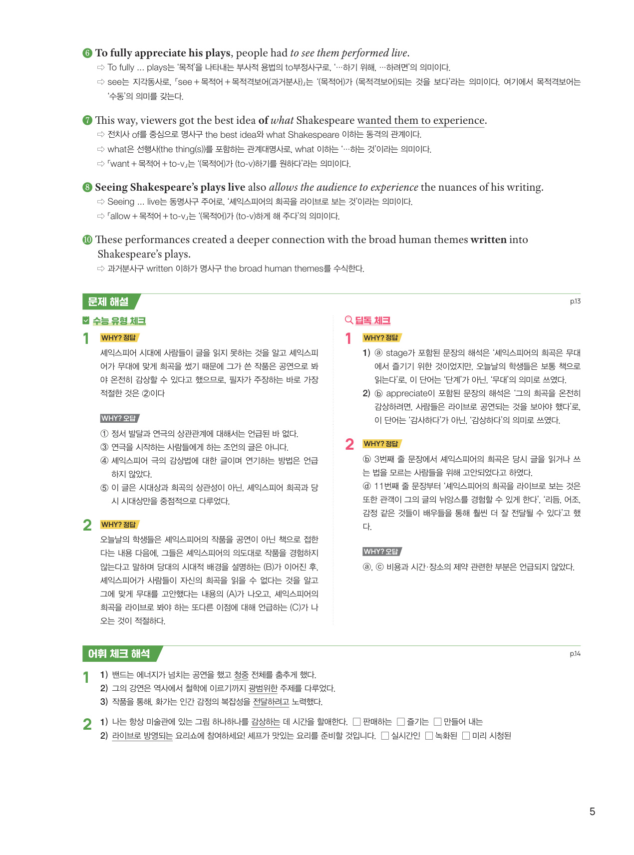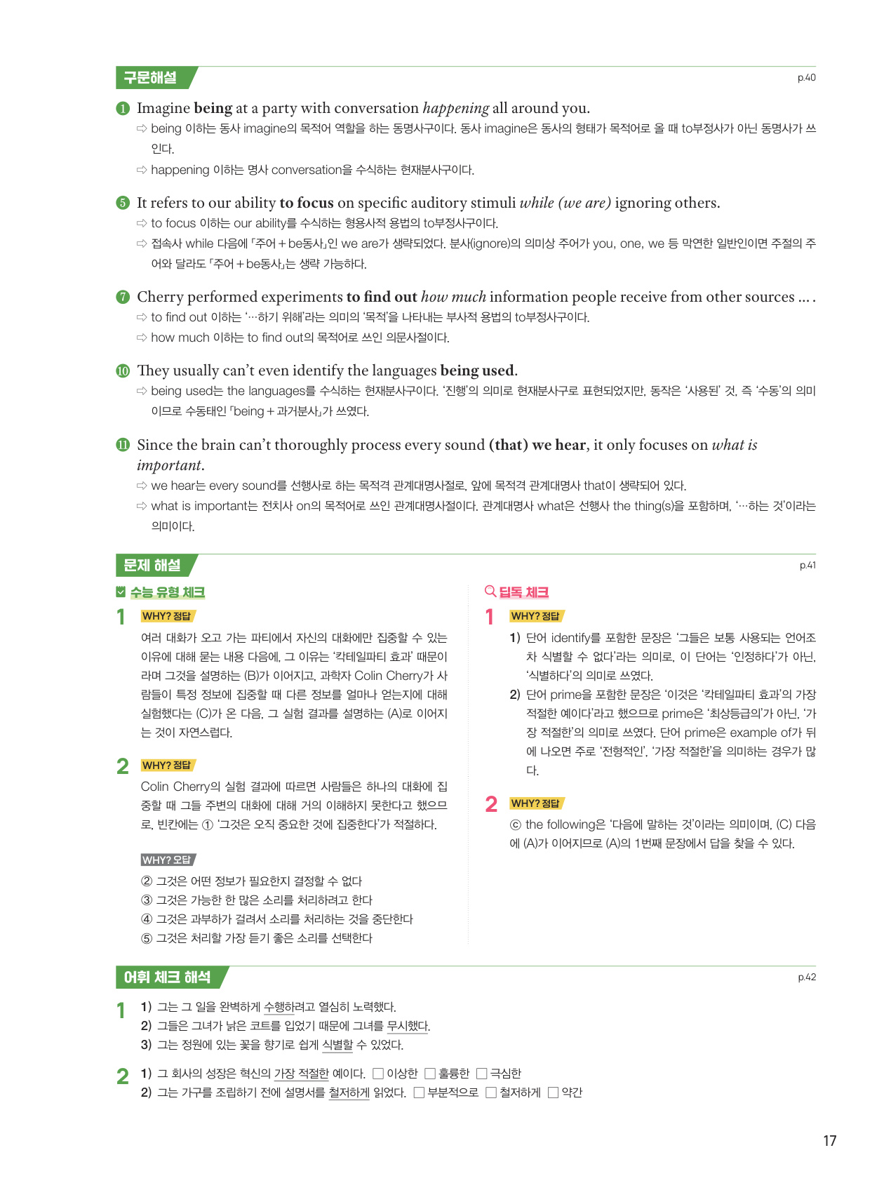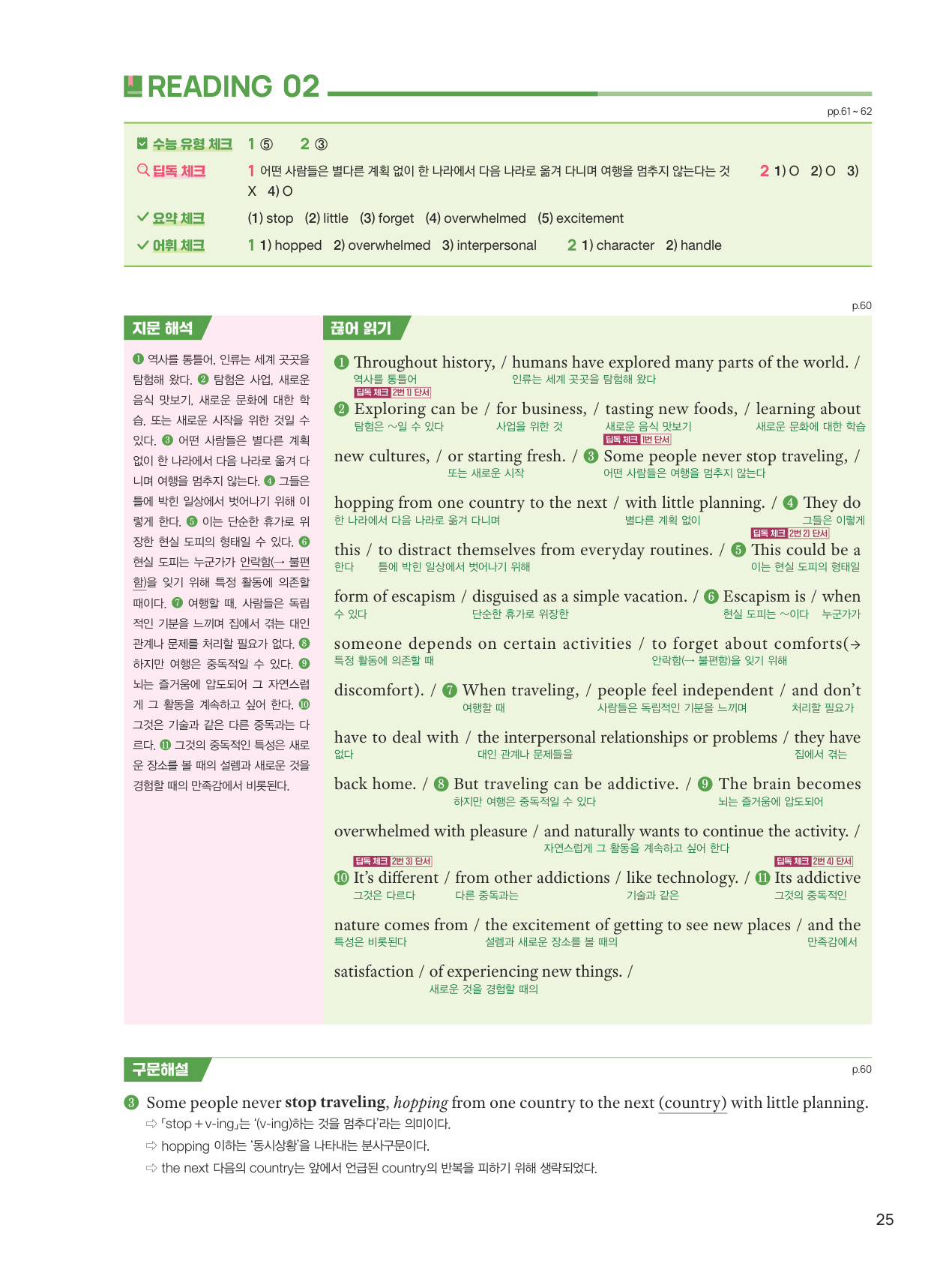 수능 영어 지문에 대한 학습자들의 최신 반응을 살펴보면 ‘해석은 되었으나, 답을 고르기 어렵다’는 응답이 많습니다. 이는 지문에 대한 제대로 된 소화과정을 거치지 못했기 때문입니다. 수능 영어 지문은 이제 “꼼꼼하고” “정확하게” 읽어야 하며, 지시하는 부분과 글쓴이의 의도를 추론하는 근거를 명확히 알아야 합니다. 수능 딥독은 학습자가 글을 제대로 소화하기 위한 코너를 곳곳에 마련했습니다. 충실히 따라와 준다면, 딥독의 과정은 체화되어 수능 영어 독해력의 기초 체력을 튼튼하게 해 줄 것입니다.