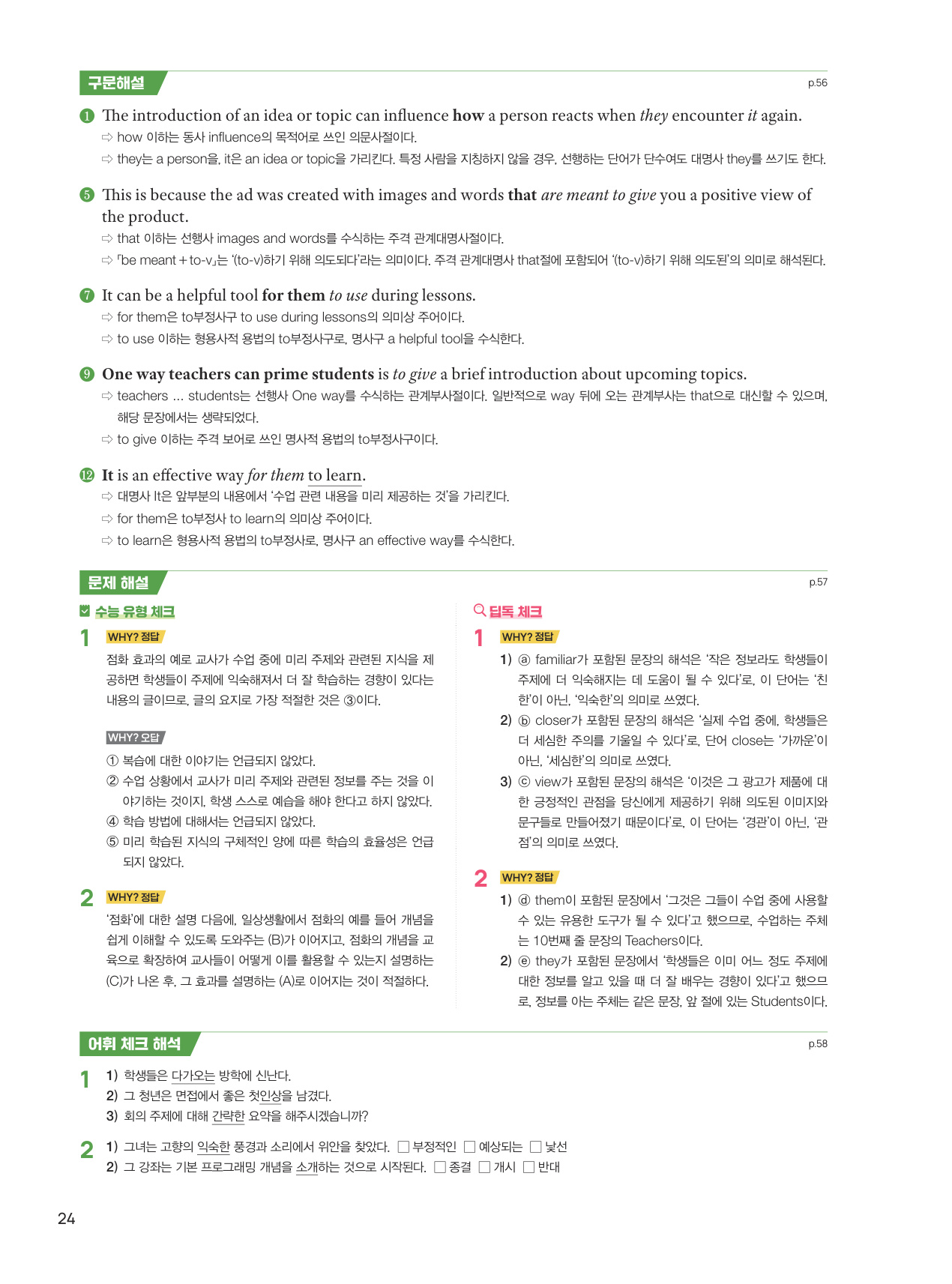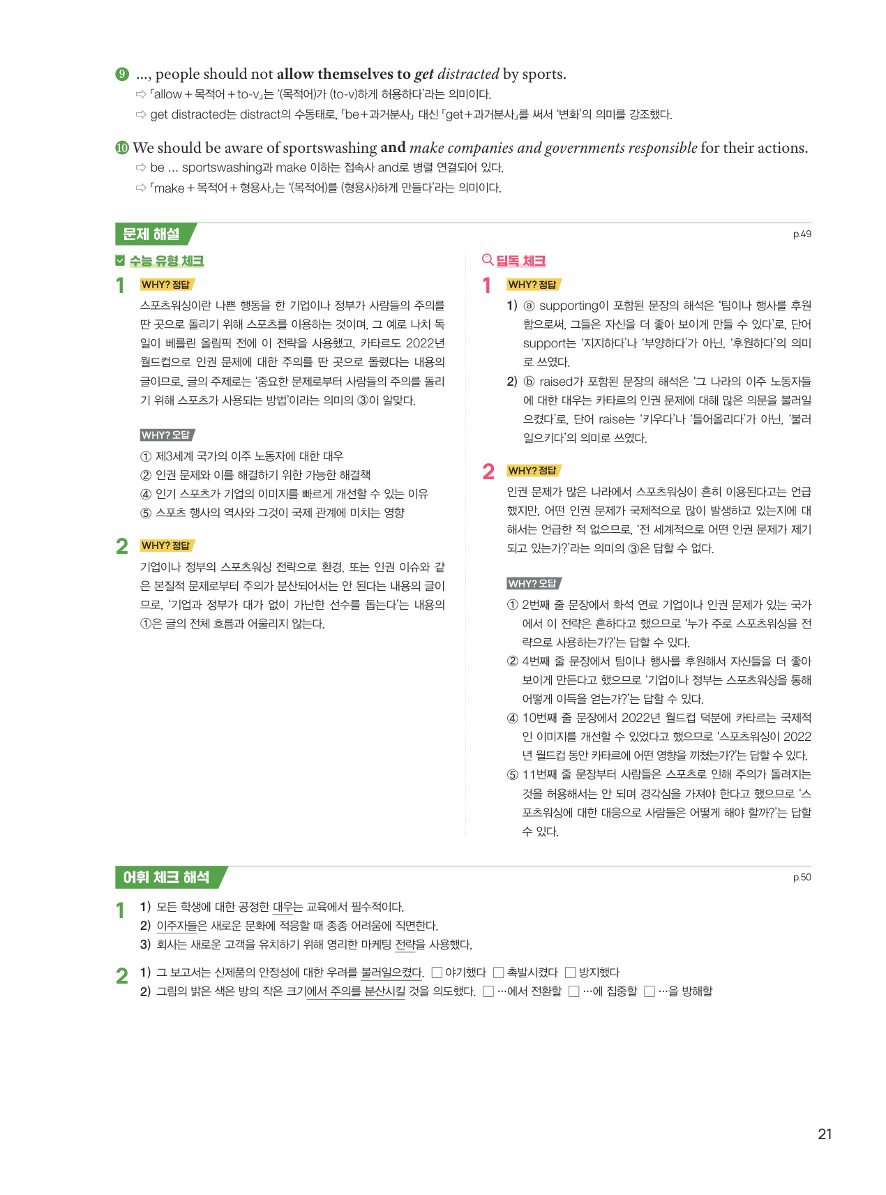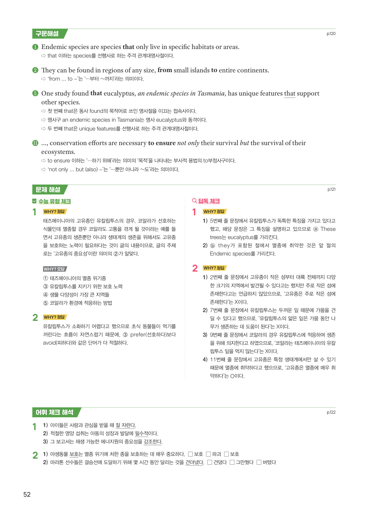 수능 영어는 선지에서 다의어를 사용하거나, 지문에서 등장한 단어의 유의어 또는 반의어가 쓰여 답을 고르기 어려운 경우가 많습니다. 학습자들은 단어의 뉘앙스를 구별하고 의미를 확장시킬 수 있는 수능 딥독의 다양한 코너를 통해 단어에 대한 자신감을 키울 수 있습니다