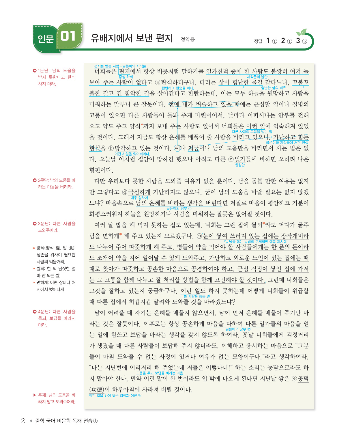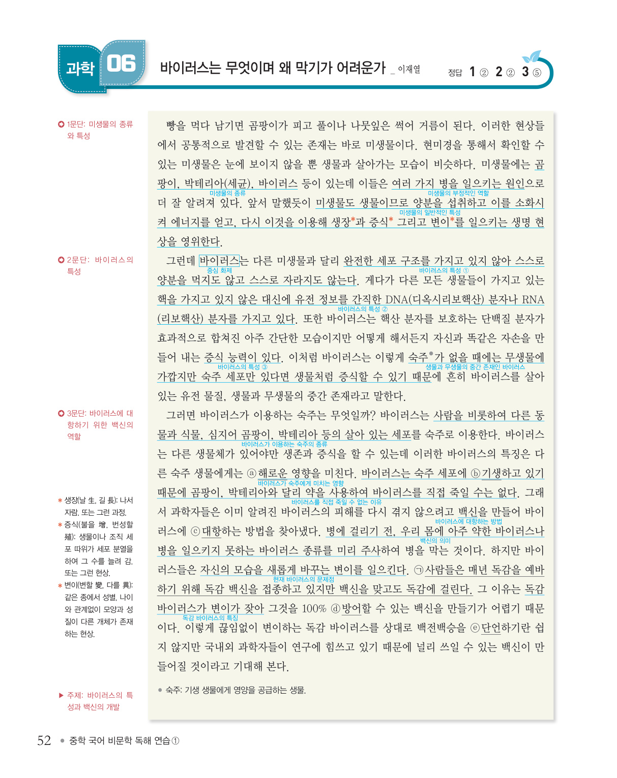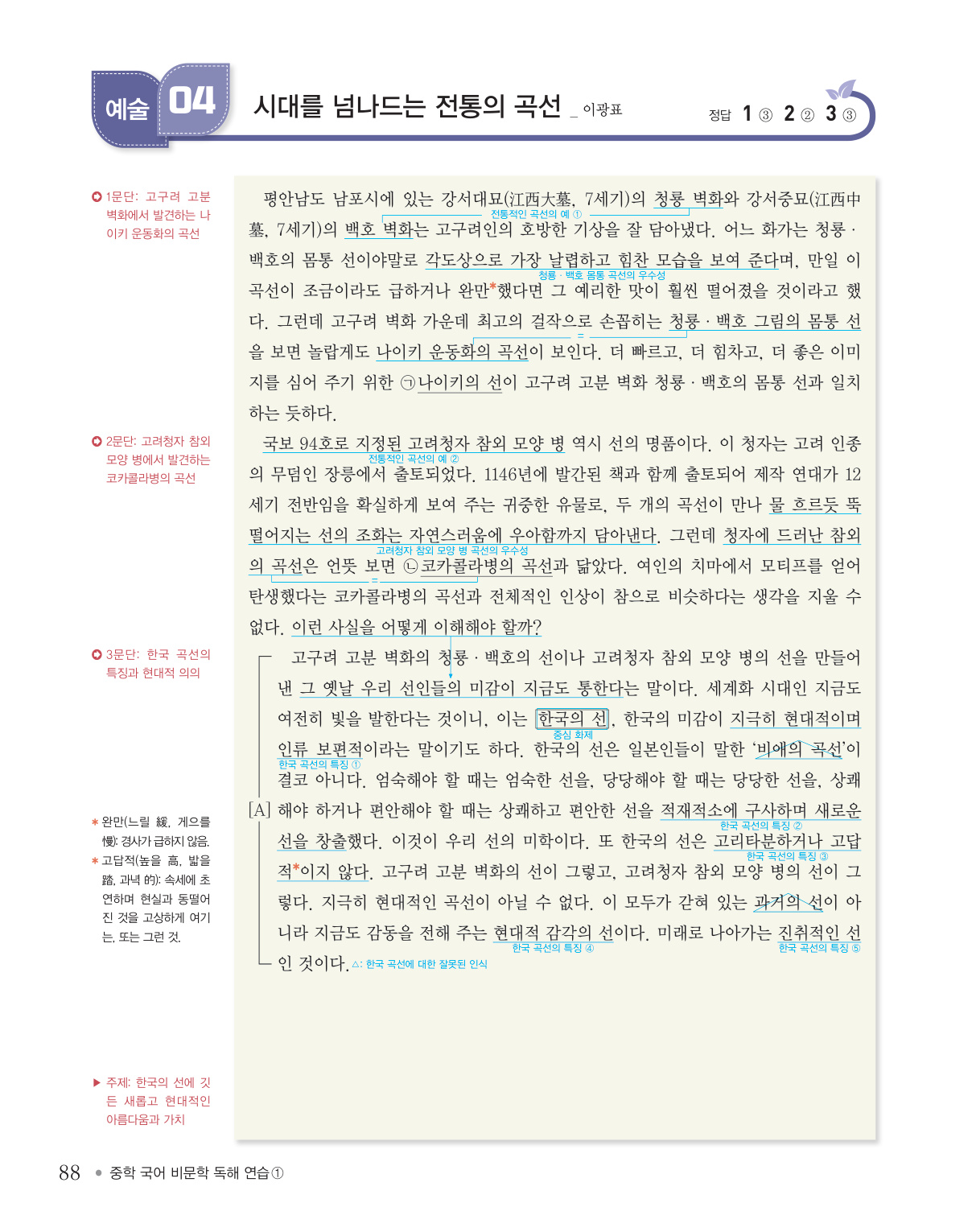 혼자 공부하더라도 어렵지 않도록 수록된 모든 지문을 행간주를 통해 분석하여 구성하였으므로 이 책의 해설을 최대한 활용하기 바랍니다. 또한 학부모나 선생님들의 수업 및 학습 지도 자료로 활용할 때 큰 효과를 거둘 수 있도록 지문 해제, 문단 요지, 주제, 정답 풀이, 오답 풀이 등도 상세하게 수록하였습니다.