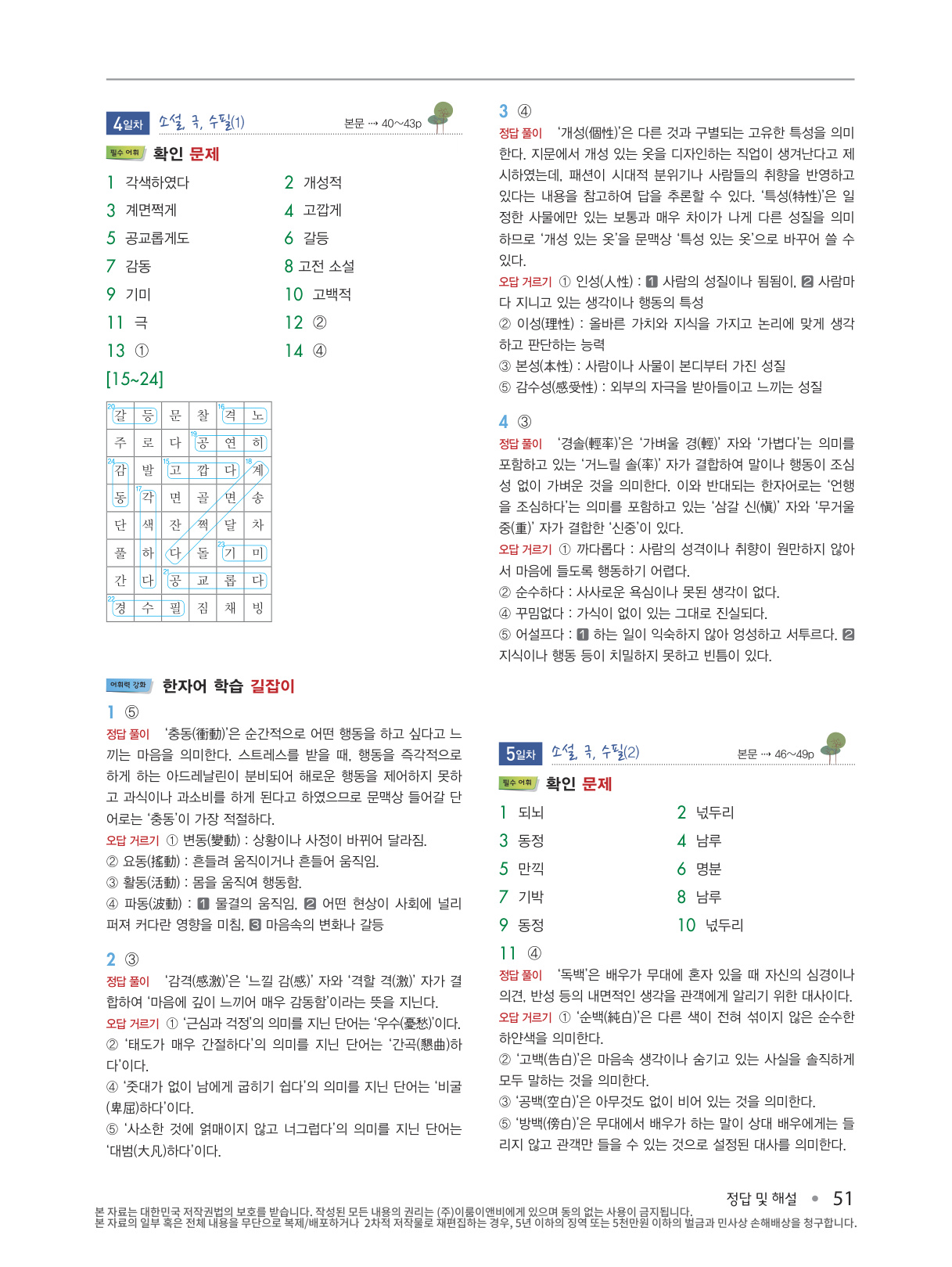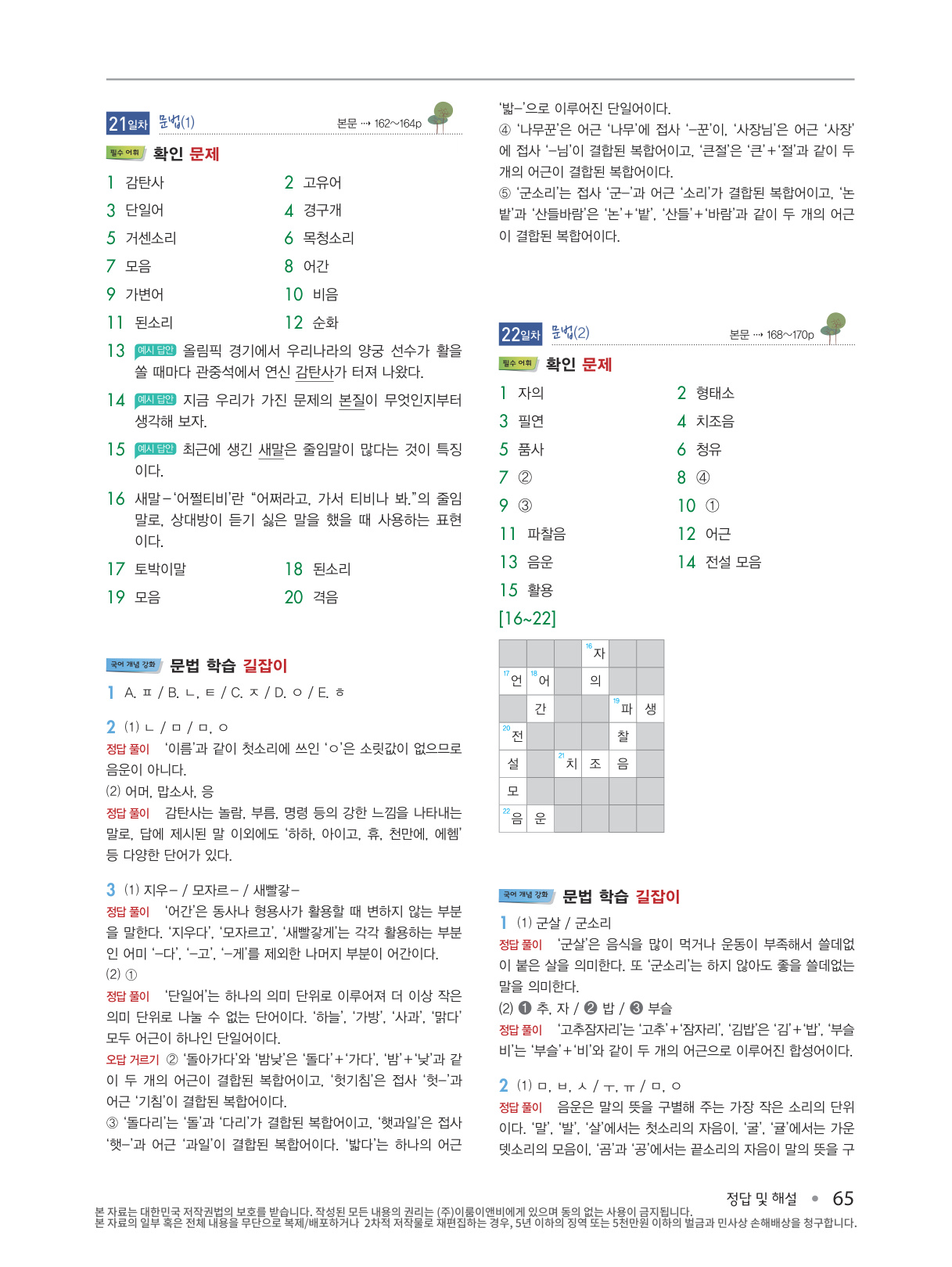 교과서 필수 어휘에서 공부한 표제어를 확인 문제를 통해 반복하여 학습할 수 있습니다. 괄호 넣기, 빈칸 채우기, 줄 긋기, 십자말풀이, 말 상자에서 단어 찾기 등 다양한 유형으로 구성하여, 국어 과목에 흥미를 가질 수 있도록 하였습니다.