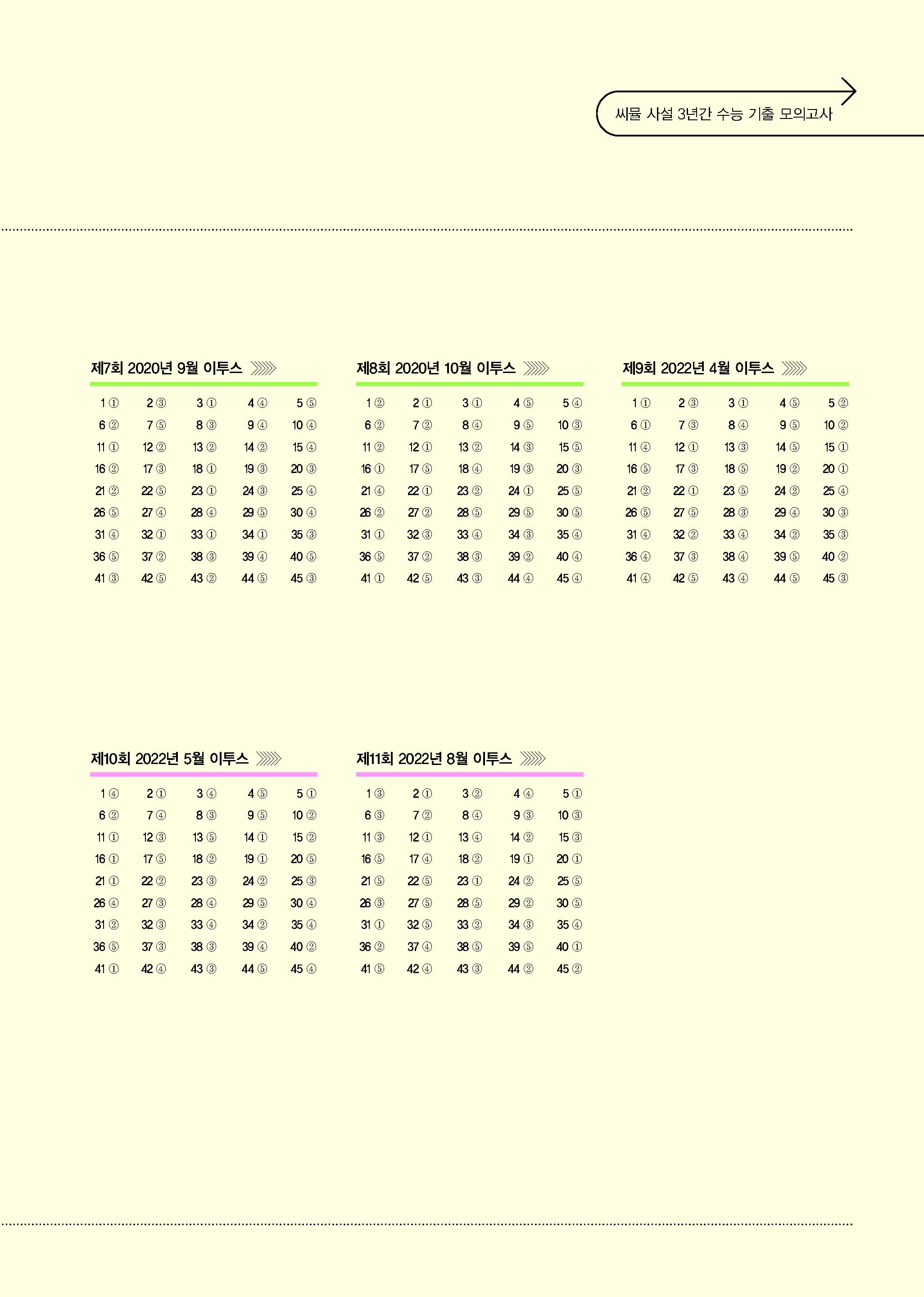 총 11회의 종로, 이투스 실전 모의고사를 반복해 풀며 실전에 대한 적응력을 높일 수 있다. 씨뮬 모의고사는 실제 시험지와 가장 유사한 크기와 느낌을 그대로 살려, 수험생이 실전과 같은 상황에서 테스트에 임할 수 있도록 구성했다. OMR 카드에 정답을 마킹하는 것도 시험의 일부입니다. 효율적으로 시간을 배분하여 문제를 풀이한 후 OMR 카드에 본인이 선택한 답을 직접 기재하는 연습을 평소에 충분히 하는 것이 필요하다. 모의고사 전문 출제 기관의 노하우가 집약된 명쾌하고 충실한 해설을 제시한다. 핵심 내용의 정확한 해설로 오답의 원인과 문제 해결의 포인트를 명쾌하게 짚어 준다. 틀리게 해석하고 넘어갔던 문장들과 왜 틀렸는지 이해할수 없던 문제들을 반드시 확인하여, 모의고사 학습 효과를 100%로 만들어 보자. 빠르고 정확한 독해의 기본은 어휘력이다. 교재에 수록된 모든 모의고사의 단어를 각 회차별, 문항별로 정리한 〈회차별 영단어〉를 휴대하고 다니며, 짜투리 시간을 활용하여 확실히 암기할 때까지 반복해 보자. 단기간에 어휘력이 급상승하는 경험을 하게 될 것이다.