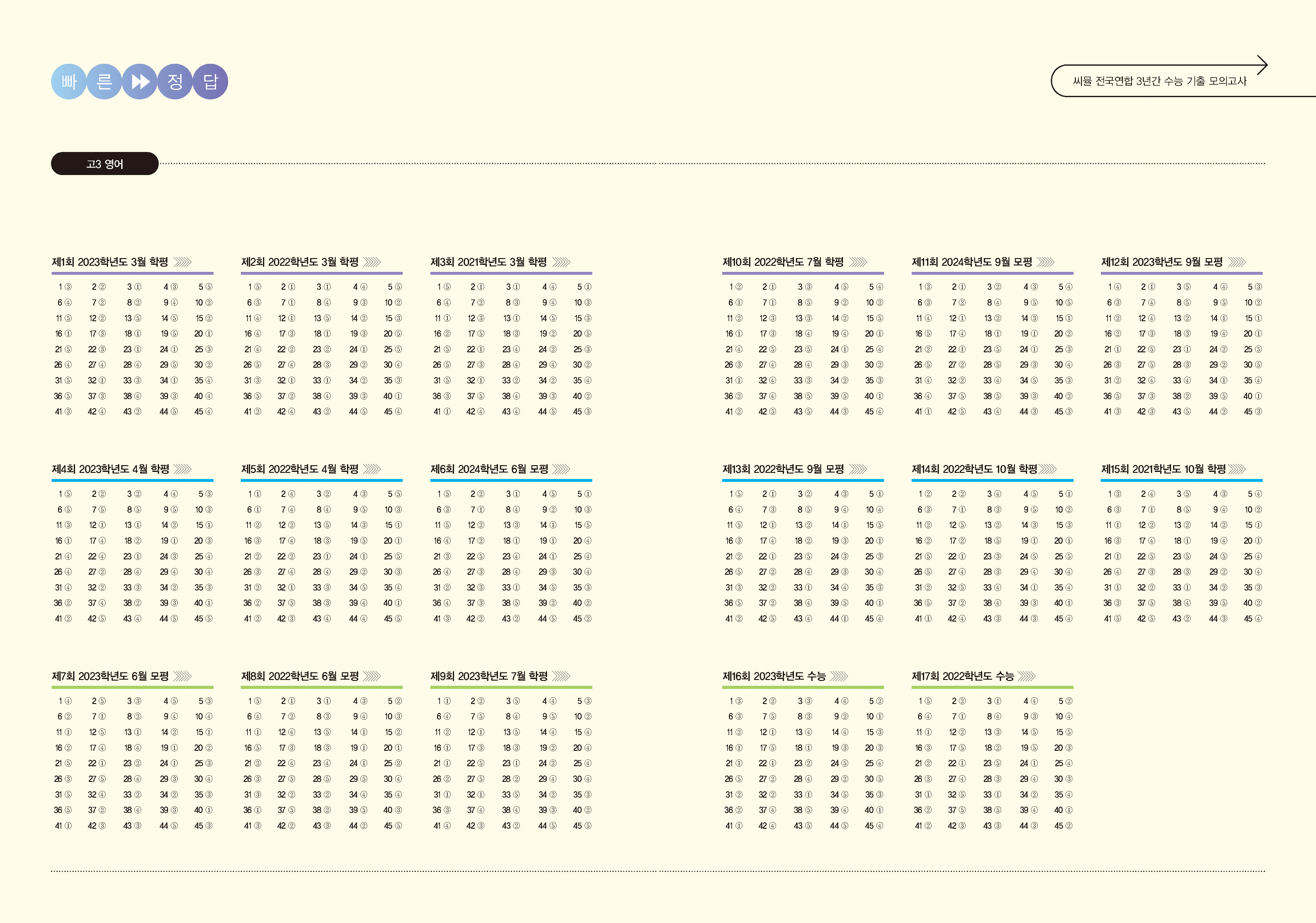 실제 시험지 그대로 실전연습총 17회의 학평, 모평, 수능 실전 모의고사를 제공한다. 씨뮬은 OMR 카드에 마킹하며 실제 시험지의 크기와 느낌을 그대로 살려 마치 시험을 보는 것처럼 학습할 수 있기 때문에 실전 감각을 익히는 데 최적화되어 있다. 각 회차 문제지 끝부분에 위치한 씨뮬 문제 풀기 QR을 스캔하여 정답을 입력하시면, 자동채점 후 온라인 성적 분석 서비스 '스터디센스'에서 최근 수능 데이터를 바탕으로 성적 분석이 진행된다.