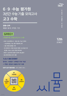 씨뮬은 실제 시험지의 크기와 느낌을 그대로 살려 마치 시험을 보는 것처럼 학습할 수 있기 때문에 실전 감각을 익히는 데 최적화되어 있다. 2025학년도 수능에 대한 실전 적응력을 높이기 위해 최근 3년간 모평·수능 전 회차와 2025수능 대비 특별부록 3회로 구성했으며, 선택 과목인 확률과 통계, 미적분, 기하를 모두 수록했다. 각 회차 문제지 끝부분에 위치한 씨뮬 문제 풀기 QR코드를 찍고 정답을 입력하시면, 자동채점 후 온라인 성적 분석 서비스 ‘스터디센스’에서 최근 수능 데이터를 바탕으로 성적 분석이 진행된다.