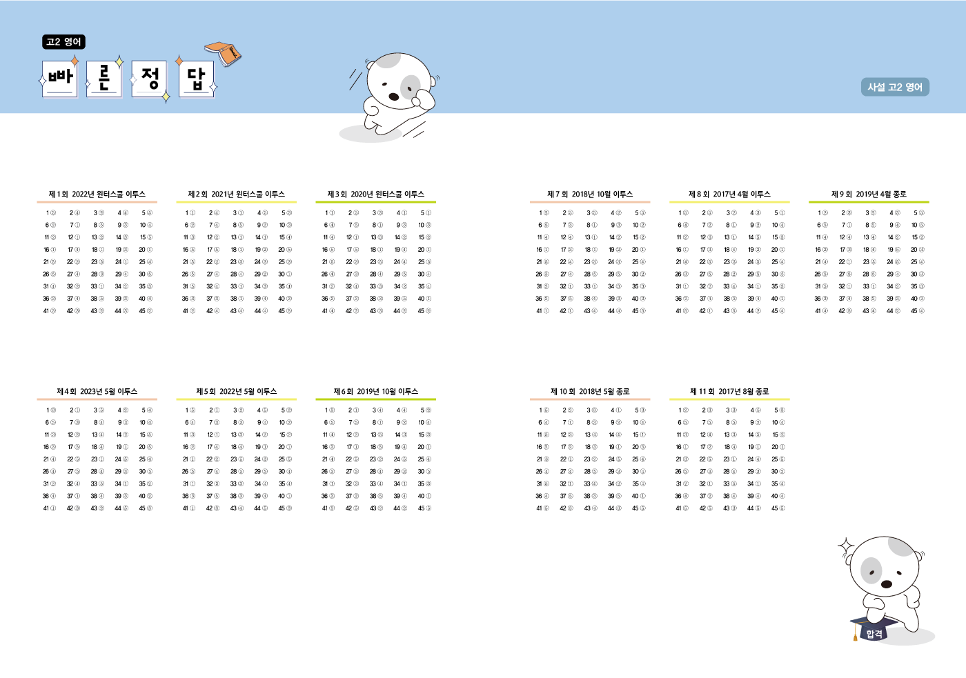 실제 시험 그대로 실전 감각 익히기총 11회의 고2 종로, 이투스 실전 모의고사를 반복해 풀며 실전에 대한 적응력을 높일 수 있다. 씨뮬 모의고사는 실제 시험지와 가장 유사한 크기와 느낌을 그대로 살려, 수험생이 실전과 같은 상황에서 테스트에 임할 수 있도록 구성했다. 문제를 풀이한 후 실전과 같이 OMR 카드에 본인이 선택한 답을 기재하는 연습을 하게 된다.