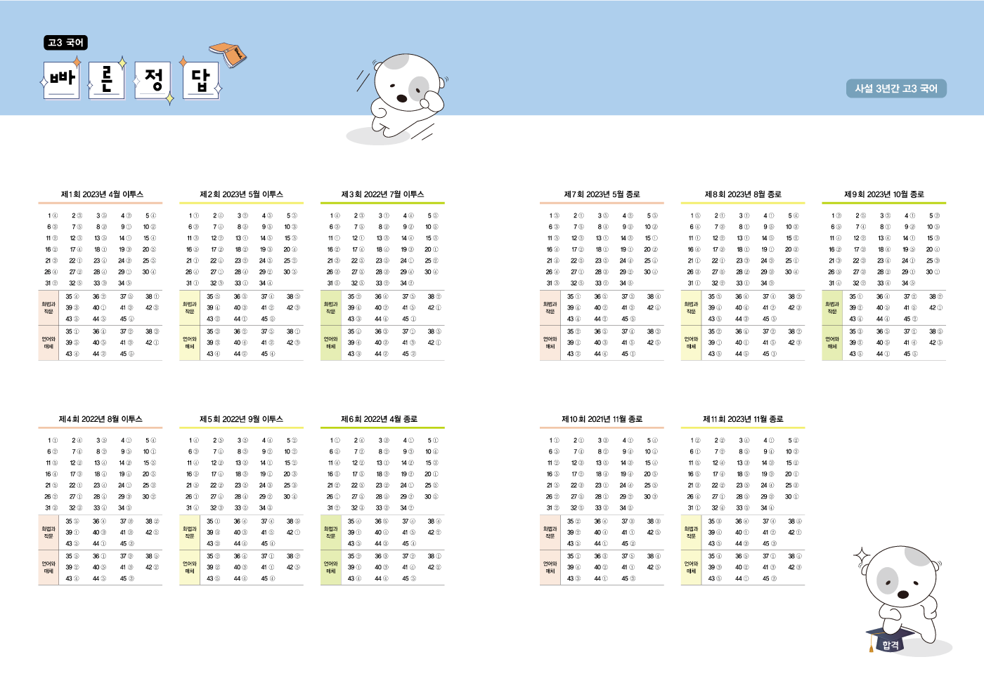 총 11회의 고3 종로·이투스 실전 모의고사를 반복해 풀며 실전에 대한 적응력을 높일 수 있습니다. 씨뮬 모의고사는 실제 시험지와 가장 유사한 크기와 느낌을 그대로 살려, 수험생이 실전과 같은 상황에서 테스트에 임할 수 있도록 구성했습니다. 문제를 풀이한 후 실전과 같이 OMR 카드에 본인이 선택한 답을 기재하는 연습을 하게 됩니다.