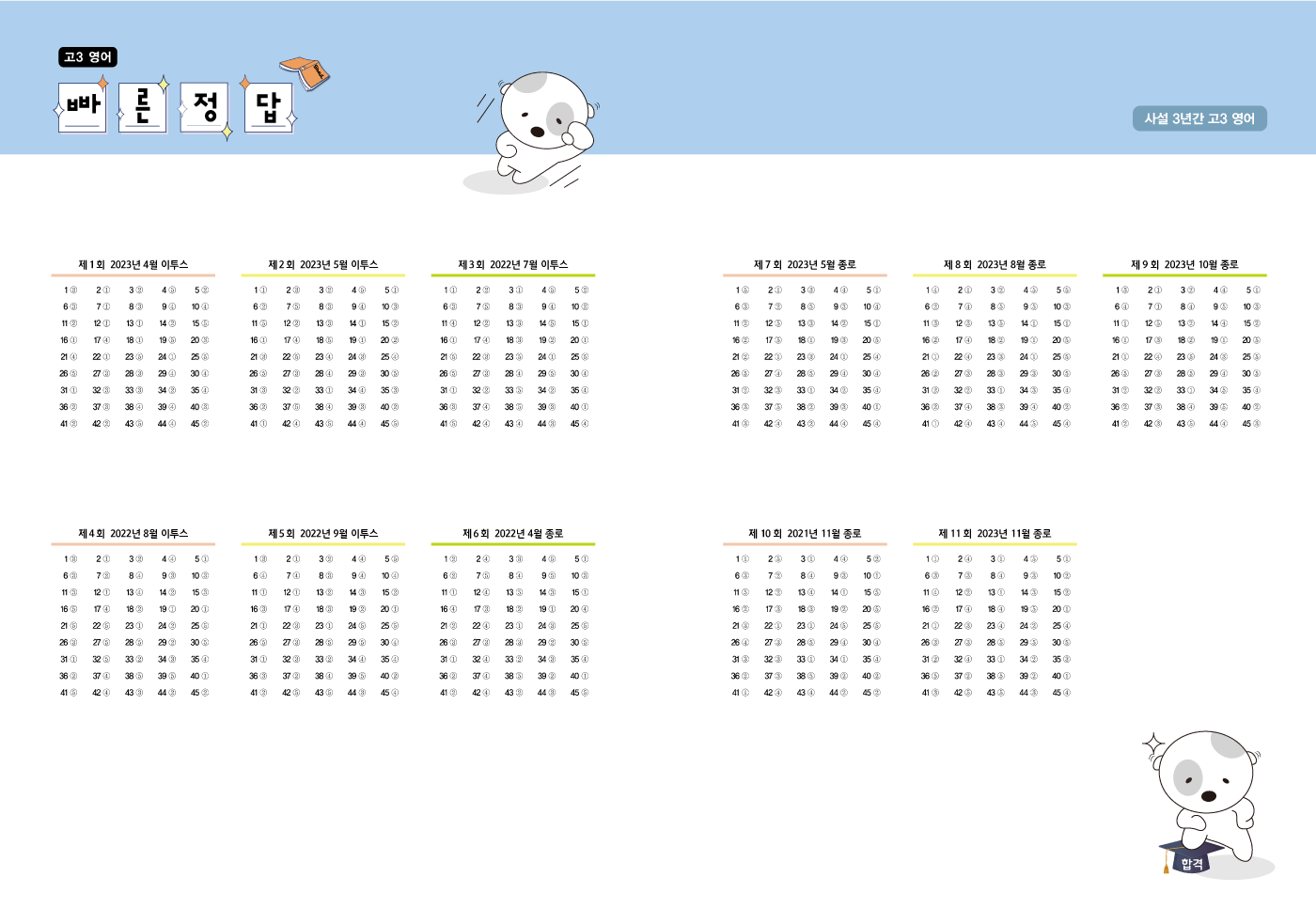 실제 시험 그대로 실전 감각 익히기총 11회의 고3 종로, 이투스 실전 모의고사를 반복해 풀며 실전에 대한 적응력을 높일 수 있다. 씨뮬 모의고사는 실제 시험지와 가장 유사한 크기와 느낌을 그대로 살려, 수험생이 실전과 같은 상황에서 테스트에 임할 수 있도록 구성했다. 문제를 풀이한 후 실전과 같이 OMR 카드에 본인이 선택한 답을 기재하는 연습을 하게 된다.