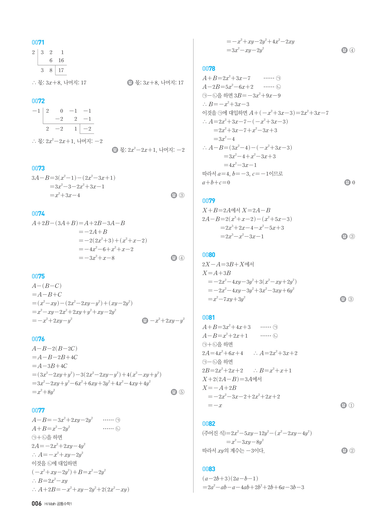 - 교과서의 예제, 연습문제 유형을 모두 수록하였으며, 교과서 기초문항으로 계산력을 충분히 연습할 수 있도록 하였습니다. 최상위권 유형의 문항을 수록하지 않아 학습 부담감은 감소시켰습니다.