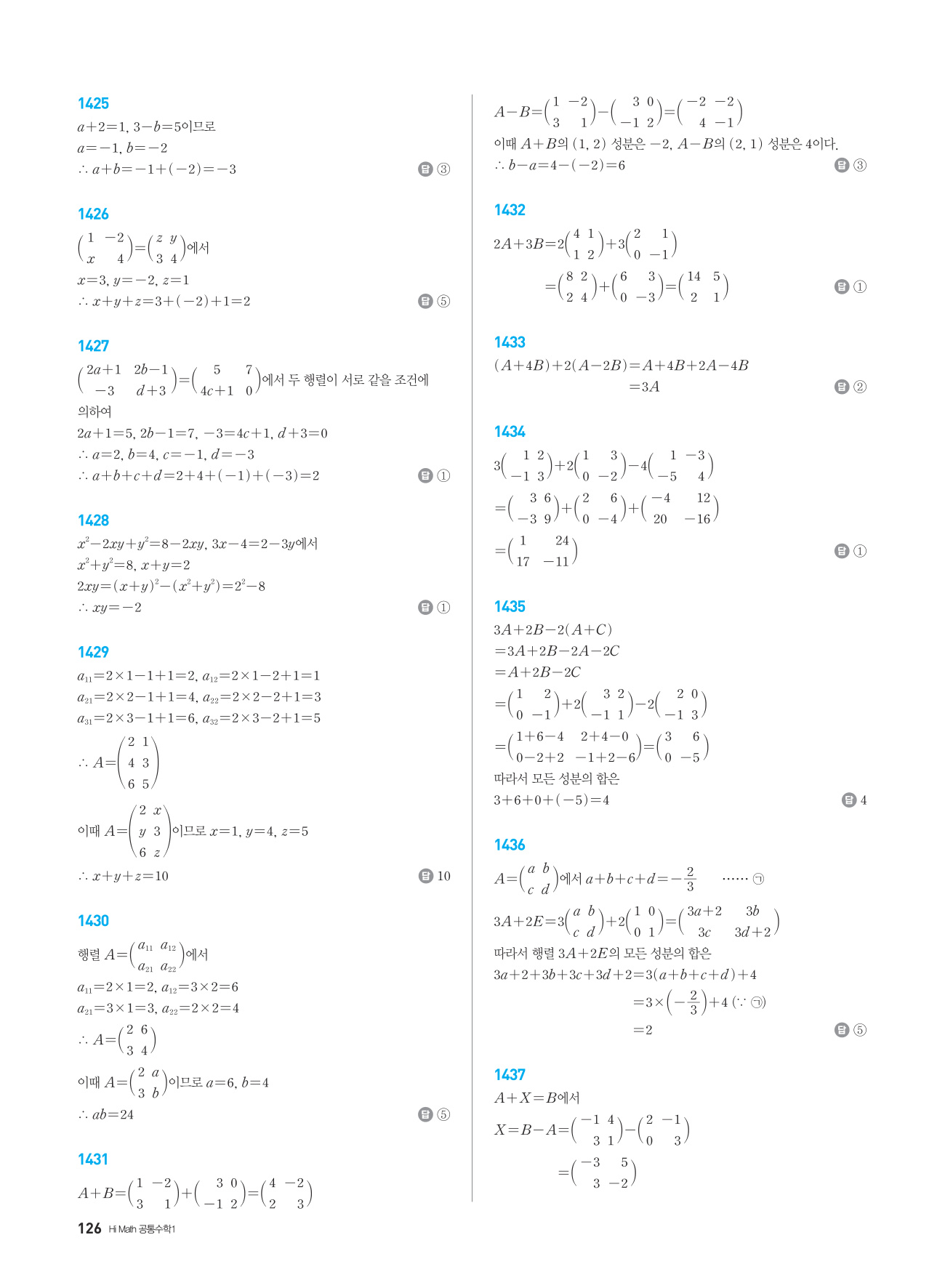 - 내신 1등급 도전을 위해 풀어 보아야 하는 고난도 문제를 선별하여 “1등급 문제” 2문항씩을 수록하였습니다. 오답률이 높거나 어려운 문제들을 풀어 보면서 수학적 사고력을 발전시키고 문제해결능력을 길러, 내신 1등급 도전이 가능하도록 하였습니다.