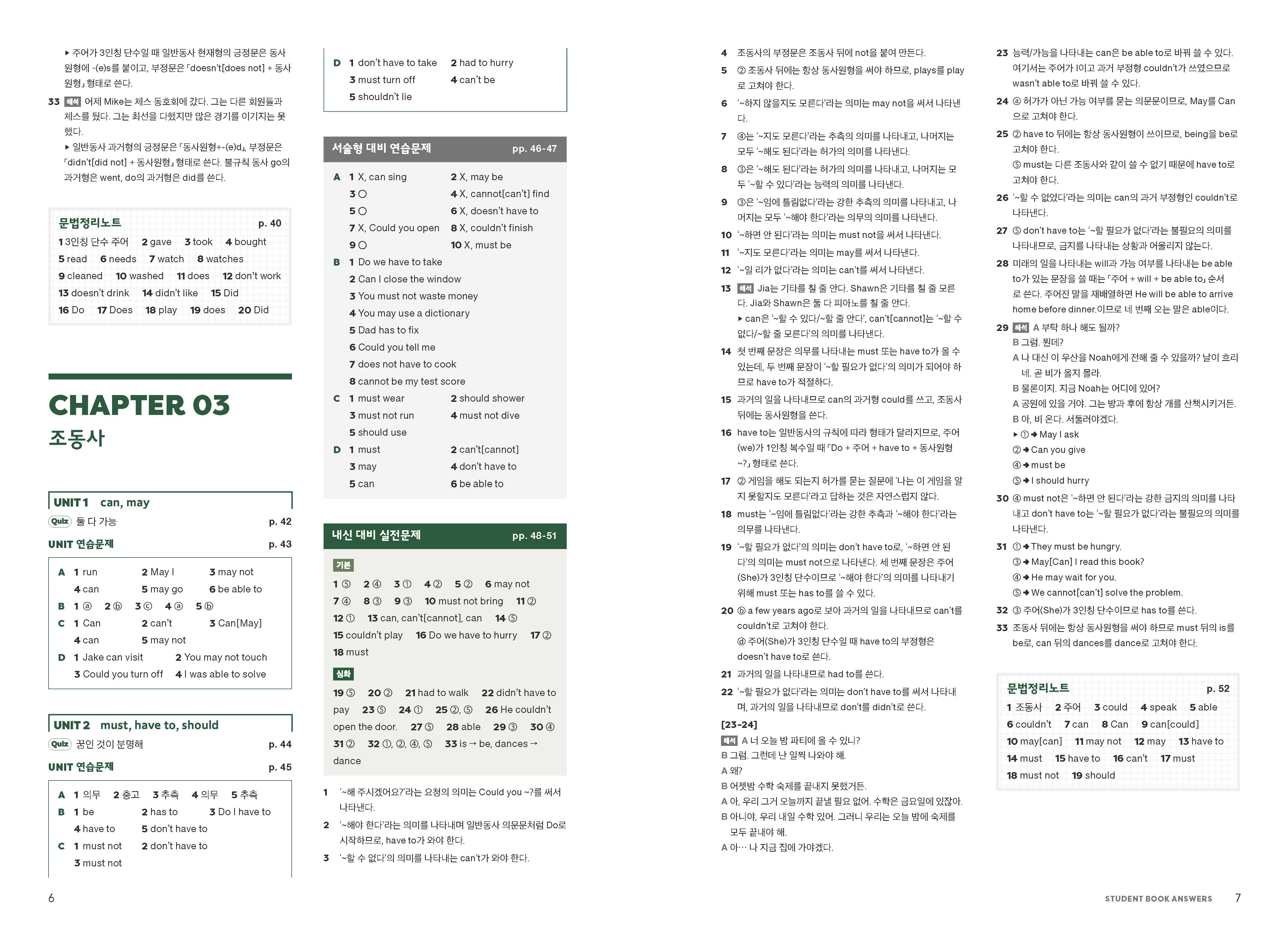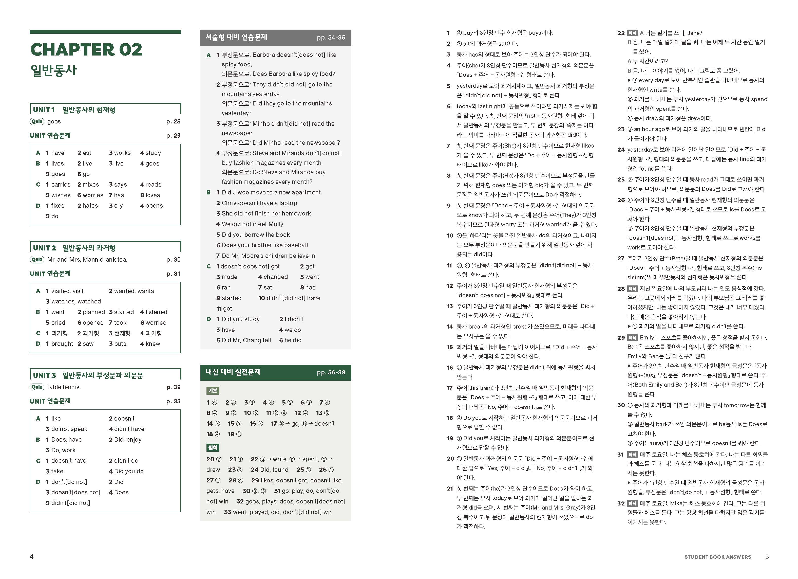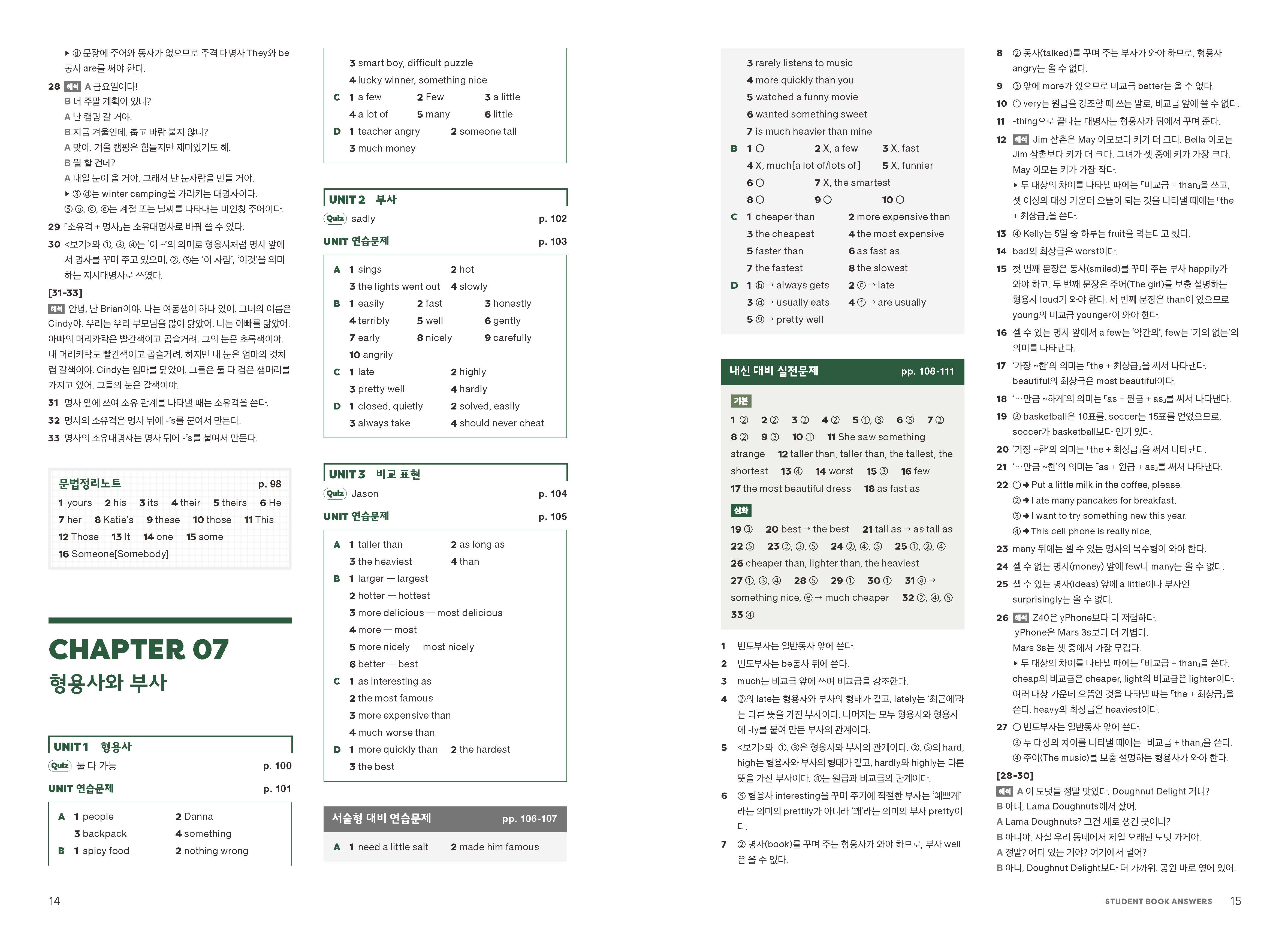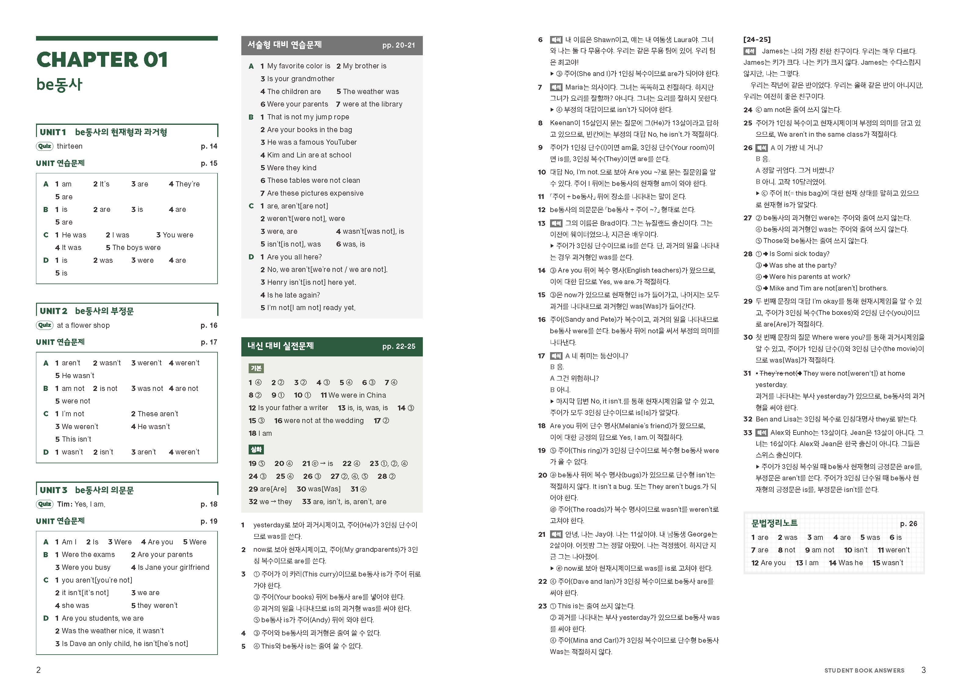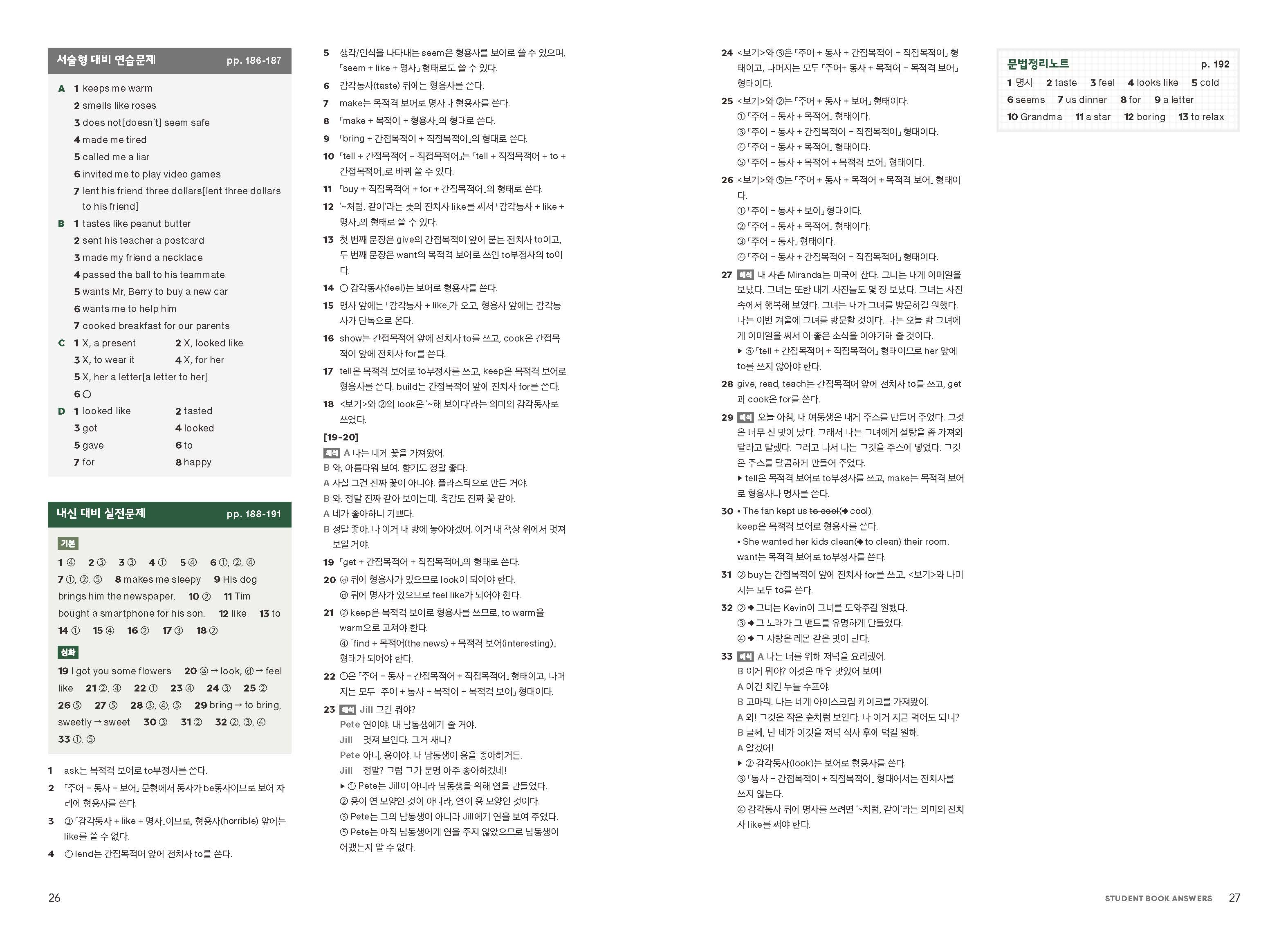 또한 학습한 문법이 문장 속에서 어떻게 쓰이는지 연습해 보는 활동을 통해 중등 서술형 대비가 가능하게 하였으며 더욱 완벽한 시험 대비를 위해 실제 수도권 중학교 내신 문항과 유사한 최신 기출 유형 및 빈출 문항과 더불어 다양한 고난도 유형을 함께 제시하였습니다.