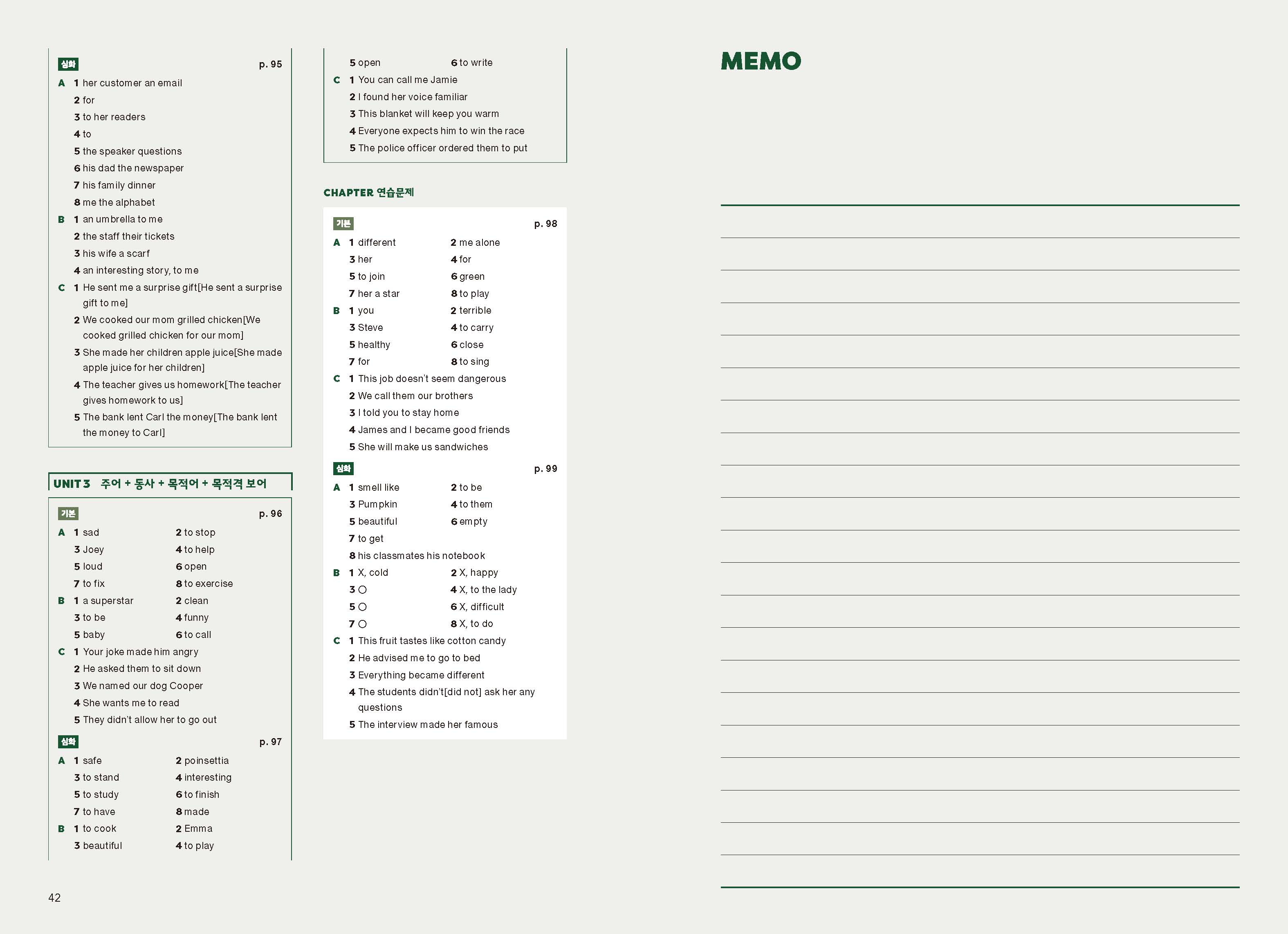 이 외에도 필수 암기 문법 사항을 보충 정리하여 들고 다니며 학습할 수 있는 문법암기노트가 부록으로 포함되어 있습니다.