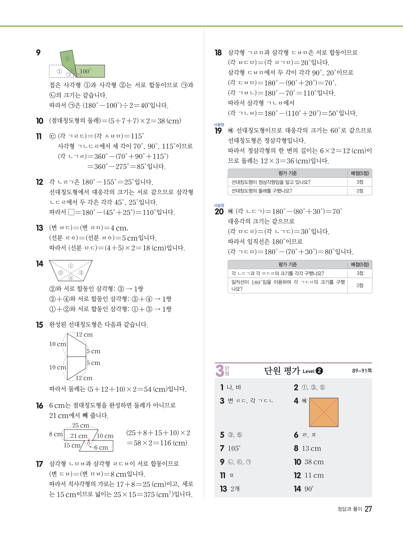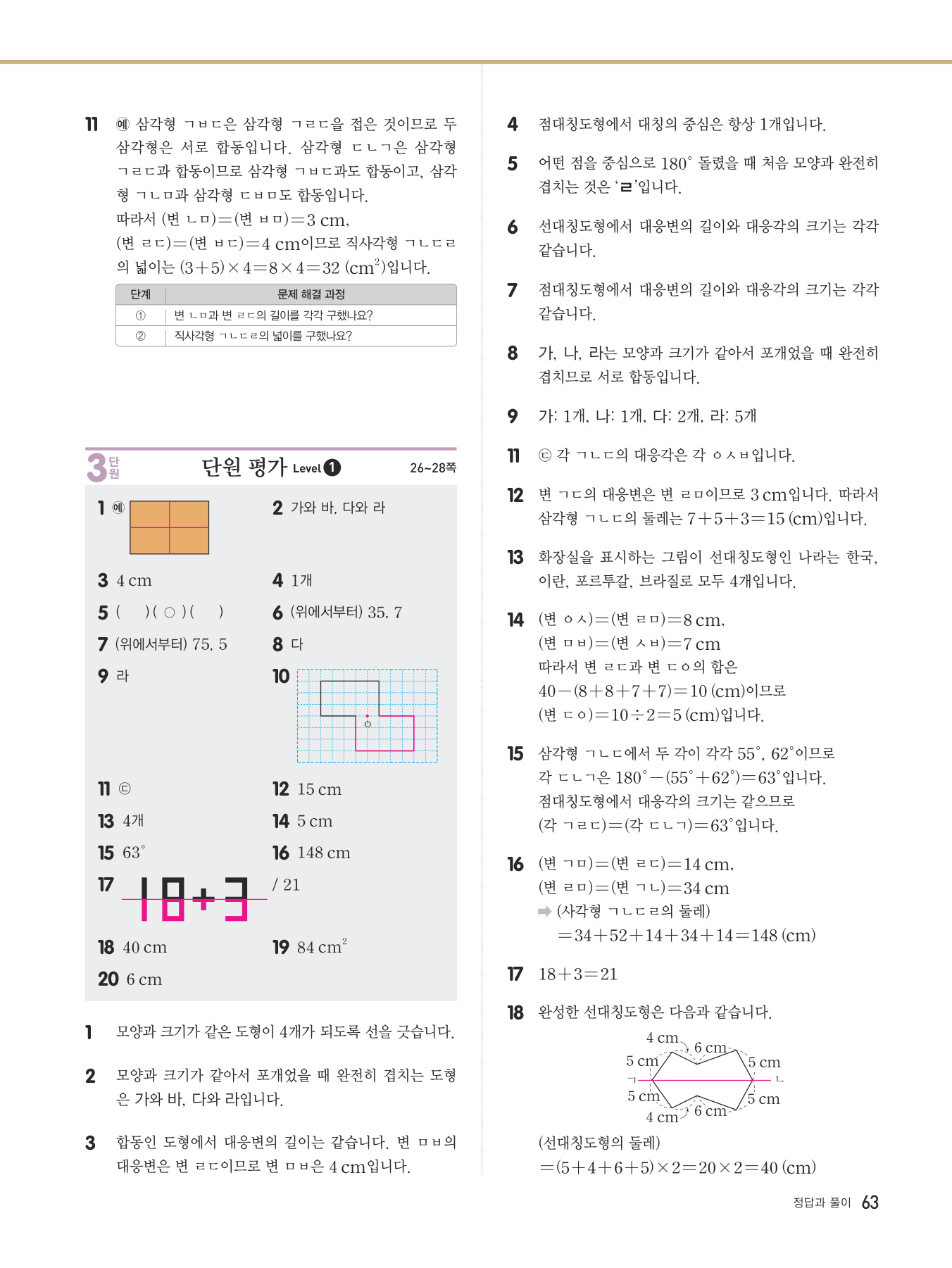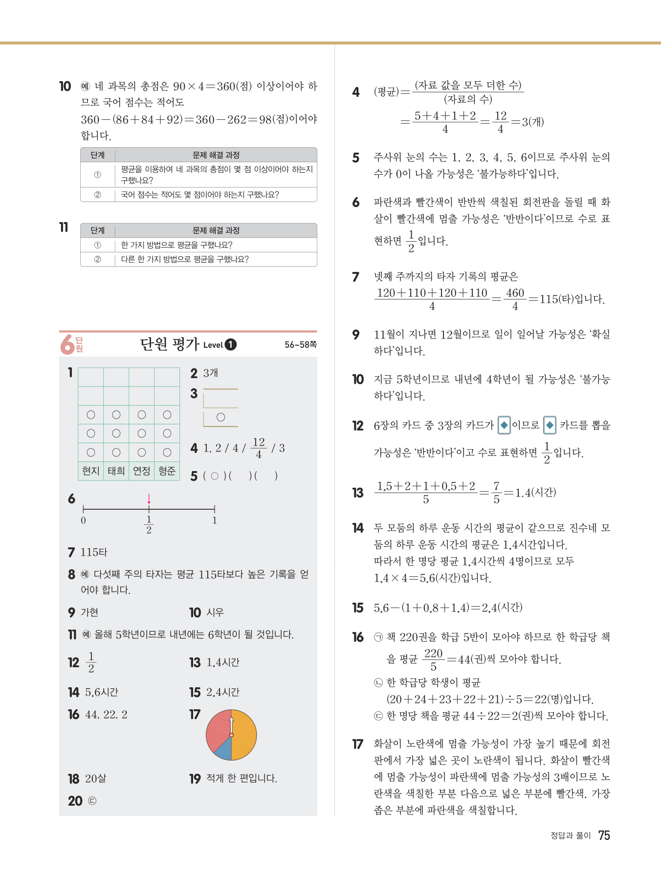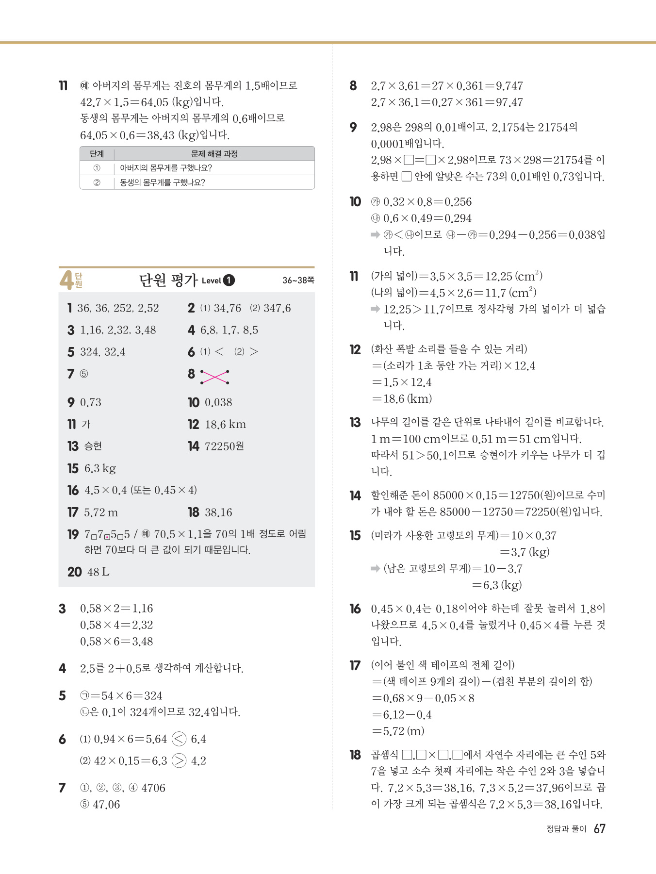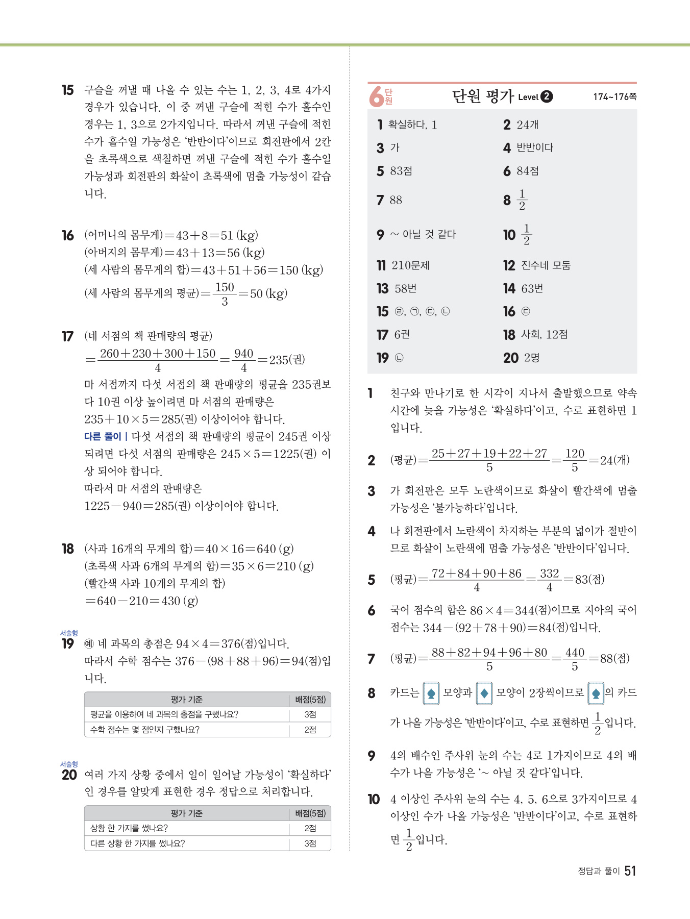 단원 학습을 마무리 할 수 있도록 낮은 수준부터 응용 수준까지의 문제들을 출제하였습니다. 또한 학교 시험에 자주 나오는 문제들을 선별하였으므로 수시평가 및 학교 시험 대비용으로 활용하실 수 있습니다.