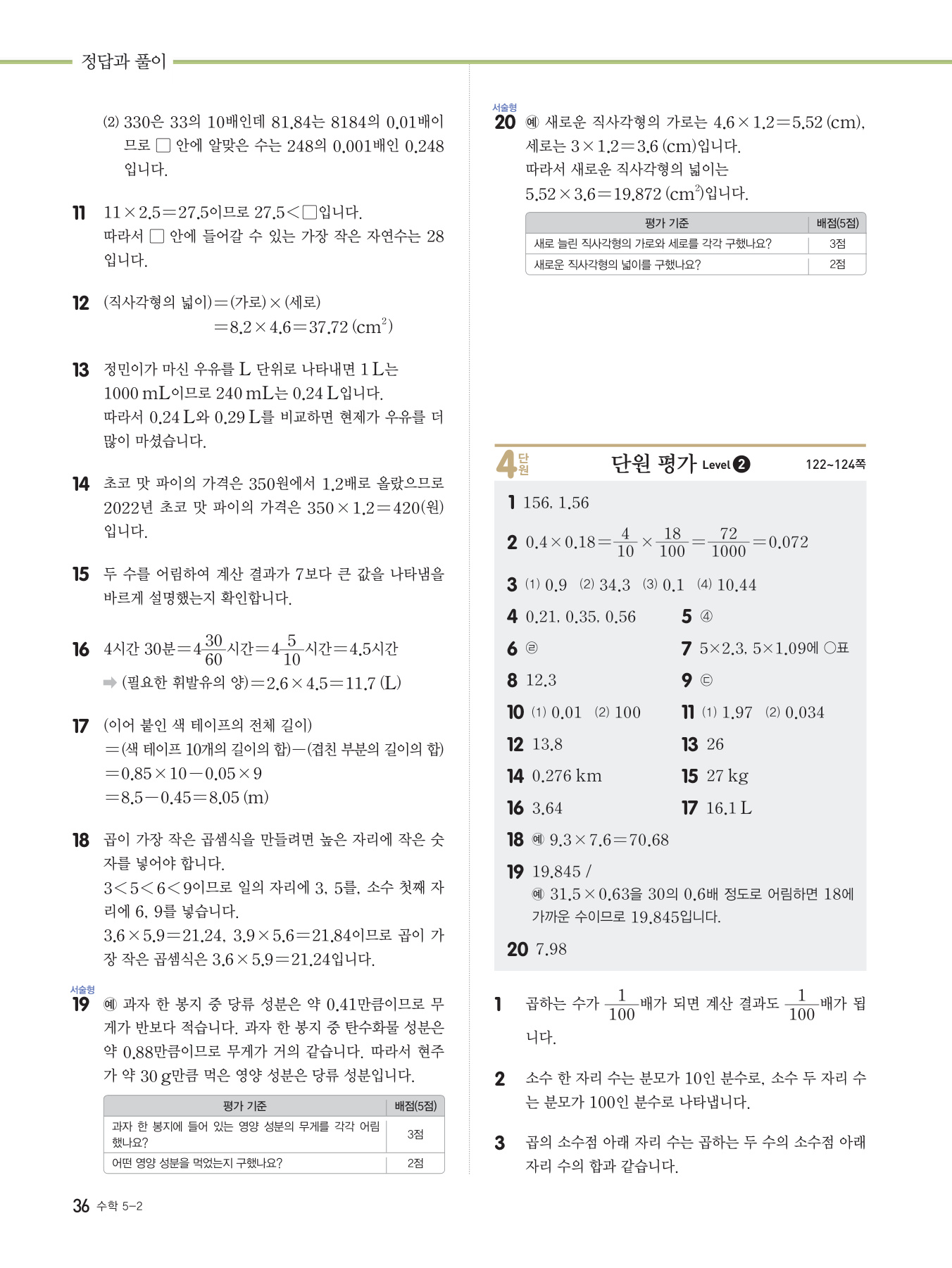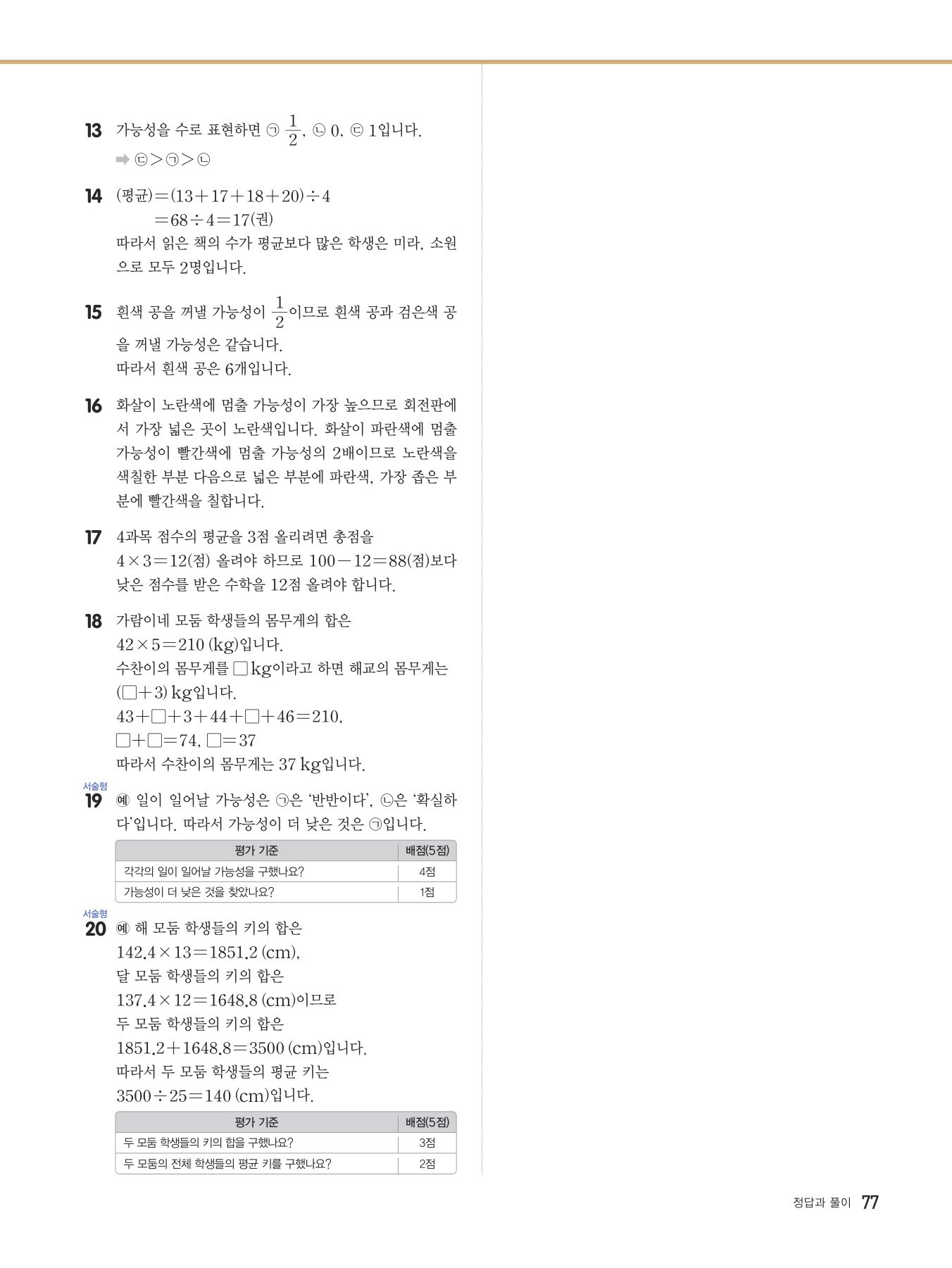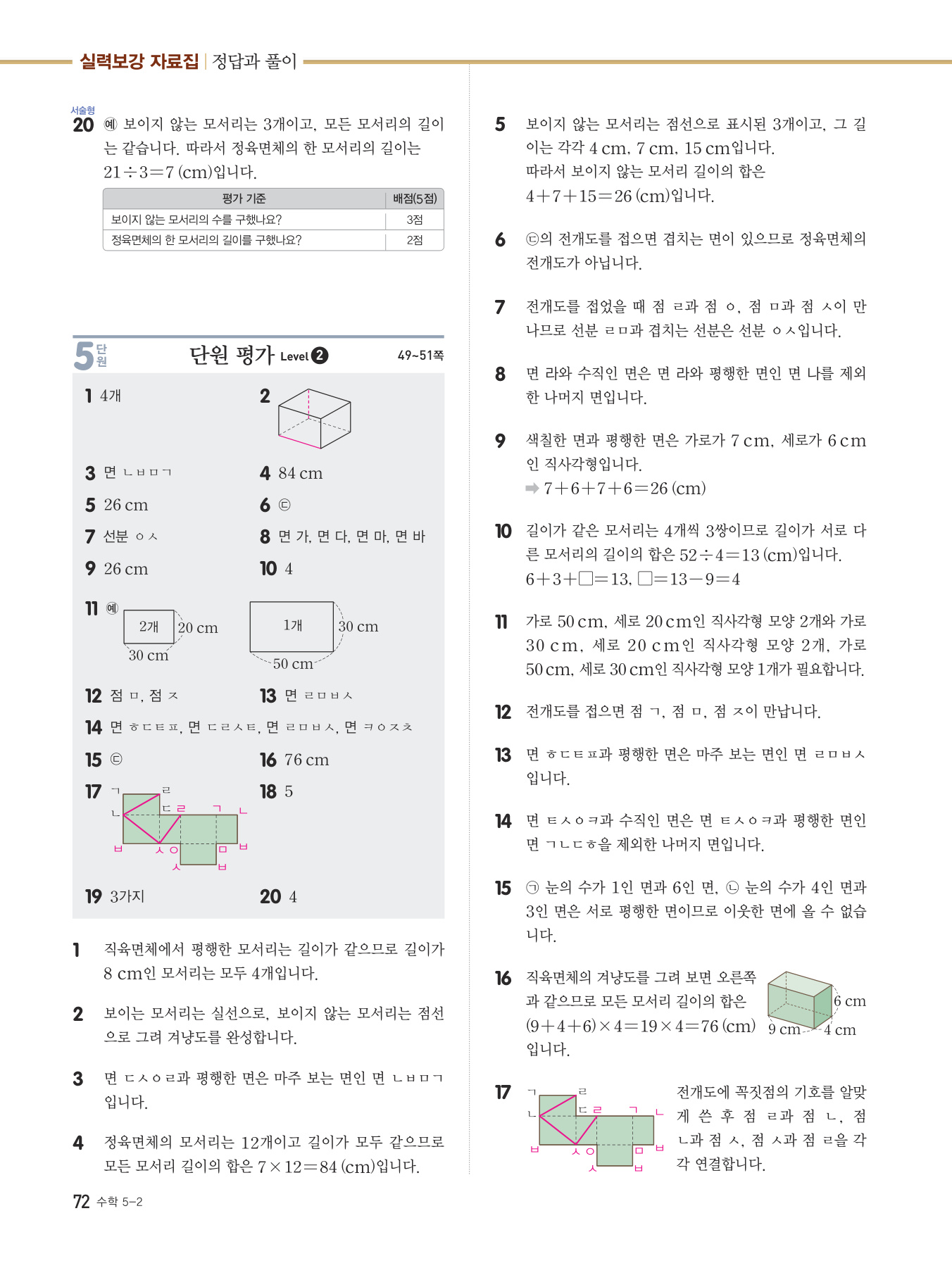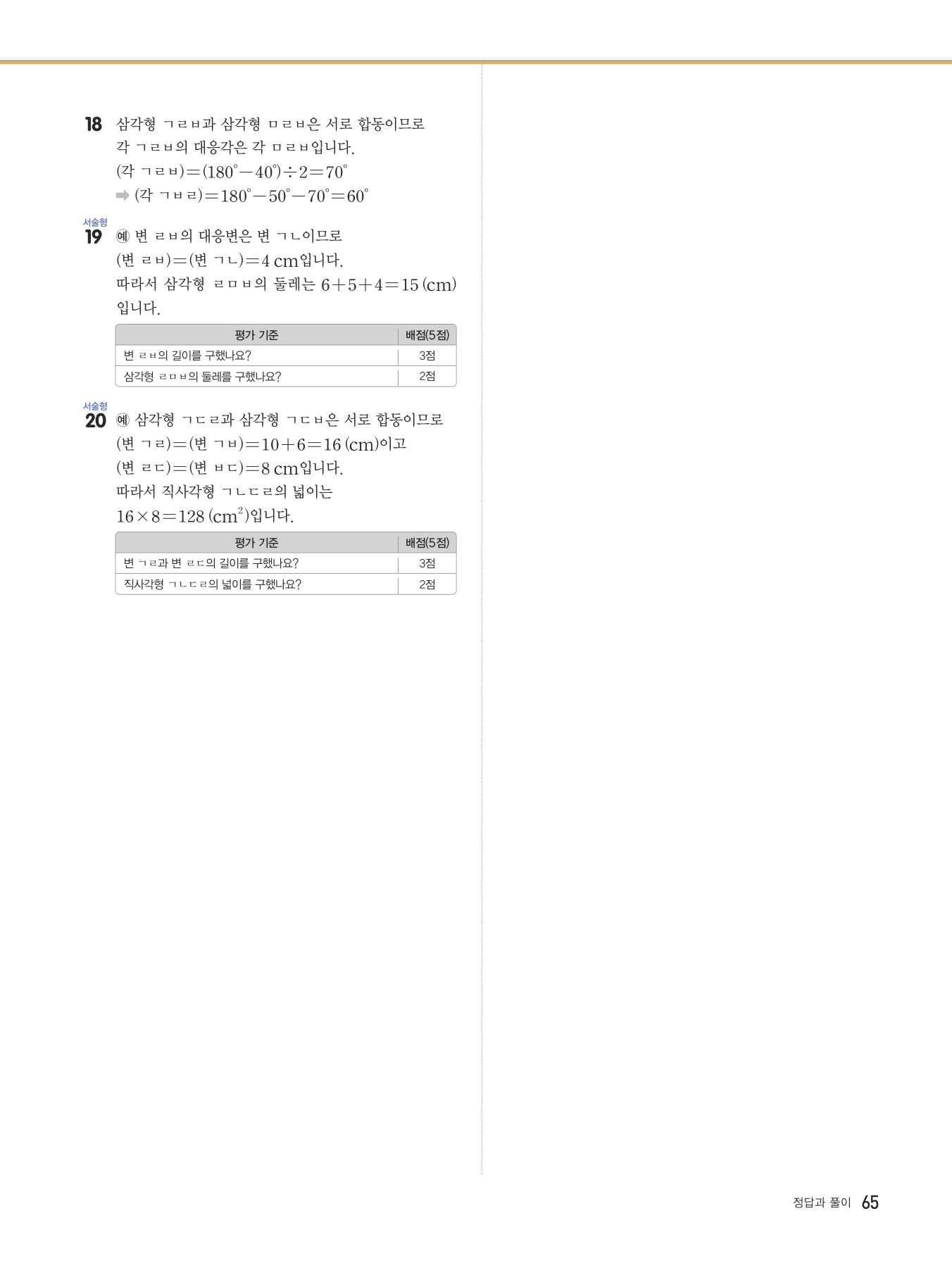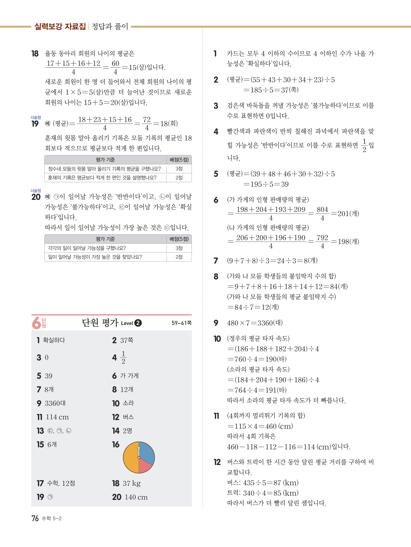 단원 학습을 마무리 할 수 있도록 낮은 수준부터 응용 수준까지의 문제들을 출제하였습니다. 또한 학교 시험에 자주 나오는 문제들을 선별하였으므로 수시평가 및 학교 시험 대비용으로 활용하실 수 있습니다.