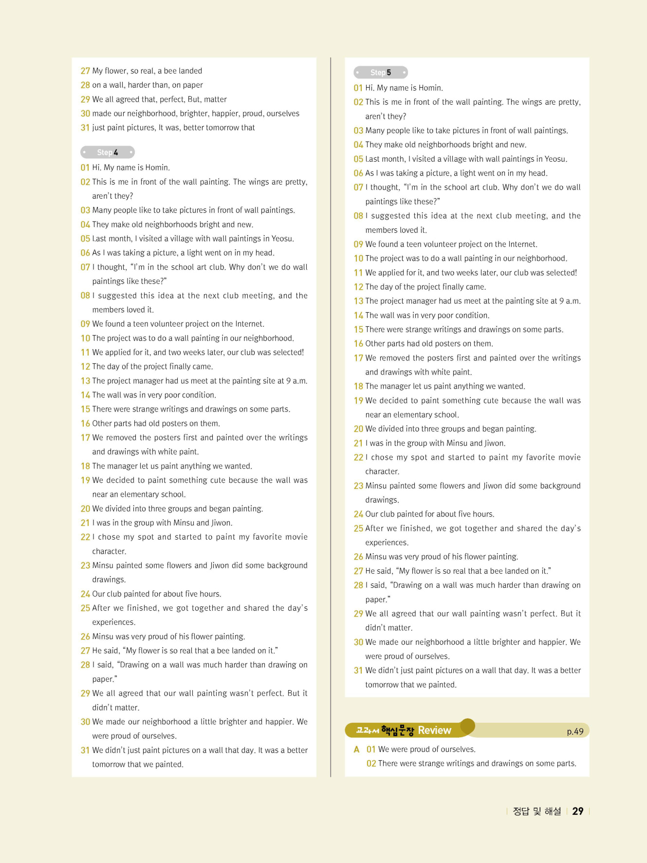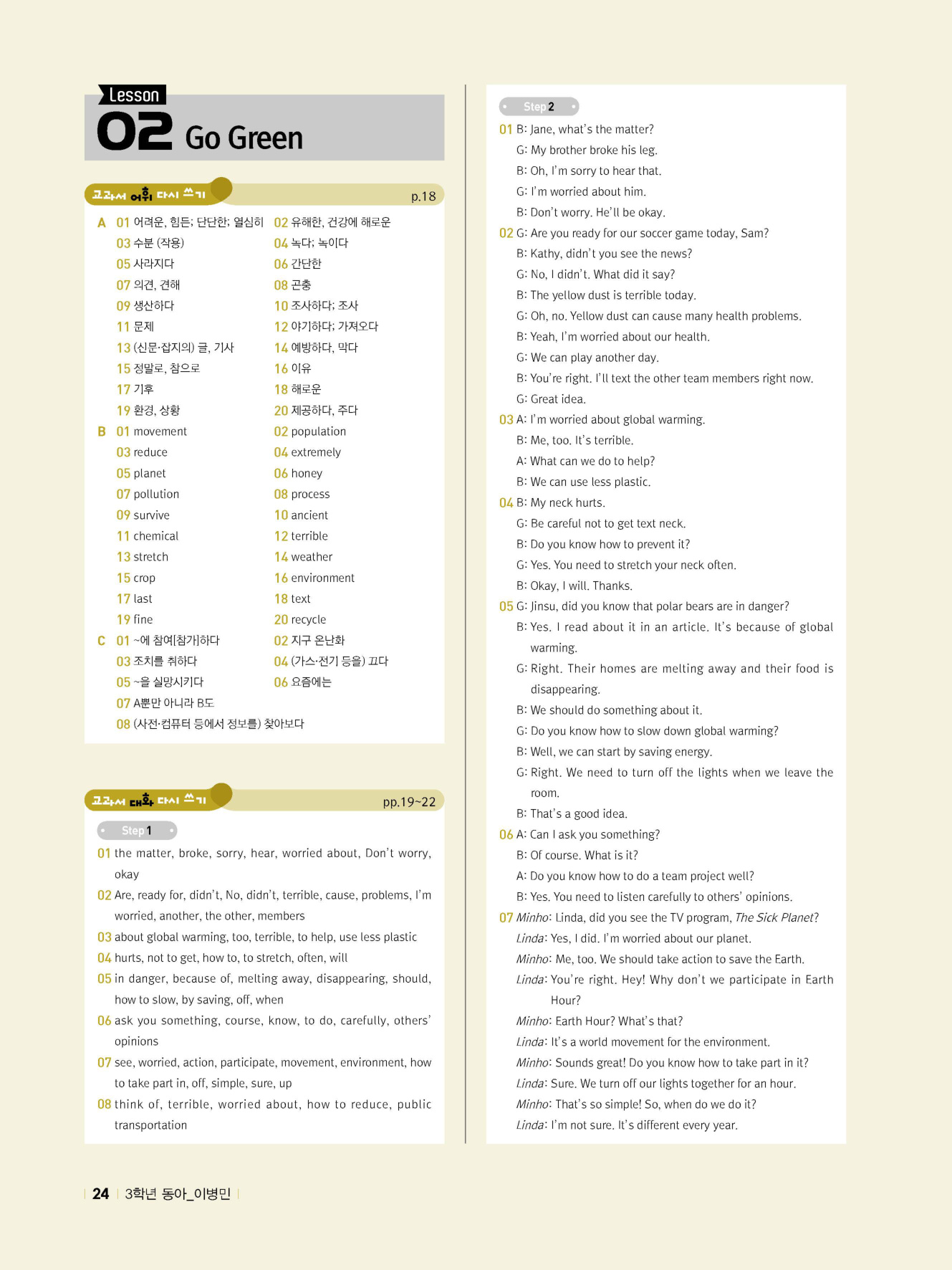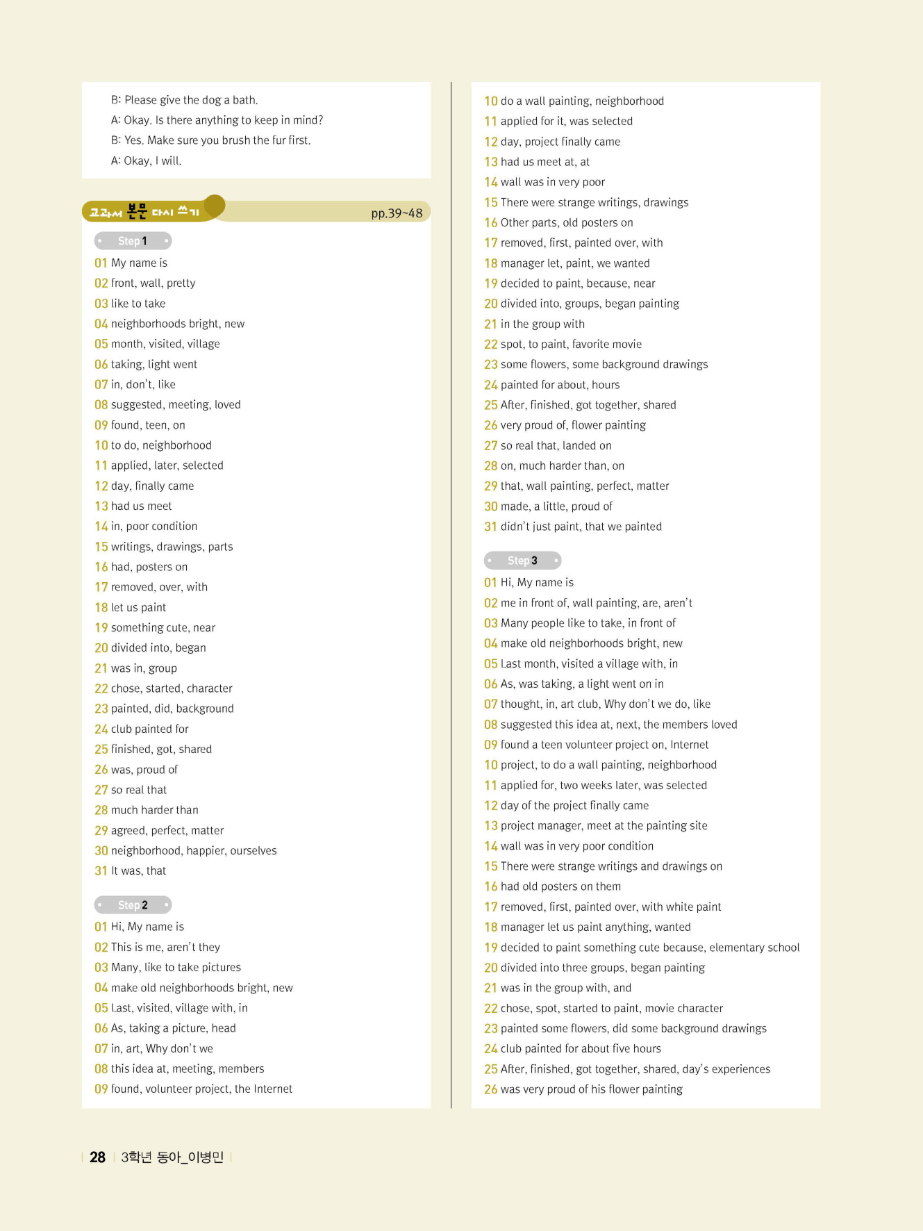 - 교과서 어휘 및 표현, 대화 2단계, 본문 5단계의 단계별 쓰기 강화 훈련 수록