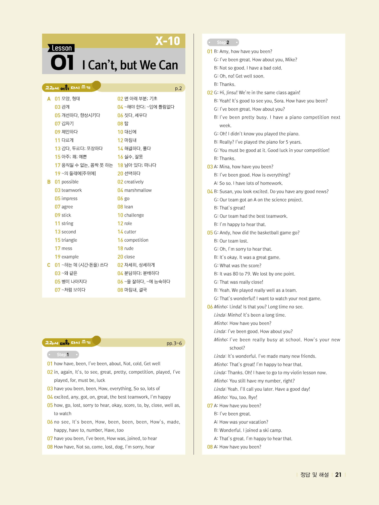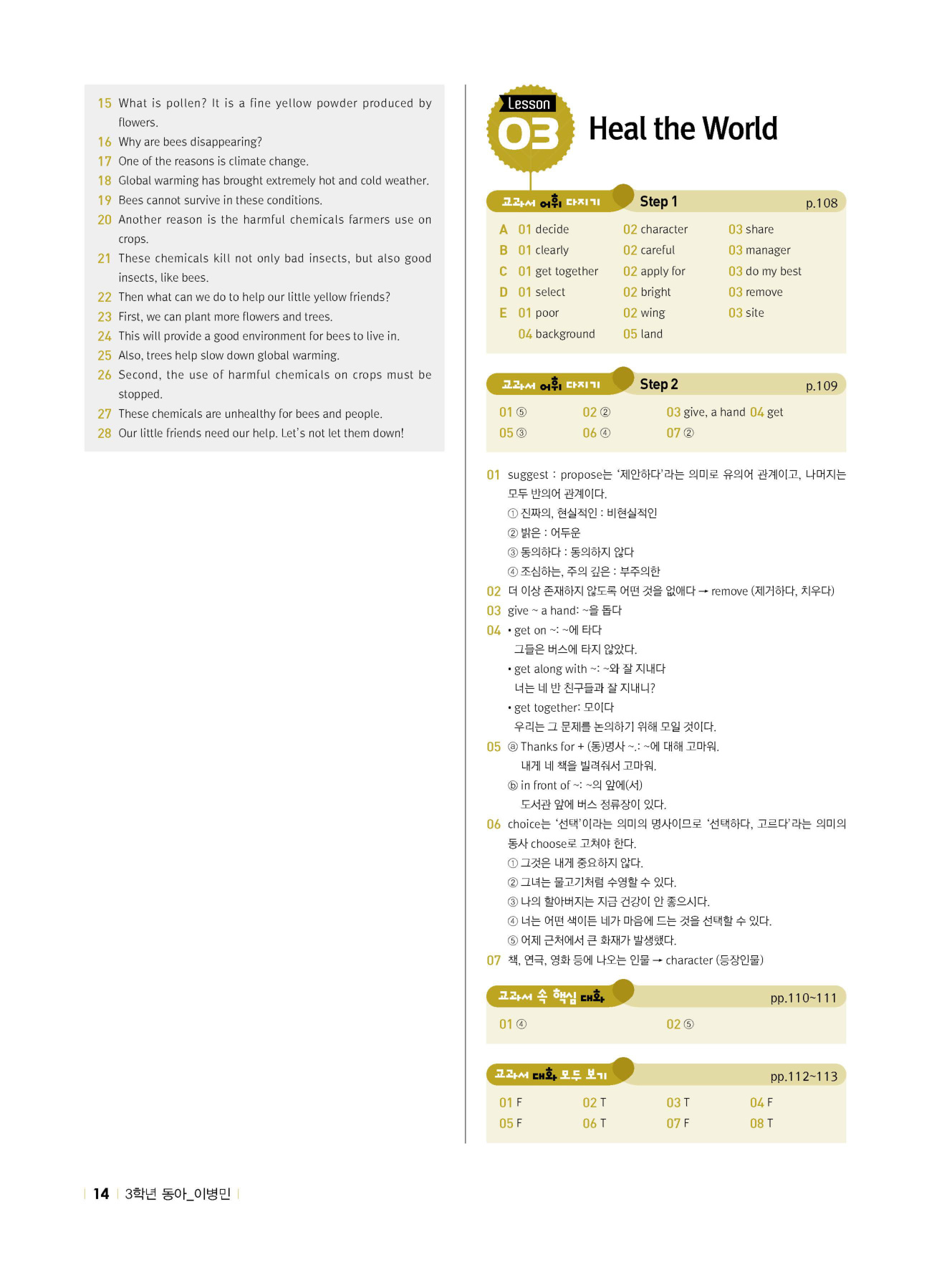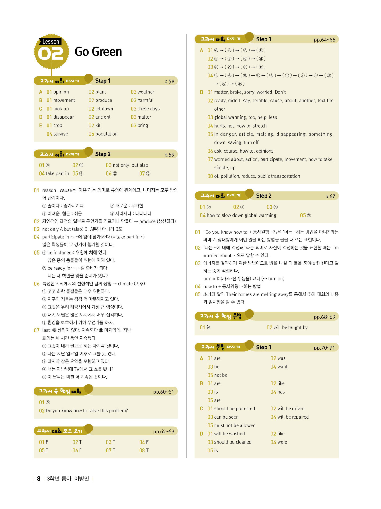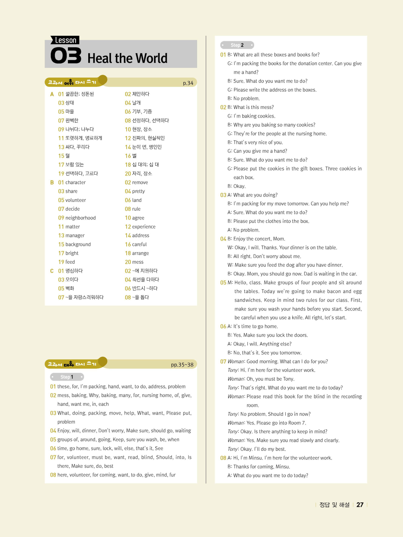 - 교과서 어휘 및 표현, 대화 2단계, 본문 5단계의 단계별 쓰기 강화 훈련 수록